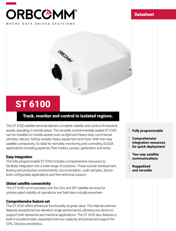 | ไฮไลท์ | The ST 6100 satellite terminal delivers complete visibility and control of industrial assets operating in remote areas. The versatile, environmentally sealed ST 6100 can be installed on mobile assets such as light-and heavy-duty commercial vehicles, railcars, fishing vessels, heavy equipment and more. With two-way satellite connectivity, it’s ideal for remotely monitoring and controlling SCADA applications including pipelines, flow meters, pumps, generators and tanks. |
