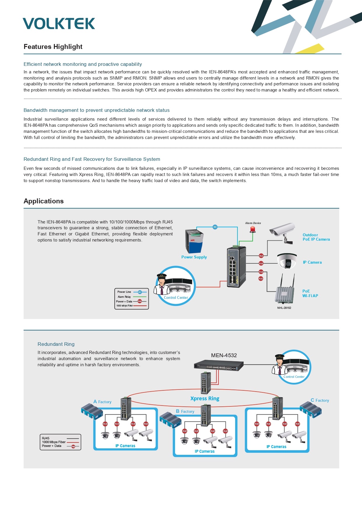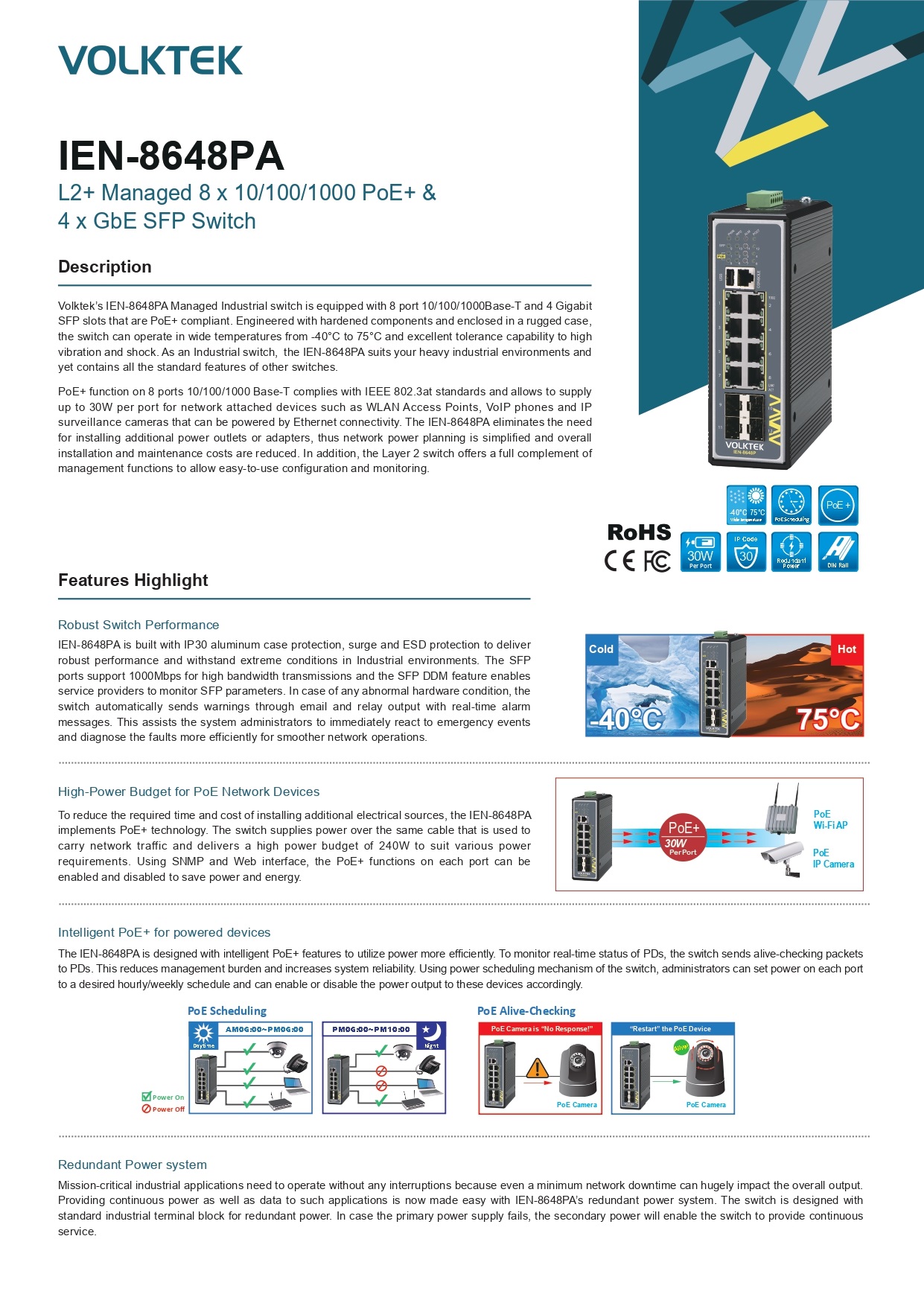 | ไฮไลท์ | IEN-8648PA is a high-performance managed 8-port 10/100/1000 GbE PoE+ downlink and 4 GbE SFP uplink switch mainly designed for surveillance applications with remote and fast management. This industrial grade managed PoE+ switch features 8-port PSE (power sourcing equipment) ports to control all remote powered devices (PDs) with the help of automated features controlled from the web browser. The SFP ports offer long-distance, noise-free fiber transmissions. The RJ45 type console port allows outbound network troubleshooting when networks go wrong. The USB port, designed to save configuration files, save system log files, and upgrade firmware, reduces network downtime and operational costs. This device protects the network following safe cybersecurity standards. The network topology map feature allows visualizing the network of connected devices. This switch is built with industrial-grade components, enclosed in IP40 aluminum, to protect the device from tools and hazards. Designed to withstand vibration, shock, free fall, and temperatures ranging from -40℃ to 75℃ (-40°F~167°F). It fits most indoor and outdoor applications. The reset button restores the device to default factory settings if an issue arises after configuration. To ensure reliability the redundant power supply and alarm relay contact on the terminal block ensures non-stop operations and issues alerts if power fails. ______________________________________________________ Product Highlights • 4 x 10/100/1000 PoE+ ports - 30 Watts max. output power/port • 2 x FX/GbE SFP uplink ports for long-distance connectivity to the control center or cascading • Optimizes network performance with Flow Control and QoS • Redundant Power Supply and Alarm Relay Contact on Terminal Block to ensure non-stop operations • Operating temperature -40°C~75°C~ (-40°F~167°F) and IP40 aluminum housing ______________________________________________________ >>> หมายเหตุ : • ราคารวมภาษีมูลค่าเพิ่มแล้ว • กรณีมีสินค้าสต๊อกระยะจัดส่งสินค้าภายใน 3-5 วันทำการ • กรณีสินค้าหมดระยะจัดส่งสินค้าภายใน 4-6 สัปดาห์ • ฟรีค่าบริการจัดส่งสินค้า โดยบริษัทขนส่งเอกชน เช่น ปณ. ด่วน EMS, KEX Express, Flash Express เท่านั้น • สามารถเช็คสต๊อกสินค้าก่อนทำการสั่งซื้อได้ที่ @Line ID : kdnautomation • ลูกค้าตรวจสอบ Spec สินค้าก่อนทำการสั่งซื้อทุกครั้ง กรณีสั่งซื้อแล้วไม่รับเปลี่ยน-คืน ______________________________________________________ >>> ติดต่อสอบถามข้อมูลเพิ่มเติม : • Line Official : kdnautomation • E-Mail: kdnautomation@gmail.com • Tel : 082-550-3096, 02-023-3038 • Website : www.kdnautomation.co.th • เวลาทำการบริษัท วันจันทร์ - วันศุกร์ เวลา 08.00 - 17.00 น. ( หยุดวันนักขัตฤกษ์ ) ______________________________________________________ >>> บริการติดตั้ง : • ทางบริษัทจำหน่ายอุปกรณ์อิเล็กทรอนิกส์ ออกแบบ ติดตั้งและซ่อมแซม ปรับปรุงเครื่องจักรในโรงงานอุตสาหกรรม รวมถึงการให้บริการเขียนโปรแกรม และพัฒนาระบบควบคุมอัตโนมัติแบบครบวงจร ทั้งนี้ลูกค้าสามารถส่งรายละเอียด มาได้ที่ E-mail : kdnautomation@gmail.com เพื่อประเมินราคา |