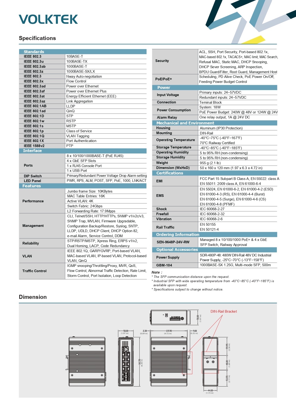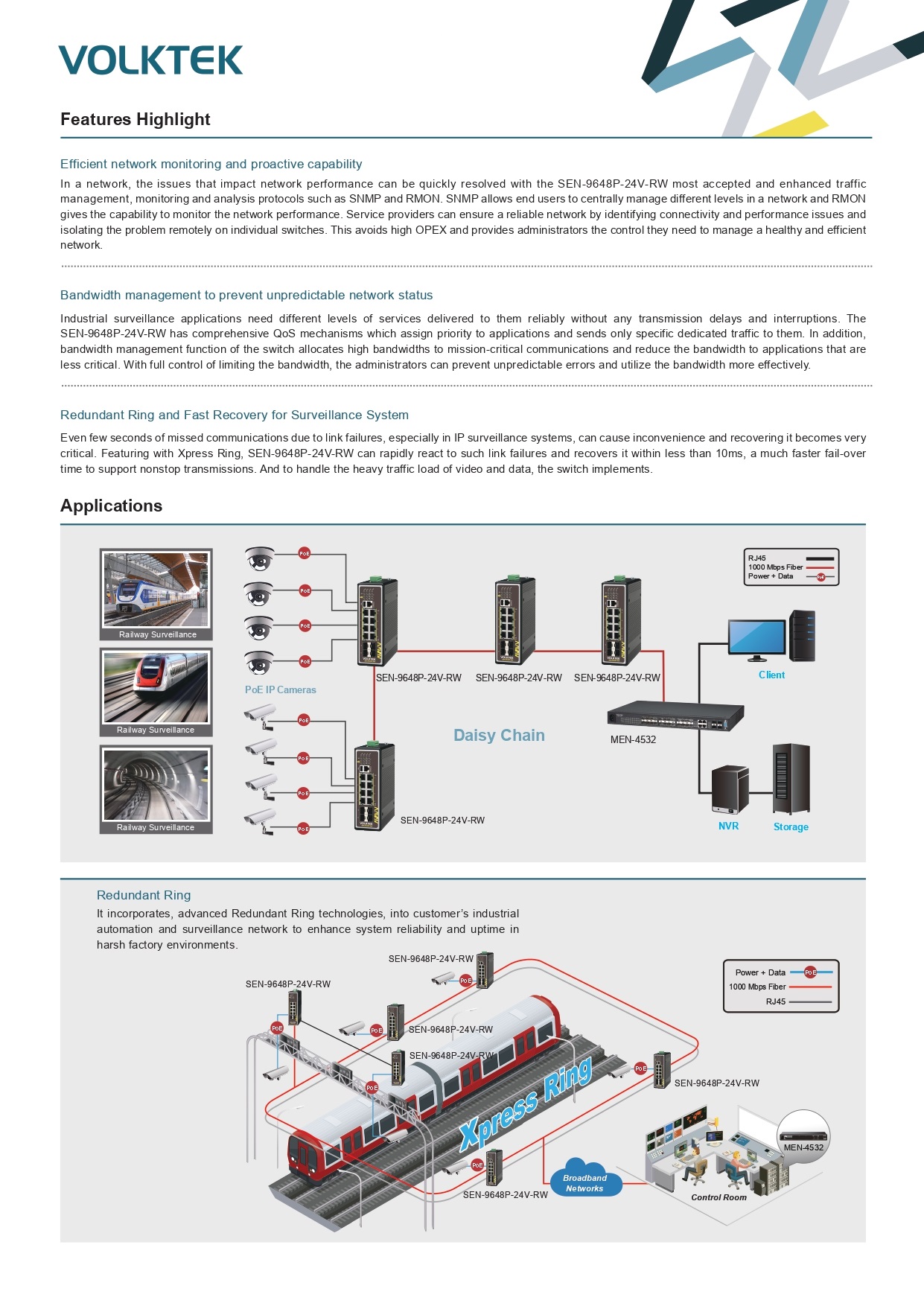 | ไฮไลท์ | SEN-9648P-24V-RW is an 8-port 10/100/1000 PoE+ downlink and 4-port GbE SFP uplink managed industrial-grade switch designed to meet the thermal requirements and environmental conditions of surveillance and WAP Railway applications. This PoE+ switch features up to 8-port PSE (power sourcing equipment) ports with plug and play feature to provide power to all the powered devices (PDs) as soon as they are connected. The fiber ports allow noise-free Gigabit Ethernet transmission for fast recovery, reliable and long-distance to other switches and the control center. The RJ45 type console port allows outbound network troubleshooting when networks go wrong. The USB port, designed to save configuration files, save system log files, and upgrade firmware, reduces network downtime and operational costs. The switch offers various in-built traffic optimization and network performance features to prioritize industrial applications, prevent the loss of data during communication, and assure a stable transmission. The switch includes a topology map compatible with third-party devices to monitor the network. This device complies with cybersecurity standards to safeguard the network from vulnerabilities and protect your assets. This switch is built with industrial-grade components, enclosed in an IP30 aluminum case with high thermal conductivity to protect the device from tools and hazards. The wide input power range from 24V to 57V enables the device to operate in many railway applications without extra power outlet installation needed. To ensure reliability the redundant power supply and alarm relay contact on the terminal block ensures non-stop operations and issues alerts if power fails. Designed to withstand vibration, shock, free fall, and temperatures ranging from -40°C~75°C (-40°F~167°F) it suits places like tunnels. ______________________________________________________ Product Highlights • 8 x 10/100/1000 PoE+ ports - 30 Watts max. output power/port • 4 x GbE SFP uplink ports for long-distance connectivity to control center and cascading • 1 x Console Port for command-line interface and USB port supports firmware upgrade, keeps configuration settings safe, and downloads log files • It prioritizes transmission for industrial applications using EIP (EtherNet/IP), PROFINET, and GOOSE packets • Wide input power range (24 to 57V DC) suits different environments • Railway Approval EN 50155, EN 50121-4, EN 61373 Certifications, communication standards for safe and reliable railway operations • Operating temperatures-40°C~75°C (-40°F~167°F) and IP30 Aluminum housing ______________________________________________________ >>> หมายเหตุ : • ราคารวมภาษีมูลค่าเพิ่มแล้ว • กรณีมีสินค้าสต๊อกระยะจัดส่งสินค้าภายใน 3-5 วันทำการ • กรณีสินค้าหมดระยะจัดส่งสินค้าภายใน 4-6 สัปดาห์ • ฟรีค่าบริการจัดส่งสินค้า โดยบริษัทขนส่งเอกชน เช่น ปณ. ด่วน EMS, KEX Express, Flash Express เท่านั้น • สามารถเช็คสต๊อกสินค้าก่อนทำการสั่งซื้อได้ที่ @Line ID : kdnautomation • ลูกค้าตรวจสอบ Spec สินค้าก่อนทำการสั่งซื้อทุกครั้ง กรณีสั่งซื้อแล้วไม่รับเปลี่ยน-คืน ______________________________________________________ >>> ติดต่อสอบถามข้อมูลเพิ่มเติม : • Line Official : kdnautomation • E-Mail: kdnautomation@gmail.com • Tel : 082-550-3096, 02-023-3038 • Website : www.kdnautomation.co.th • เวลาทำการบริษัท วันจันทร์ - วันศุกร์ เวลา 08.00 - 17.00 น. ( หยุดวันนักขัตฤกษ์ ) ______________________________________________________ >>> บริการติดตั้ง : • ทางบริษัทจำหน่ายอุปกรณ์อิเล็กทรอนิกส์ ออกแบบ ติดตั้งและซ่อมแซม ปรับปรุงเครื่องจักรในโรงงานอุตสาหกรรม รวมถึงการให้บริการเขียนโปรแกรม และพัฒนาระบบควบคุมอัตโนมัติแบบครบวงจร ทั้งนี้ลูกค้าสามารถส่งรายละเอียด มาได้ที่ E-mail : kdnautomation@gmail.com เพื่อประเมินราคา |