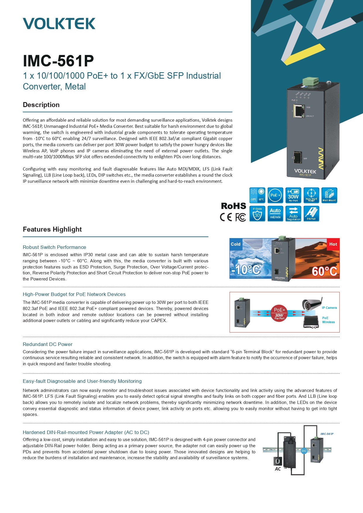 | ไฮไลท์ | IMC-561P is a 10/100/1000 PoE+ port and an FX/GbE SFP port industrial converter from fiber to PoE+ for long-distance PD connectivity to the network center using fiber. Compatible with third-party devices, the multi-rate RJ45 port adapts to different speeds and sends data to the SFP port compatible with modules of different speeds. The media converter uses LED signals for users to monitor the link connectivity. The device uses Line LoopBack to diagnose and troubleshoot the device. It controls data transmission using flow control. This media converter is built with industrial grade components and enclosed in an IP30 metal case with high thermal conductivity, which protects the device from tools and hazards. Hardened grade design for temperatures between -10°C to 60°C (14°F~140°F) for indoor and in-cabinet applications. To ensure reliability the redundant power supply and alarm relay contact on the terminal block ensures non-stop operations and issues alerts if power fails. ______________________________________________________ Product Highlights • 1 x 10/100/1000 PoE+ port and 1 x 100/1000Mbps SFP port • Conversion from long distance fiber transmission and noise-free communication to PoE • Link Fault Signaling to see connection status • Uses technology Line LoopBack to discard some issues • IP30 metal housing with high thermal conductivity • Operating temperatures -10℃ to 60℃ (14°F~140°F) ______________________________________________________ >>> หมายเหตุ : • ราคารวมภาษีมูลค่าเพิ่มแล้ว • กรณีมีสินค้าสต๊อกระยะจัดส่งสินค้าภายใน 3-5 วันทำการ • กรณีสินค้าหมดระยะจัดส่งสินค้าภายใน 4-6 สัปดาห์ • ฟรีค่าบริการจัดส่งสินค้า โดยบริษัทขนส่งเอกชน เช่น ปณ. ด่วน EMS, KEX Express, Flash Express เท่านั้น • สามารถเช็คสต๊อกสินค้าก่อนทำการสั่งซื้อได้ที่ @Line ID : kdnautomation • ลูกค้าตรวจสอบ Spec สินค้าก่อนทำการสั่งซื้อทุกครั้ง กรณีสั่งซื้อแล้วไม่รับเปลี่ยน-คืน ______________________________________________________ >>> ติดต่อสอบถามข้อมูลเพิ่มเติม : • Line Official : kdnautomation • E-Mail: kdnautomation@gmail.com • Tel : 082-550-3096, 02-023-3038 • Website : www.kdnautomation.co.th • เวลาทำการบริษัท วันจันทร์ - วันศุกร์ เวลา 08.00 - 17.00 น. ( หยุดวันนักขัตฤกษ์ ) ______________________________________________________ >>> บริการติดตั้ง : • ทางบริษัทจำหน่ายอุปกรณ์อิเล็กทรอนิกส์ ออกแบบ ติดตั้งและซ่อมแซม ปรับปรุงเครื่องจักรในโรงงานอุตสาหกรรม รวมถึงการให้บริการเขียนโปรแกรม และพัฒนาระบบควบคุมอัตโนมัติแบบครบวงจร ทั้งนี้ลูกค้าสามารถส่งรายละเอียด มาได้ที่ E-mail : kdnautomation@gmail.com เพื่อประเมินราคา |