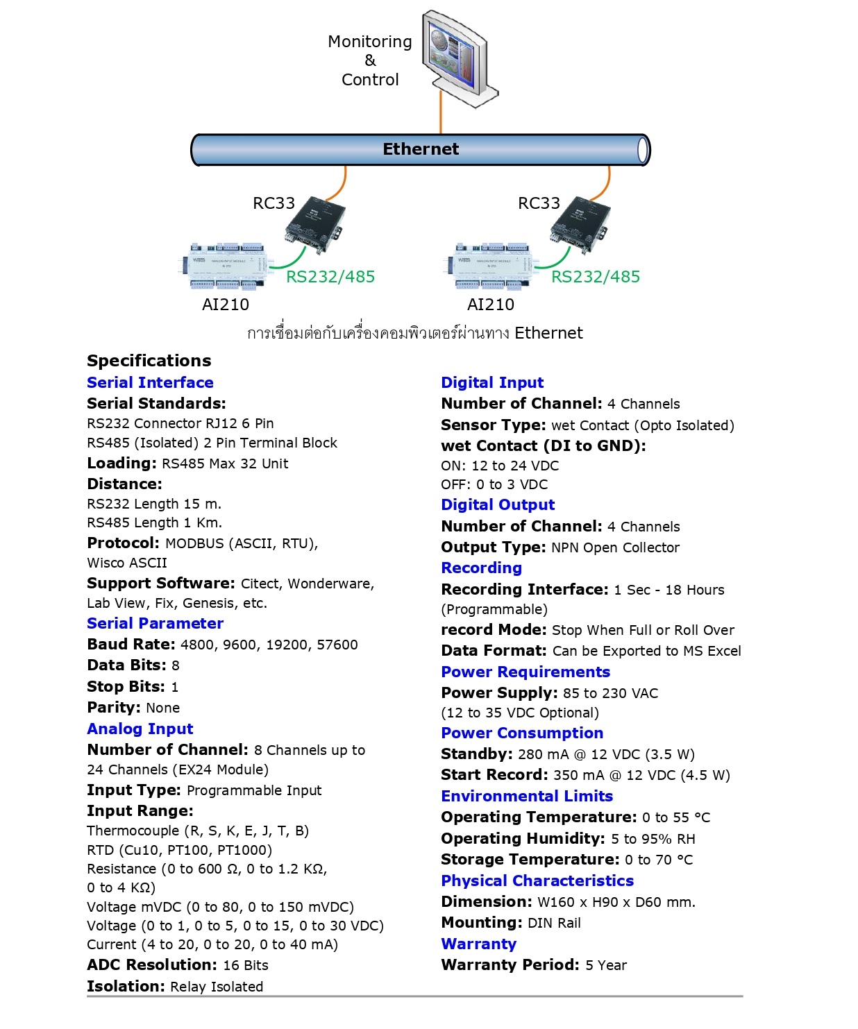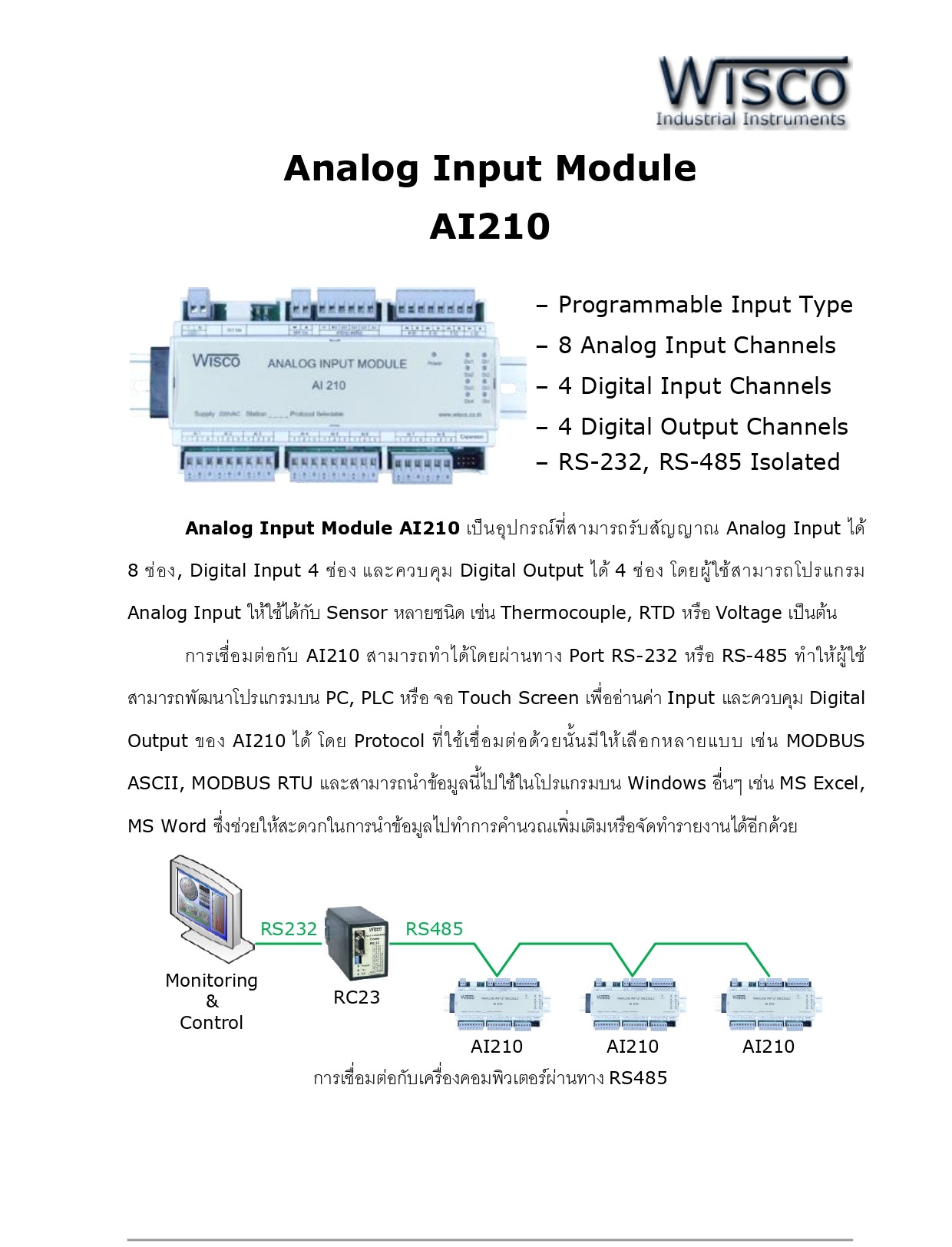 Analog Input Module AI210 เป็นอุปกรณ์ที่สามารถรับสัญญาณ Analog Input ได้ 8 ช่อง, Digital Input 4 ช่อง และควบคุม Digital Output ได้ 4 ช่อง โดยผู้ใช้สามารถโปรแกรม Analog Input ให้ใช้ได้กับ Sensor หลายชนิด เช่น Thermocouple, RTD หรือ Voltage เป็นต้น