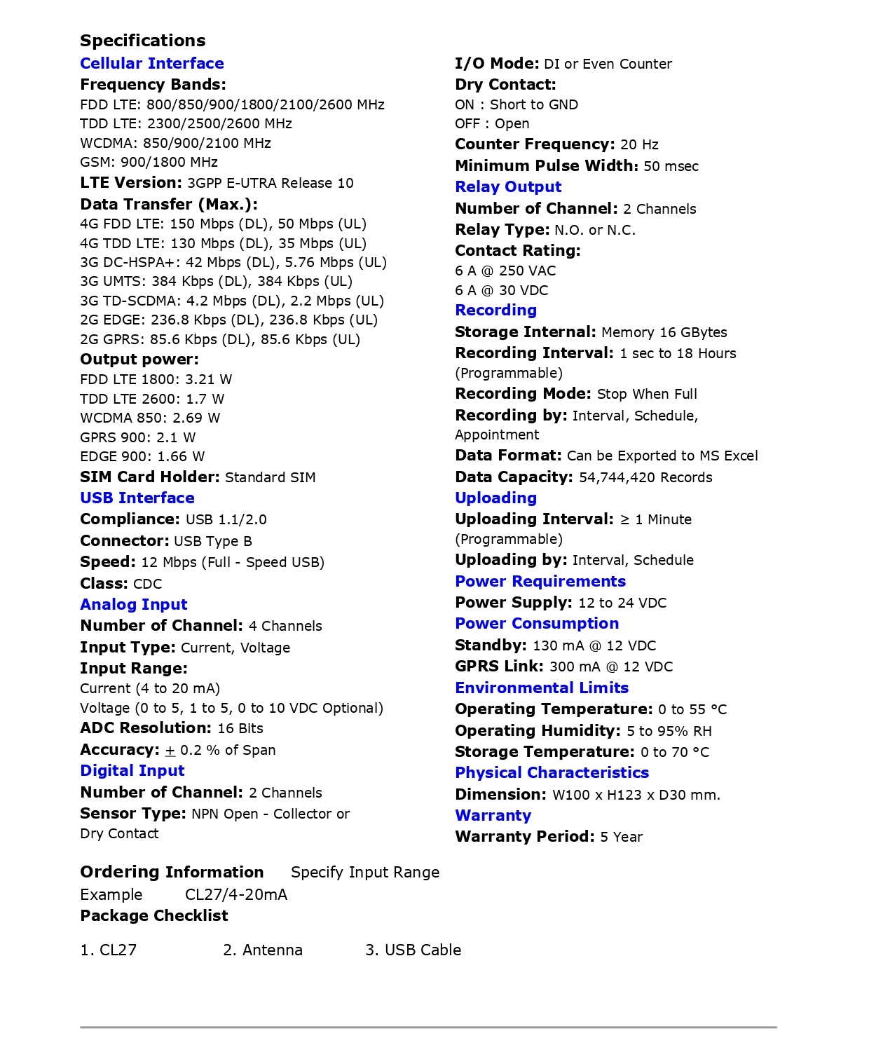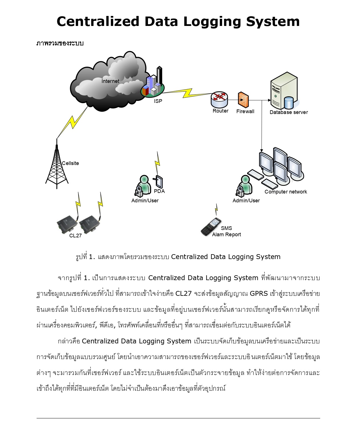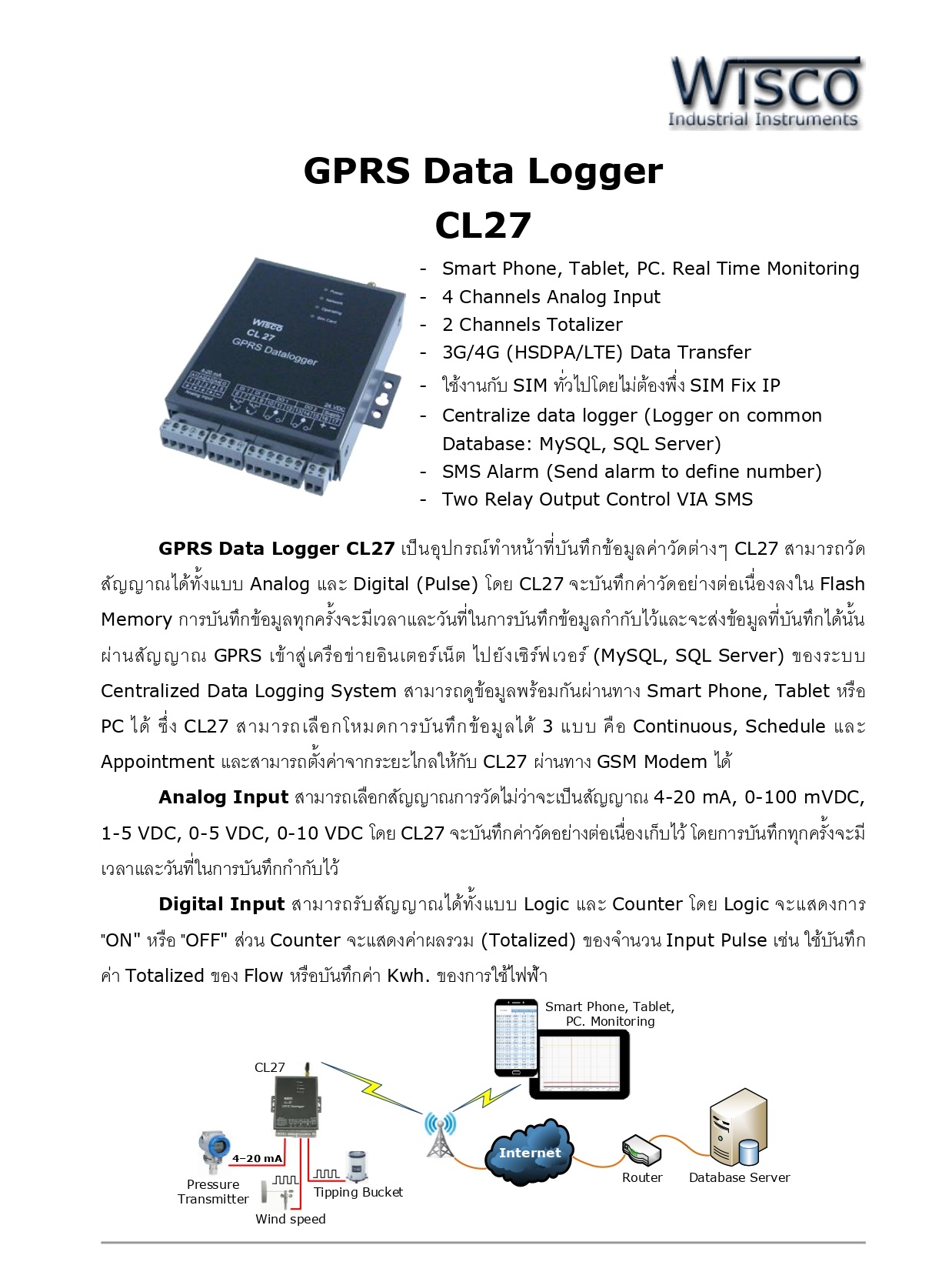 GPRS Data Logger CL27 เป็นอุปกรณ์ทำหน้าที่บันทึกข้อมูลค่าวัดต่างๆ CL27 สามารถวัดสัญญาณได้ทั้งแบบ Analog และ Digital (Pluse) โดย CL27 จะบันทึกค่าวัดอย่างต่อเนื่องลงใน Flash Memory การบันทึกข้อมูลทุกครั้งจะมีเวลาและวันที่ในการบันทึกข้อมูลกำกับไว้และจะส่งข้อมูลที่บันทึกได้นั้นผ่านสัญญาณ GPRS เข้าสู่เครือข่ายอินเตอร์เน็ต ไปยังเซิร์ฟเวอร์ (MySQL, SQL Server) ของระบบ Centralized Data Logging System (รายละเอียด) สามารถดูข้อมูลพร้อมกันผ่านทาง Smart Phone, Tablet หรือ PC ได้ ซึ่ง CL27 สามารถเลือกโหมดการบันทึกข้อมูลได้ 3 แบบ คือ Continuous, Schedule และ Appointment และสามารถตั้งค่าจากระยะไกลให้กับ CL27 ผ่านทาง GSM Modem ได้