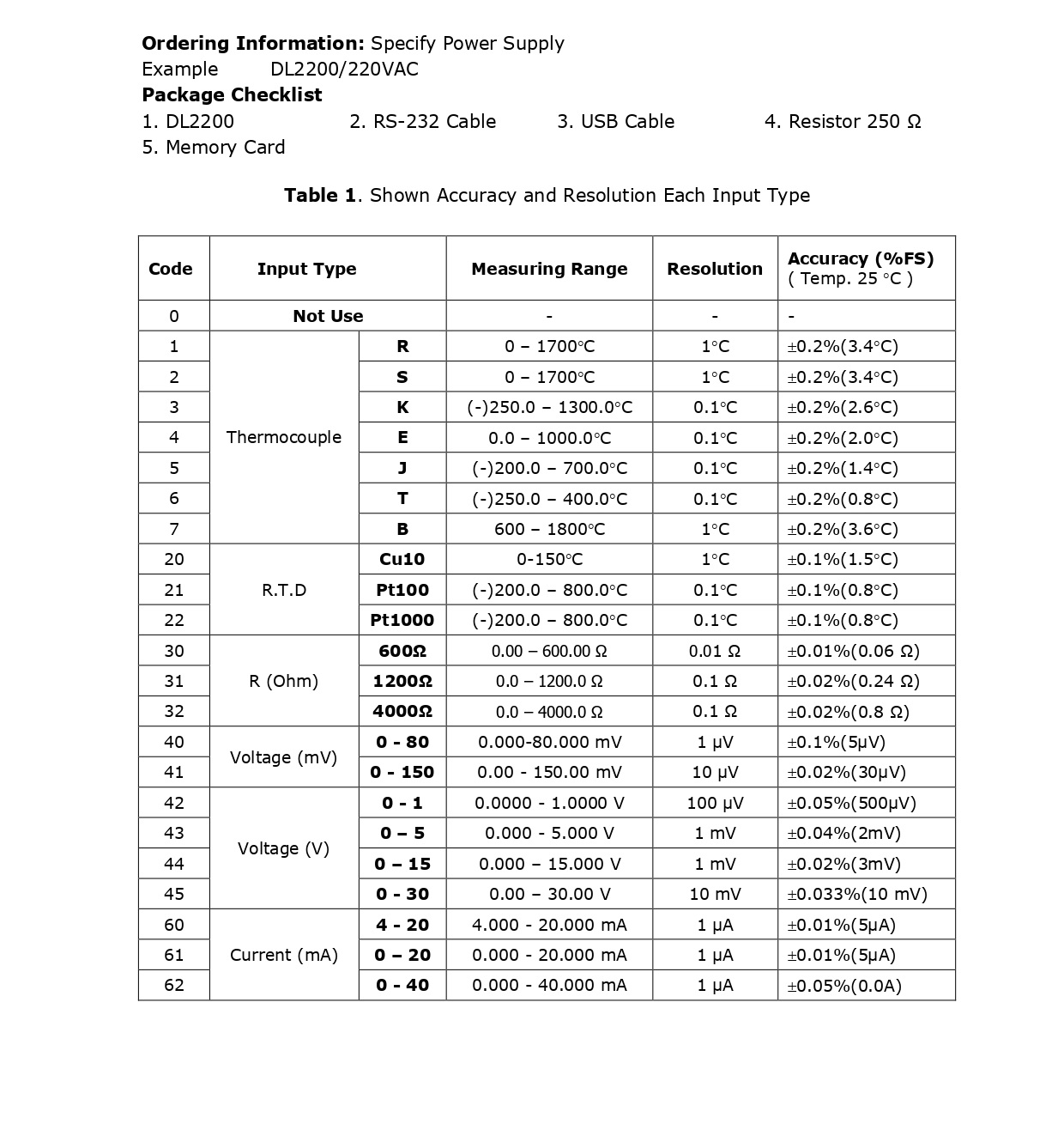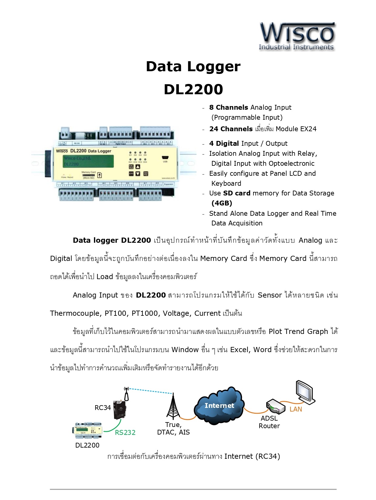 Analog Input ของ DL2200 สามารถโปรแกรมให้ใช้ได้กับ Sensor ได้หลายชนิด เช่น Thermocouple, PT100, PT1000, Voltage, Current เป็นต้น