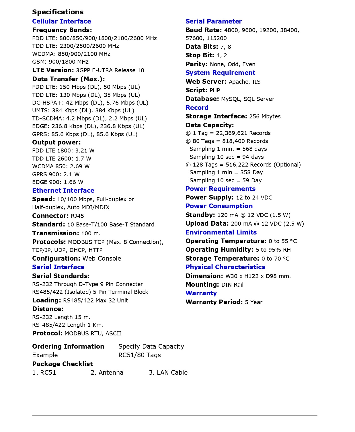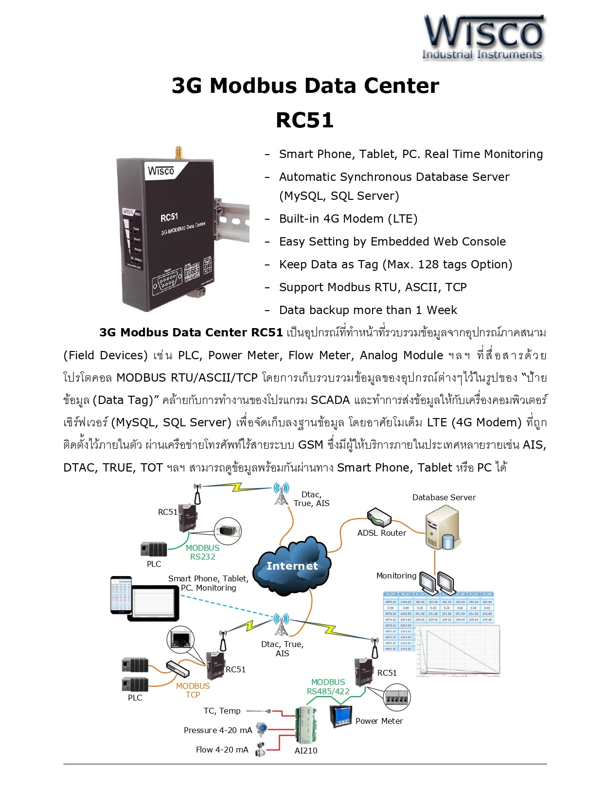 3G Modbus Data Center RC51 เป็นอุปกรณ์ที่ทำหน้าที่รวบรวมข้อมูลจากอุปกรณ์ภาคสนาม (Field Devices) เช่น PLC, Power Meter, Flow Meter, Analog Module ฯลฯ ที่สื่อสารด้วยโปรโตคอล MODBUS RTU/ASCII/TCP โดยการเก็บรวบรวมข้อมูลของอุปกรณ์ต่างๆไว้ในรูปของ “ป้ายข้อมูล (Data Tag)” คล้ายกับการทำงานของโปรแกรม SCADA และทำการส่งข้อมูลให้กับเครื่องคอมพิวเตอร์เซิร์ฟเวอร์ (MySQL, SQL Server) เพื่อจัดเก็บลงฐานข้อมูล โดยอาศัยโมเด็ม UMTS/HSDPA (3G Modem) ที่ถูกติดตั้งไว้ภายในตัว ผ่านเครือข่ายโทรศัพท์ไร้สายระบบ GSM ซึ่งมีผู้ให้บริการภายในประเทศหลายรายเช่น AIS, DTAC, TRUE, TOT ฯลฯ สามารถดูข้อมูลพร้อมกันผ่านทาง Smart Phone, Tablet หรือ PC ได้