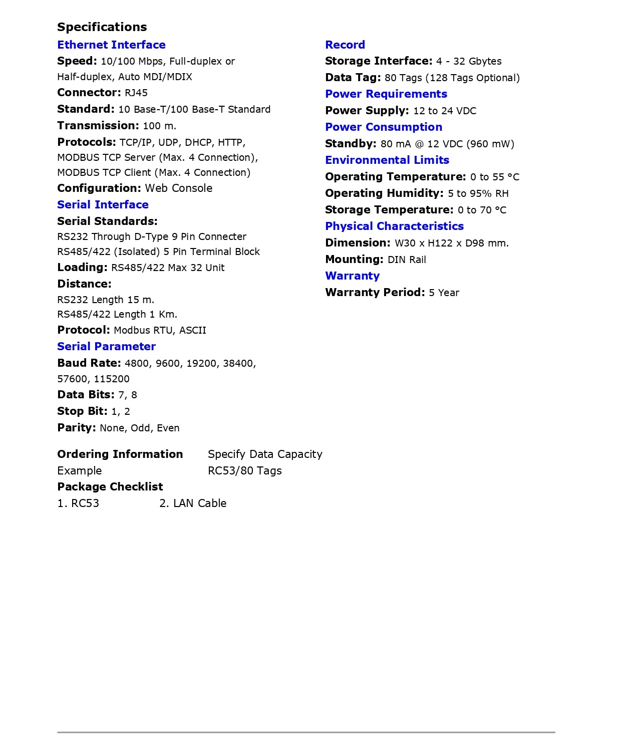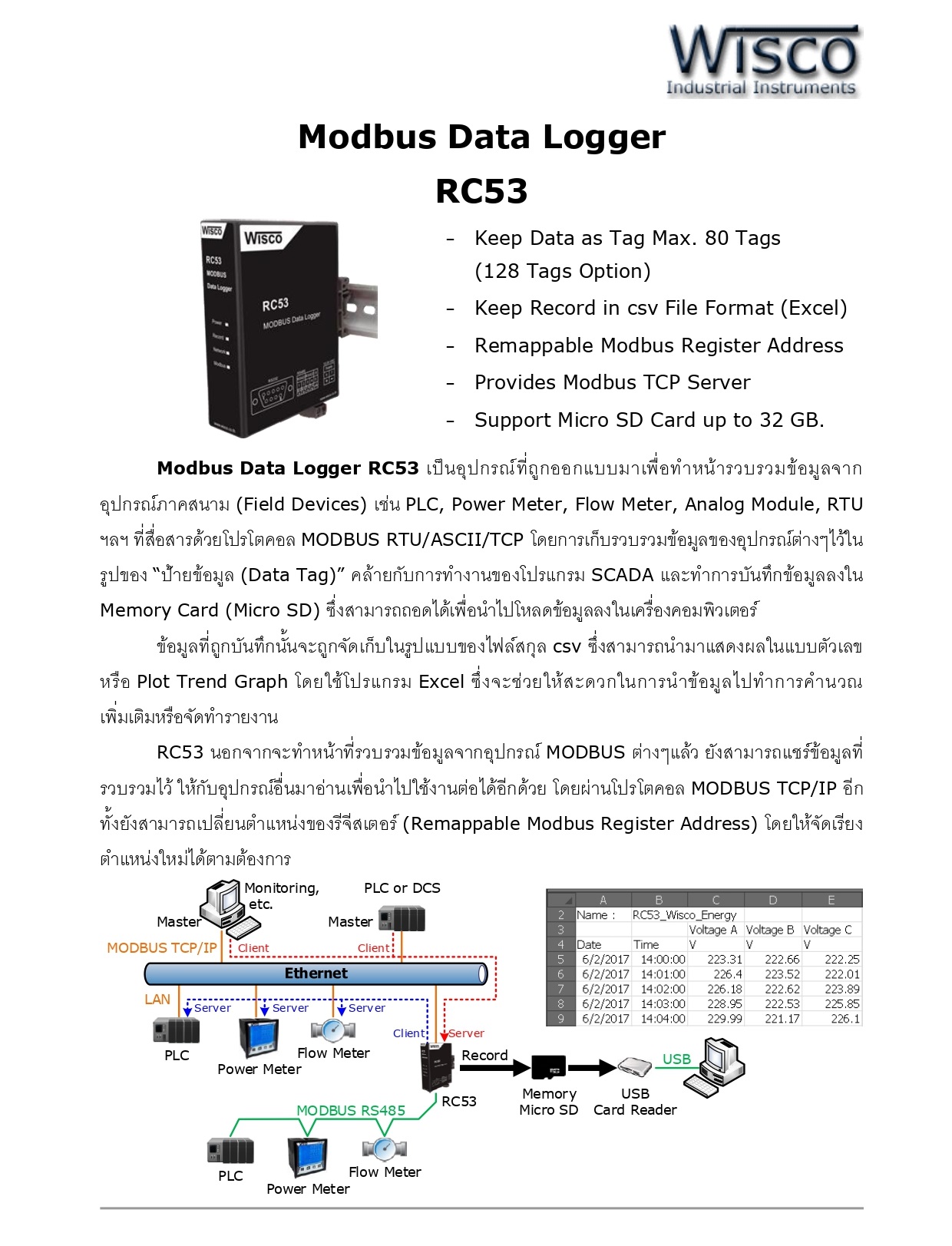 Modbus Data Logger RC53 เป็นอุปกรณ์ที่ถูกออกแบบมาเพื่อทำหน้ารวบรวมข้อมูลจากอุปกรณ์ภาคสนาม (Field Devices) เช่น PLC, Power Meter, Flow Meter, Analog Module, RTU ฯลฯ ที่สื่อสารด้วยโปรโตคอล MODBUS RTU/ASCII/TCP โดยการเก็บรวบรวมข้อมูลของอุปกรณ์ต่างๆไว้ในรูปของ “ป้ายข้อมูล (Data Tag)” คล้ายกับการทำงานของโปรแกรม SCADA และทำการบันทึกข้อมูลลงใน Memory Card (Micro SD) ซึ่งสามารถถอดได้เพื่อนำไปโหลดข้อมูลลงในเครื่องคอมพิวเตอร์
