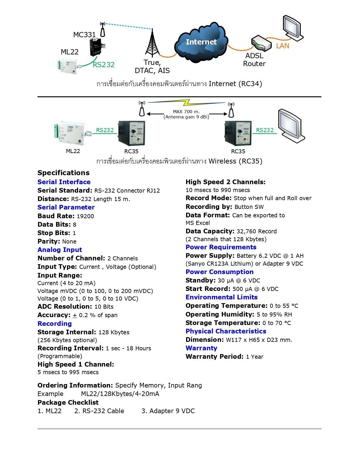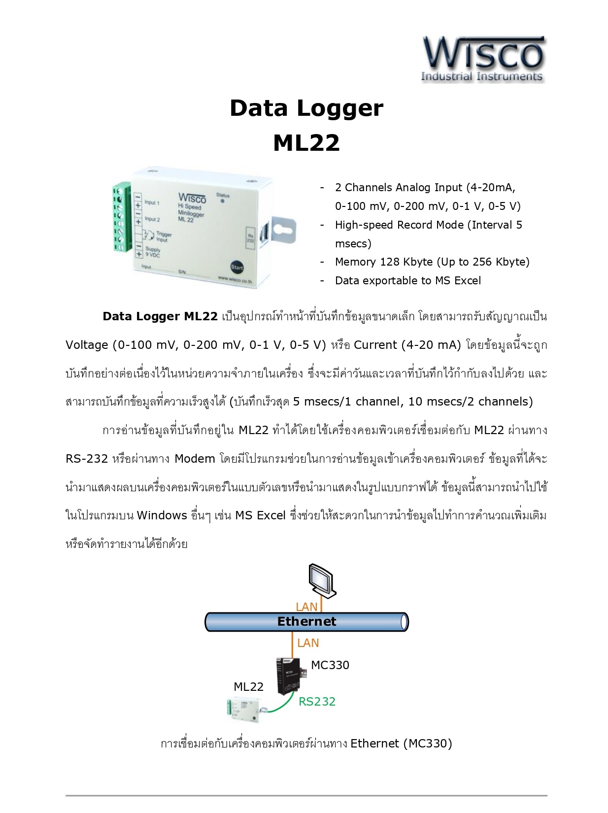 Data Logger ML22 เป็นอุปกรณ์ทำหน้าที่บันทึกข้อมูลขนาดเล็ก โดยสามารถรับสัญญาณเป็น Voltage (0-100 mV, 0-200 mV, 0-1 V, 0-5 V) โดยข้อมูลนี้จะถูกบันทึกอย่างต่อเนื่องไว้ในหน่วยความจำภายในเครื่อง ซึ่งจะมีค่าวันและเวลาที่บันทึกไว้กำกับลงไปด้วย และสามารถบันทึกข้อมูลที่ความเร็วสูงได้ (เร็วสุด 5 msecs/1 channel, 10 msecs/2 channels)