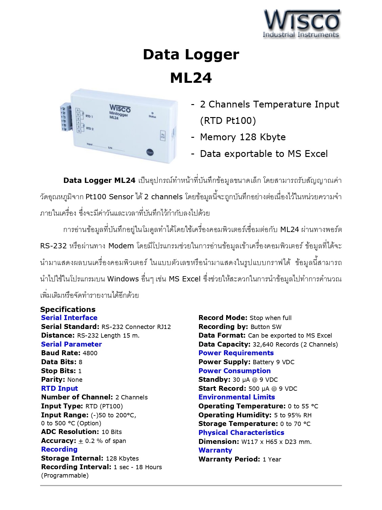 Data Logger ML24 เป็นอุปกรณ์ทำหน้าที่บันทึกข้อมูลขนาดเล็ก โดยสามารถรับสัญญาณค่าวัดอุณหภูมิจาก Pt100 Sensor ได้ 2 channels โดยข้อมูลนี้จะถูกบันทึกอย่างต่อเนื่องไว้ในหน่วยความจำภายในเครื่อง ซึ่งจะมีค่าวันและเวลาที่บันทึกไว้กำกับลงไปด้วย