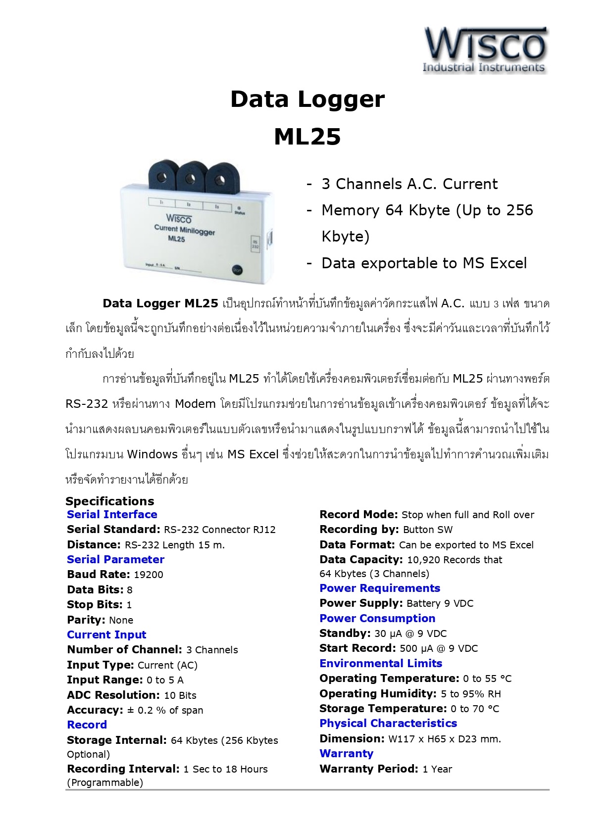 Data Logger ML25 เป็นอุปกรณ์ทำหน้าที่บันทึกข้อมูลค่าวัดกระแสไฟ A.C. แบบ 3 เฟส ขนาดเล็ก โดยข้อมูลนี้จะถูกบันทึกอย่างต่อเนื่องไว้ในหน่วยความจำภายในเครื่อง ซึ่งจะมีค่าวันและเวลาที่บันทึกไว้กำกับลงไปด้วย