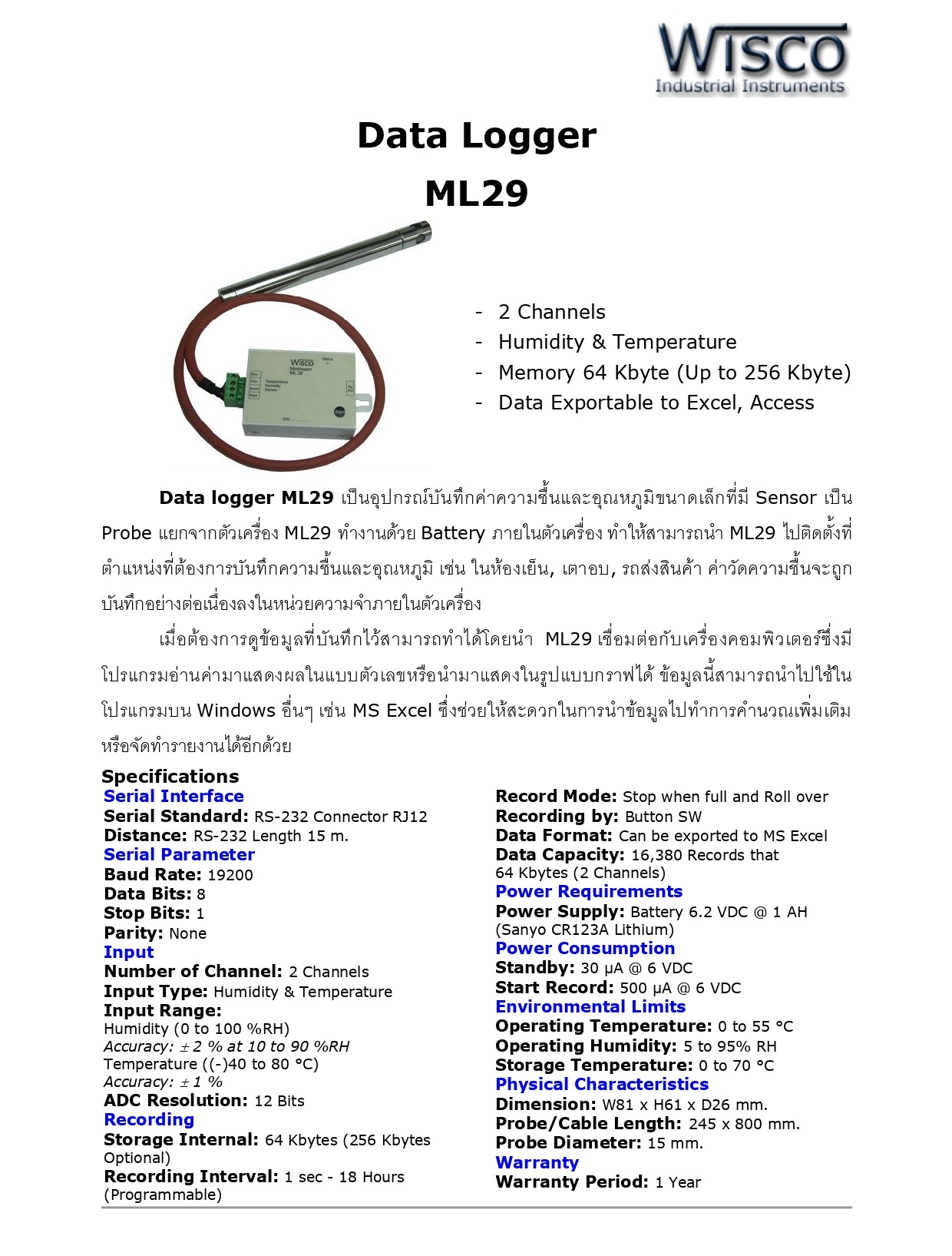 Data Logger ML27 เป็นอุปกรณ์ทำหน้าที่บันทึกข้อมูลค่าวัดขนาดเล็ก ซึ่งมี Sensor ในตัว ทั้ง Humidity และ Temperature โดยข้อมูลนี้จะถูกบันทึกอย่างต่อเนื่องไว้ในหน่วยความจำภายในเครื่อง ซึ่งจะมีค่าวันและเวลาที่บันทึกไว้กำกับลงไปด้วย เหมาะที่จะนำไปติดตั้งตามตำแหน่งที่ต้องการบันทึกความชื้นและ/หรืออุณหภูมิ เช่น ห้องเย็น เตาอบ รถส่งสินค้า เป็นต้น