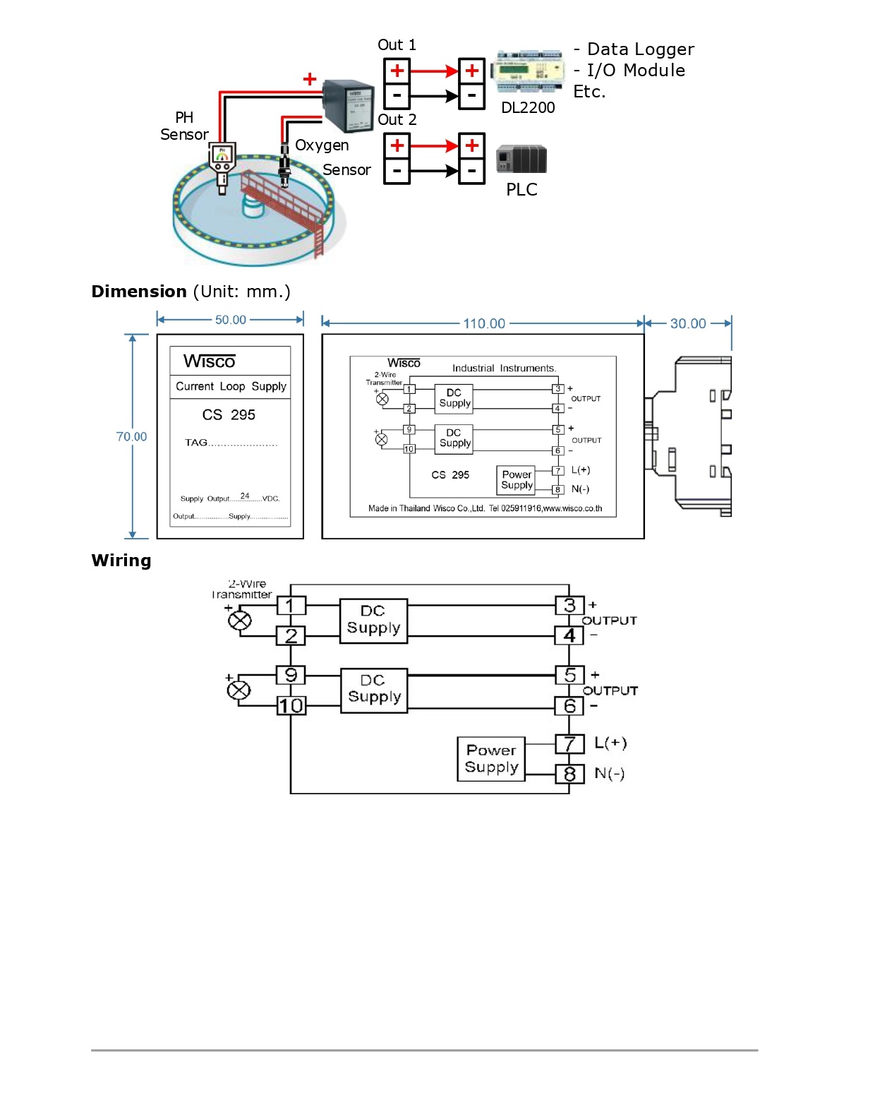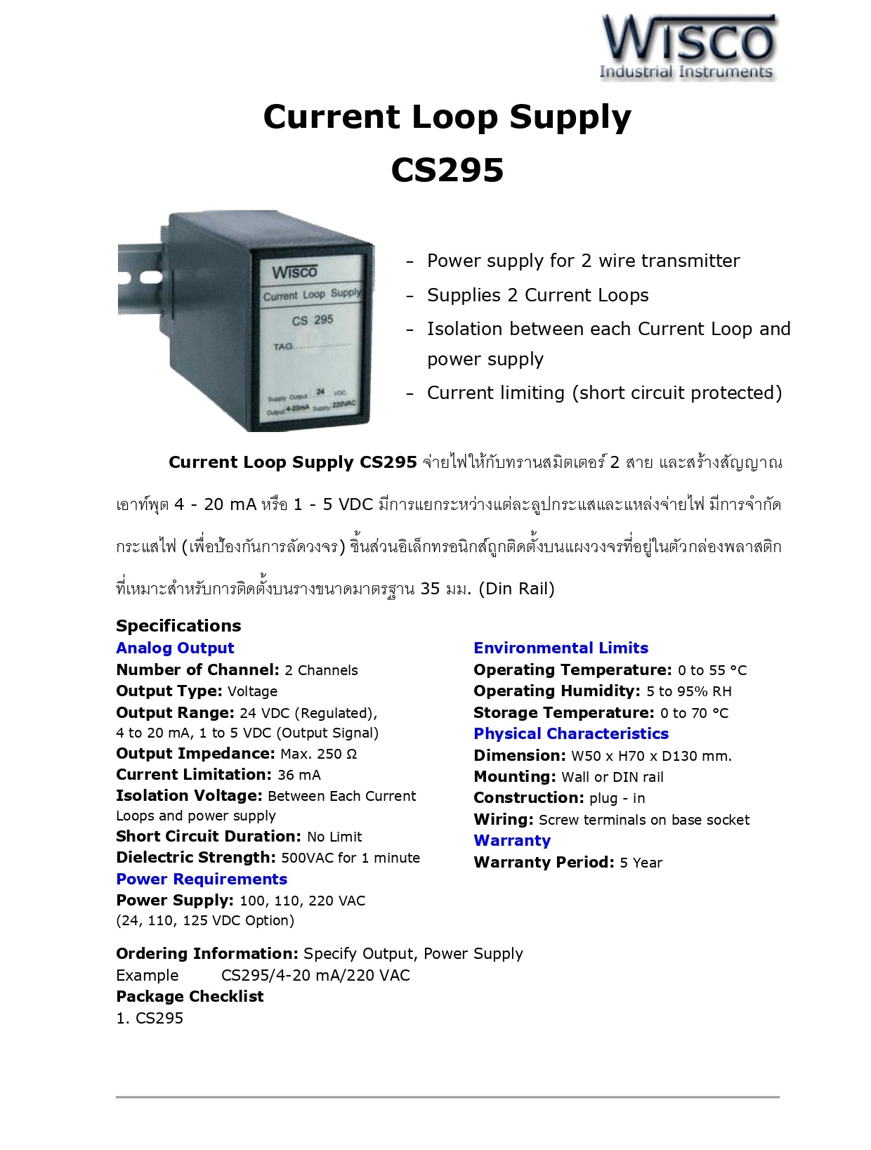 The Current Loop Supply CS295 จ่ายไฟให้กับทรานสมิตเตอร์ 2 สาย และสร้างสัญญาณเอาท์พุต 4 - 20 mA หรือ 1 - 5 VDC มีการแยกระหว่างแต่ละลูปกระแสและแหล่งจ่ายไฟ มีการจำกัดกระแสไฟ (เพื่อป้องกันการลัดวงจร) ชิ้นส่วนอิเล็กทรอนิกส์ถูกติดตั้งบนแผงวงจรที่อยู่ในตัวกล่องพลาสติก ที่เหมาะสำหรับการติดตั้งบนรางขนาดมาตรฐาน 35 มม. (Din Rail)