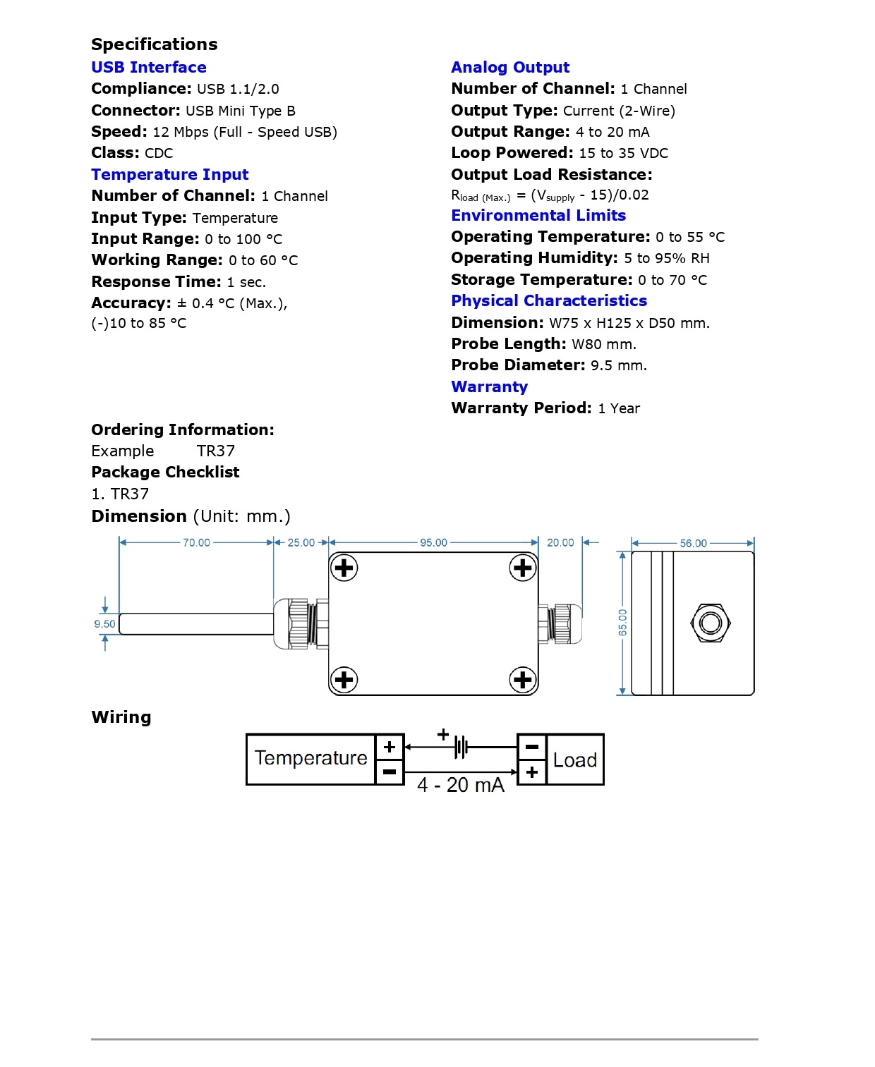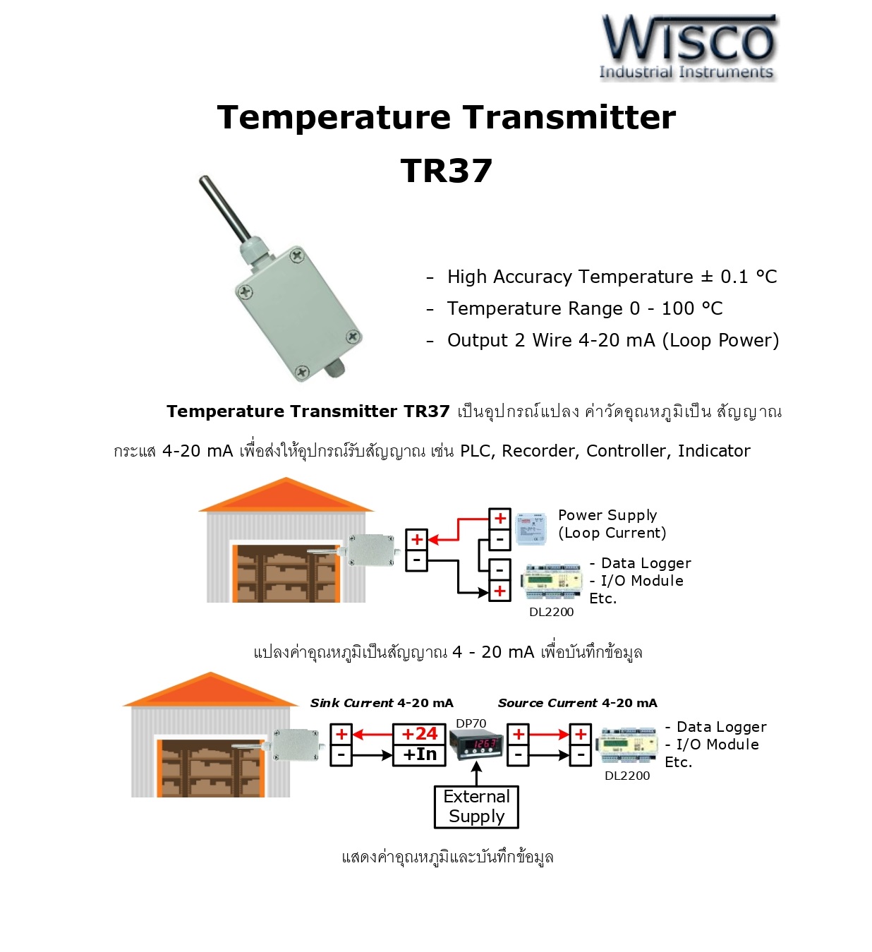 Temperature Transmitter TR37 เป็นอุปกรณ์แปลง ค่าวัดอุณหภูมิเป็น สัญญาณกระแส 4-20 mA เพื่อส่งให้อุปกรณ์รับสัญญาณ เช่น PLC, Recorder, Controller, Indicator