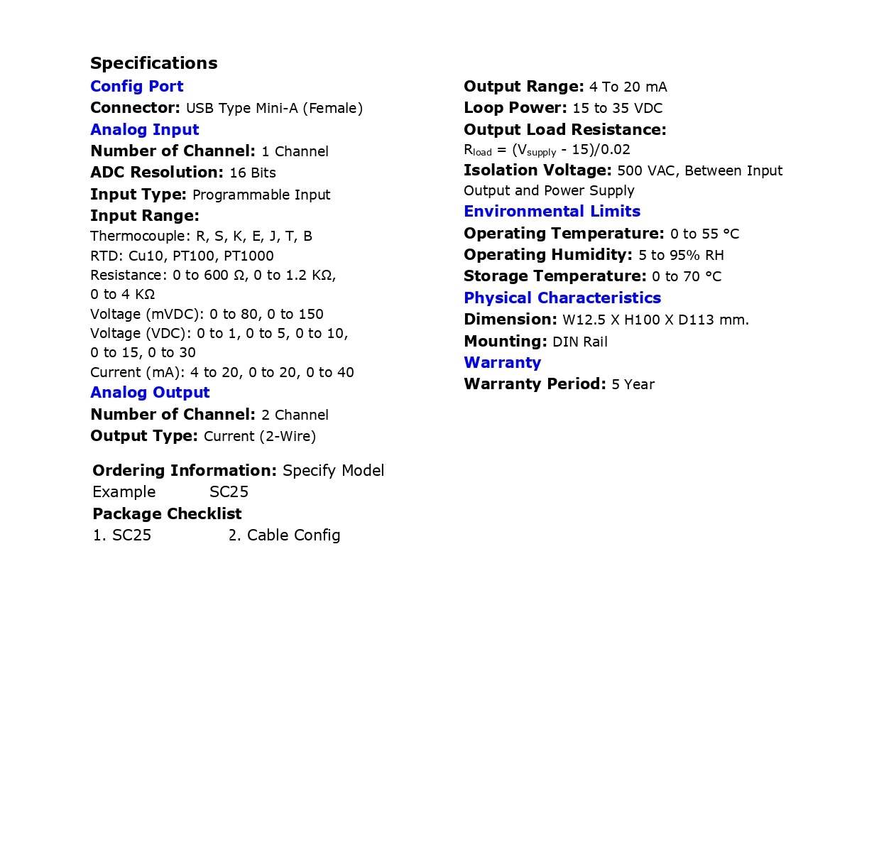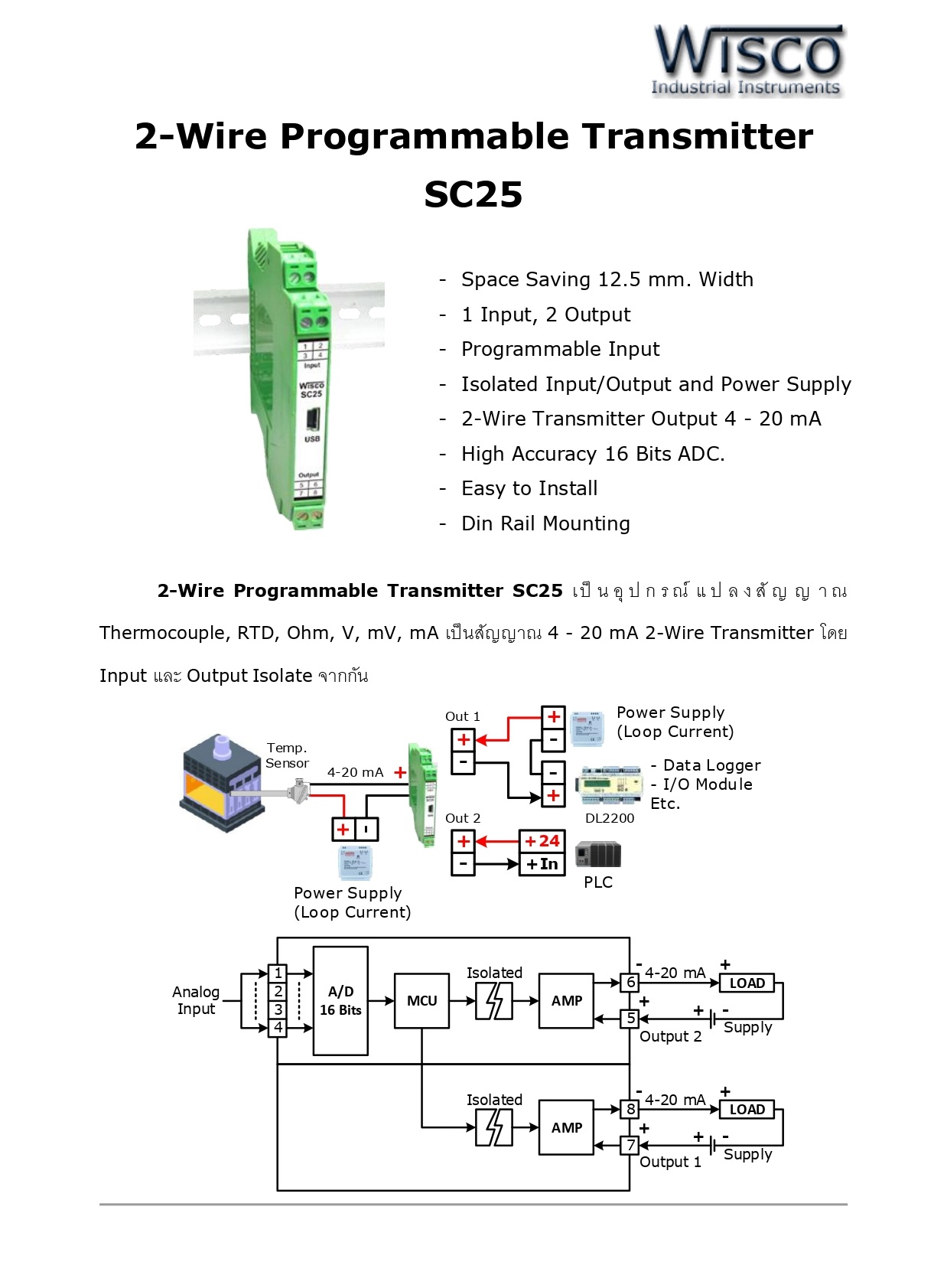2-Wire Programmable Transmitter SC25 เป็นอุปกรณ์แปลงสัญญาณ Thermocouple, RTD, Ohm, V, mV, mA เป็นสัญญาณ 4 - 20 mA 2-Wire Transmitter โดย Input และ Output Isolate จากกัน