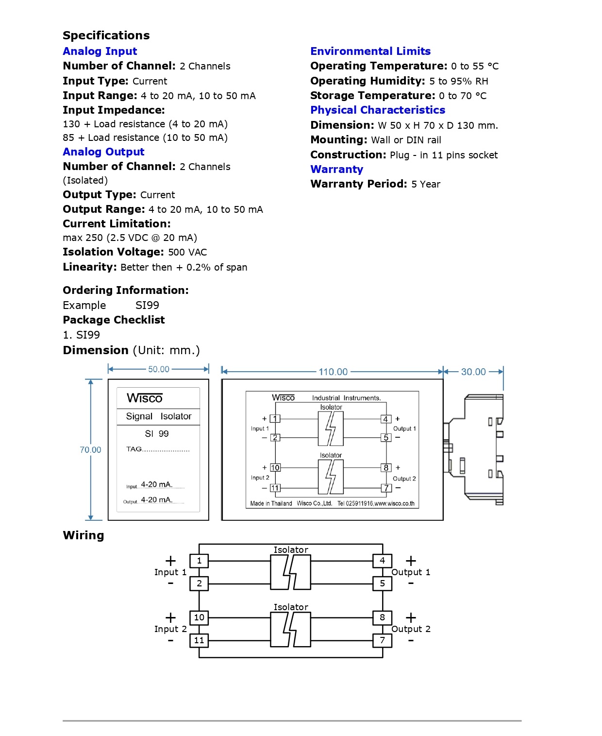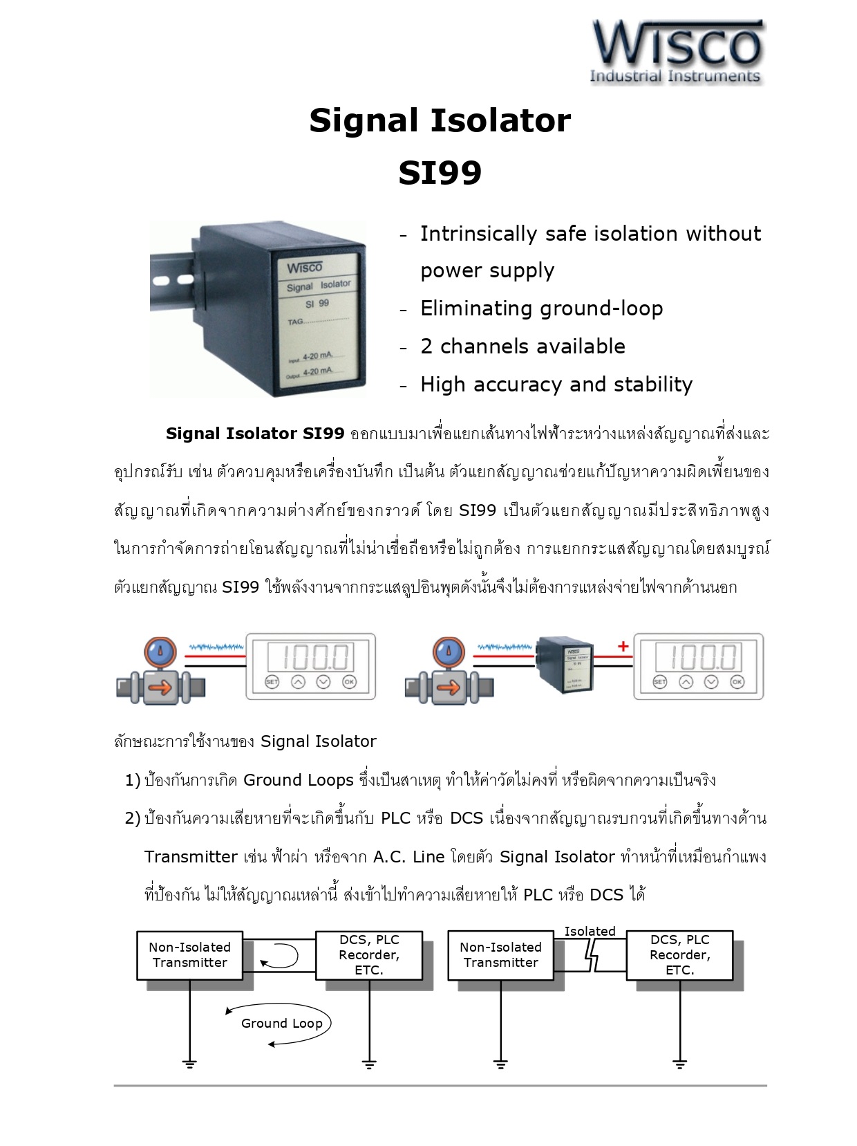 Signal Isolator SI99 ออกแบบมาเพื่อแยกเส้นทางไฟฟ้าระหว่างแหล่งสัญญาณที่ส่งและอุปกรณ์รับ เช่น ตัวควบคุมหรือเครื่องบันทึก เป็นต้น ตัวแยกสัญญาณช่วยแก้ปัญหาความผิดเพี้ยนของสัญญาณที่เกิดจากความต่างศักย์ของกราวด์ โดย SI99 เป็นตัวแยกสัญญาณมีประสิทธิภาพสูงในการกำจัดการถ่ายโอนสัญญาณที่ไม่น่าเชื่อถือหรือไม่ถูกต้อง การแยกกระแสสัญญาณโดยสมบูรณ์ตัวแยกสัญญาณ SI99 ใช้พลังงานจากกระแสลูปอินพุตดังนั้นจึงไม่ต้องการแหล่งจ่ายไฟจากด้านนอก