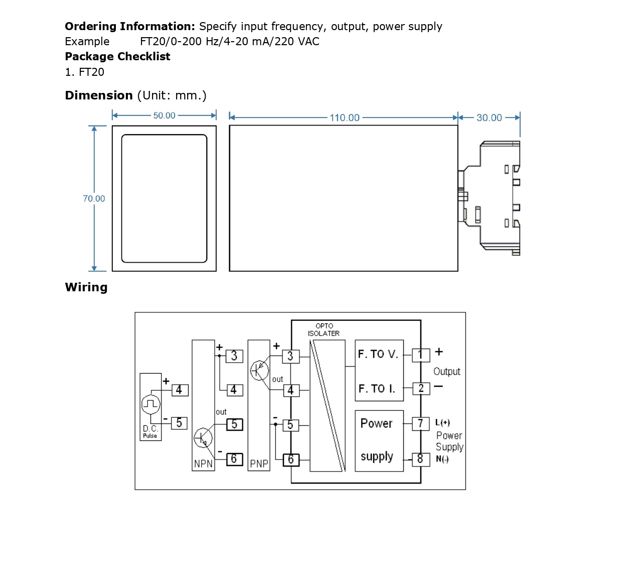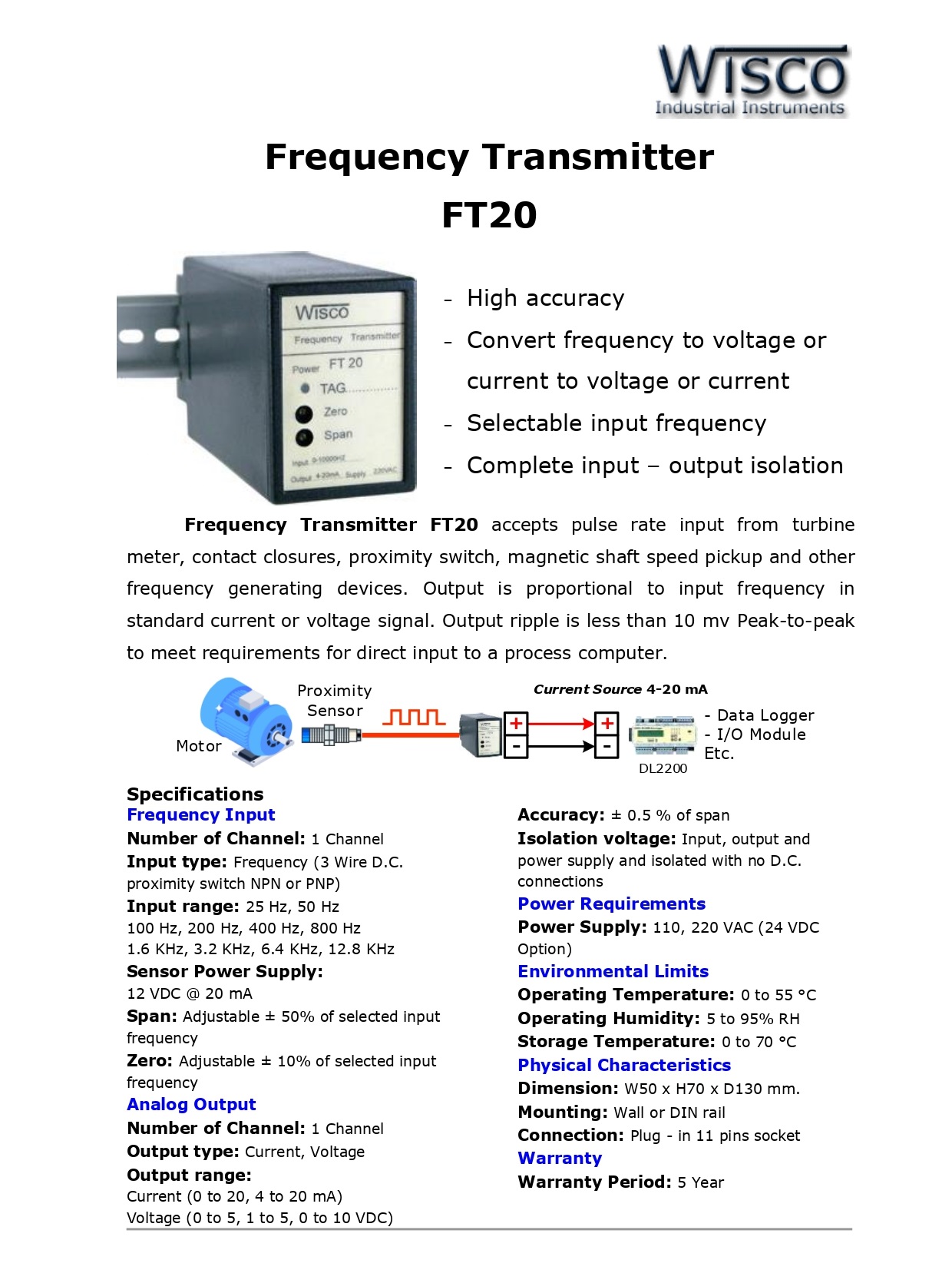 Frequency Transmitter FT20 accepts pulse rate input from turbine meter, contact closures, proximity switch, magnetic shaft speed pickup and other frequency generating devices. Output is proportional to input frequency in standard current or voltage signal. Output ripple is less than 10 mv Peak-to-peak to meet requirements for direct input to a process computer.