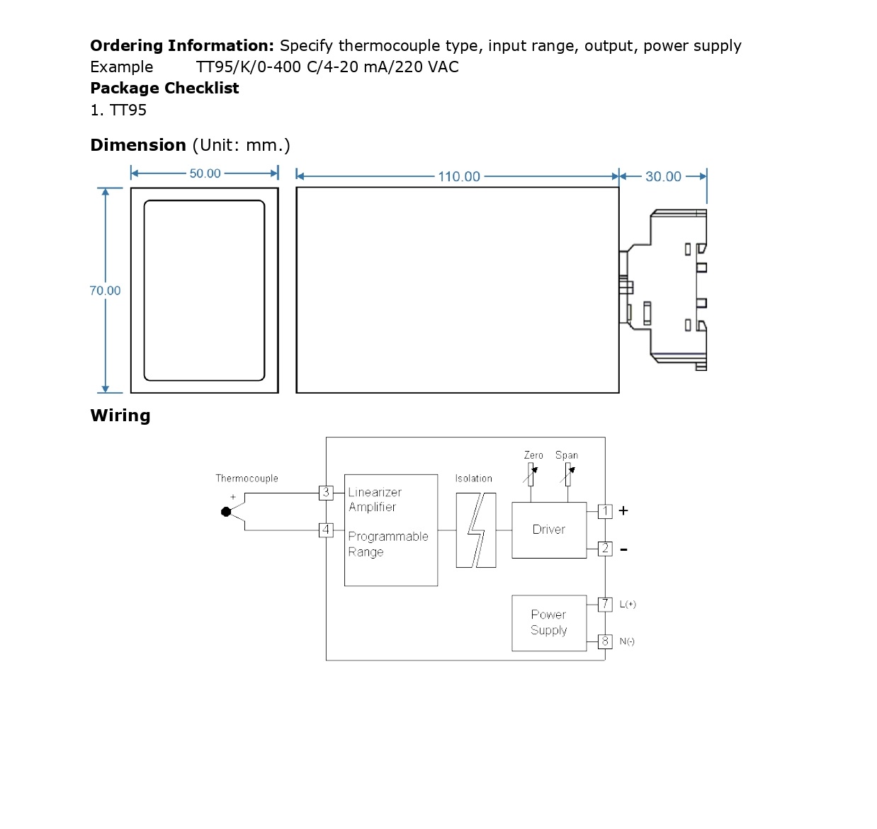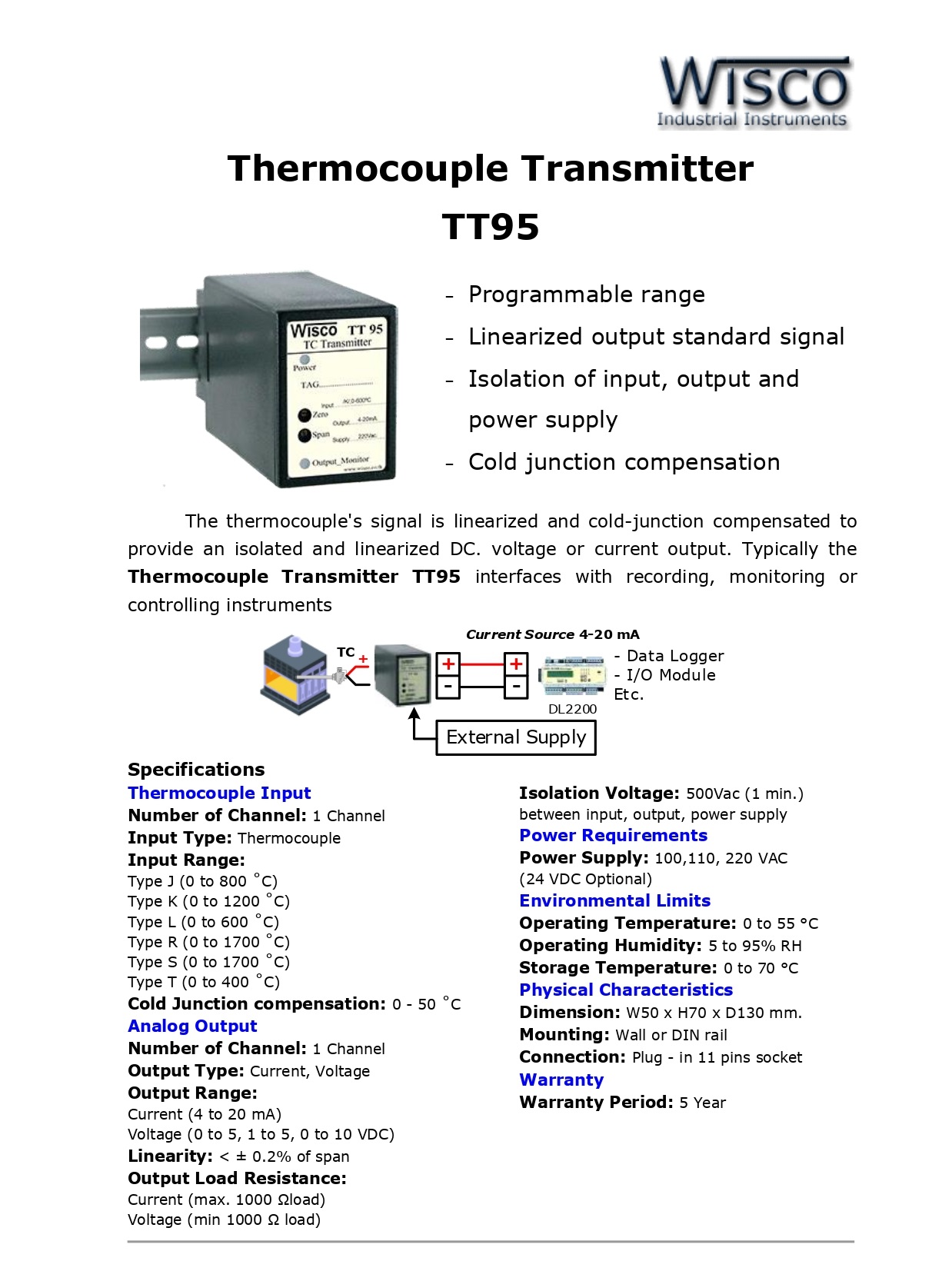 The thermocouple's signal is linearized and cold-junction compensated to provide an isolated and linearized DC. voltage or current output. Typically the Thermocouple Transmitter TT95 interfaces with recording, monitering or controlling instruments.