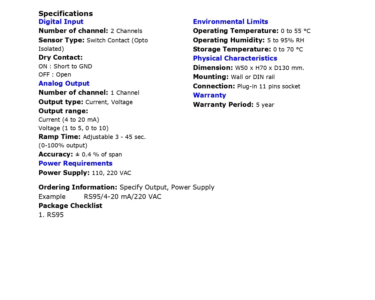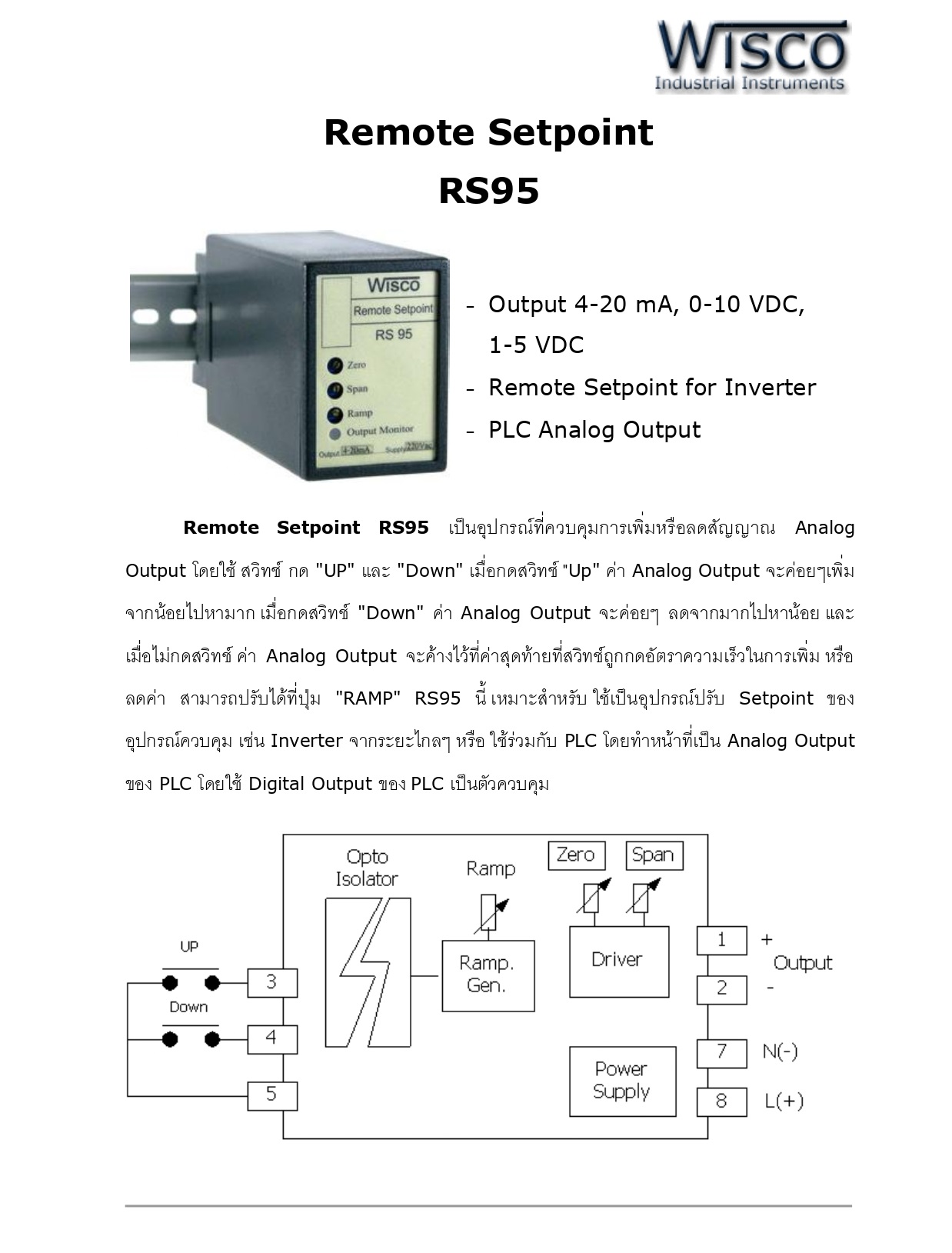 Remote Setpoint RS95 เป็นอุปกรณ์ที่ควบคุมการเพิ่มหรือลดสัญญาณ Analog Output โดยใช้ สวิทช์ กด "UP" และ "Down" เมื่อกดสวิทช์ "Up" ค่า Analog Output จะค่อยๆเพิ่มจากน้อยไปหามาก เมื่อกดสวิทช์ "Down" ค่า Analog Output จะค่อยๆ ลดจากมากไปหาน้อย และเมื่อไม่กดสวิทช์ ค่า Analog Output จะค้างไว้ที่ค่าสุดท้ายที่สวิทช์ถูกกดอัตราความเร็วในการเพิ่ม หรือ ลดค่า สามารถปรับได้ที่ปุ่ม "RAMP" RS95 นี้ เหมาะสำหรับ ใช้เป็นอุปกรณ์ปรับ Setpoint ของอุปกรณ์ควบคุม เช่น Inverter จากระยะไกลๆ หรือ ใช้ร่วมกับ PLC โดยทำหน้าที่เป็น Analog Output ของ PLC โดยใช้ Digital Output ของ PLC เป็นตัวควบคุม