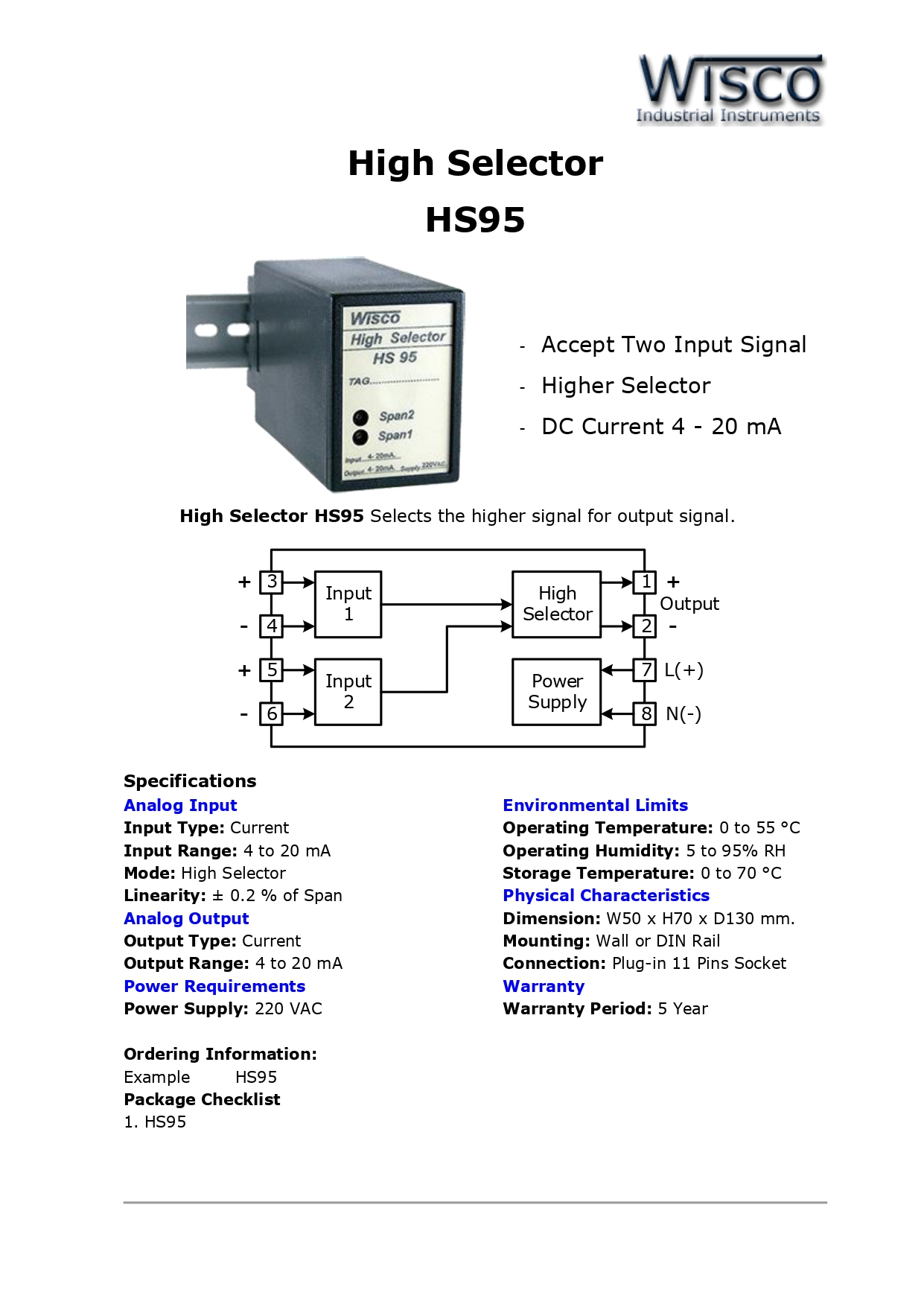 High Selector HS95 ทำหน้าที่เลือกสัญญาณ 4 - 20 mA ที่มีค่ามากกว่าไปใช้งาน