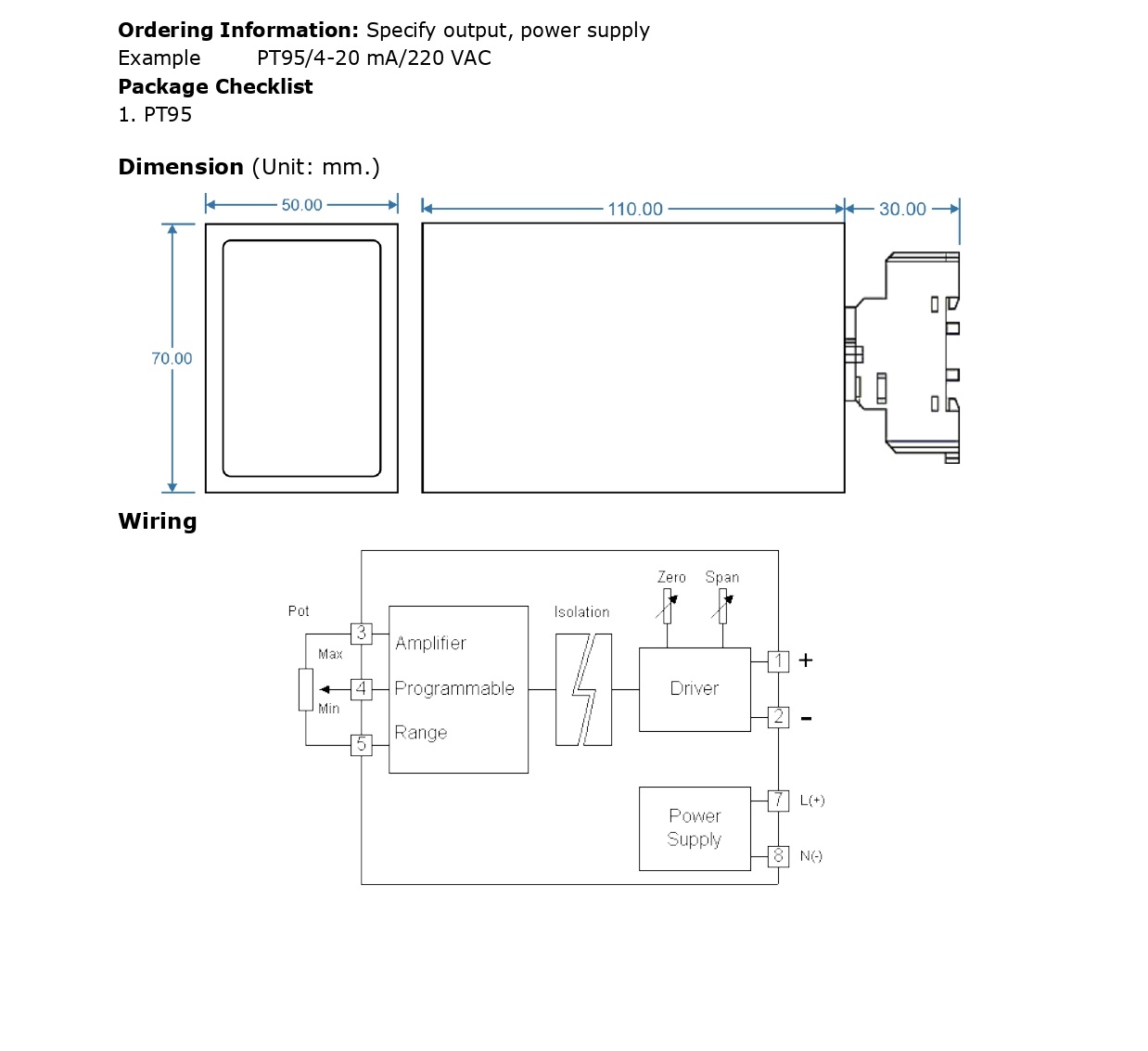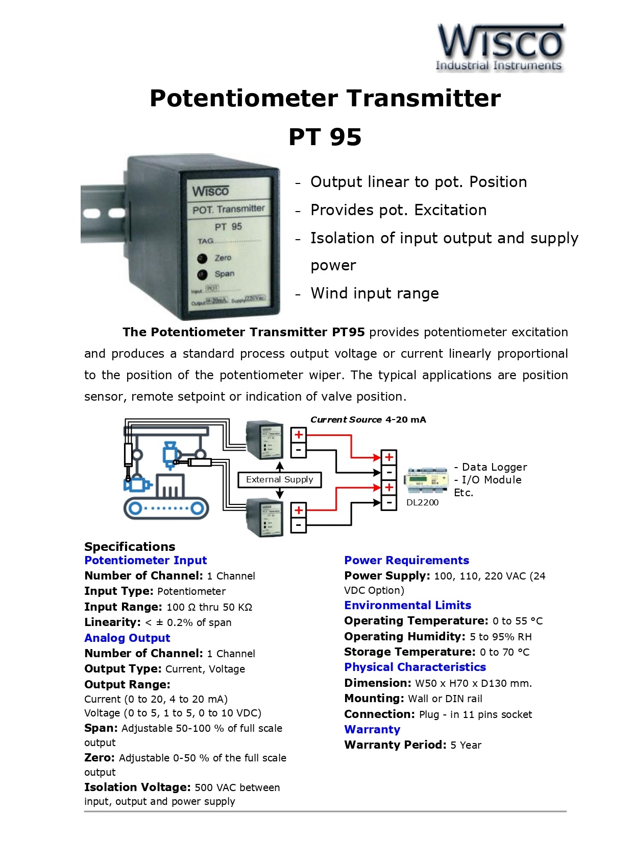 The Potentiometer Transmitter PT95 provides potentiometer excitation and produces a standard process output voltage or current linearly proportional to the position of the potentiometer wiper. The typical applications are position sensor, remote setpoint or indication of valve position.