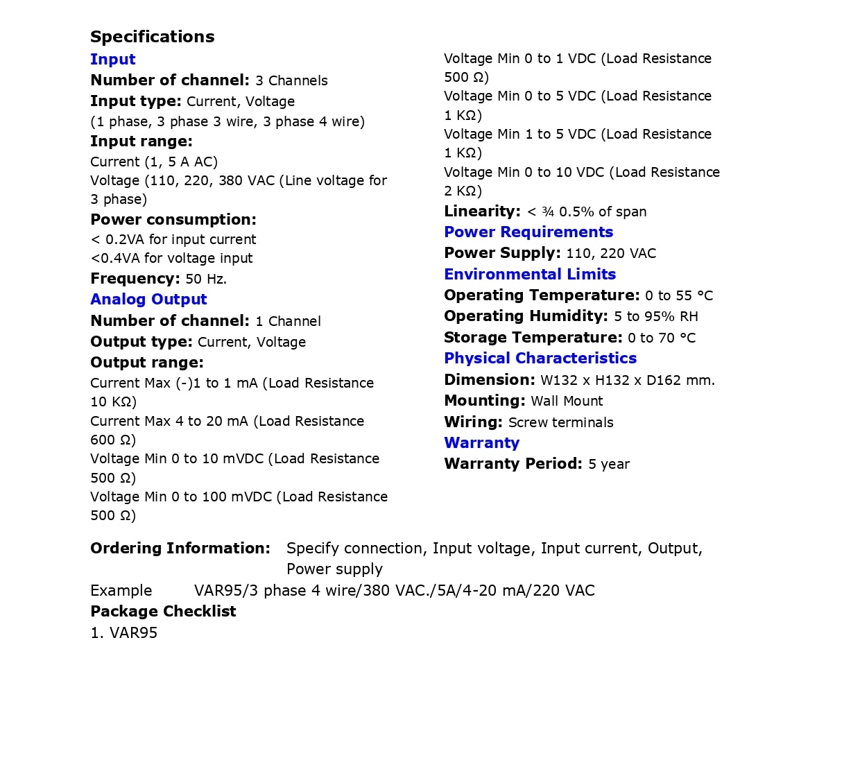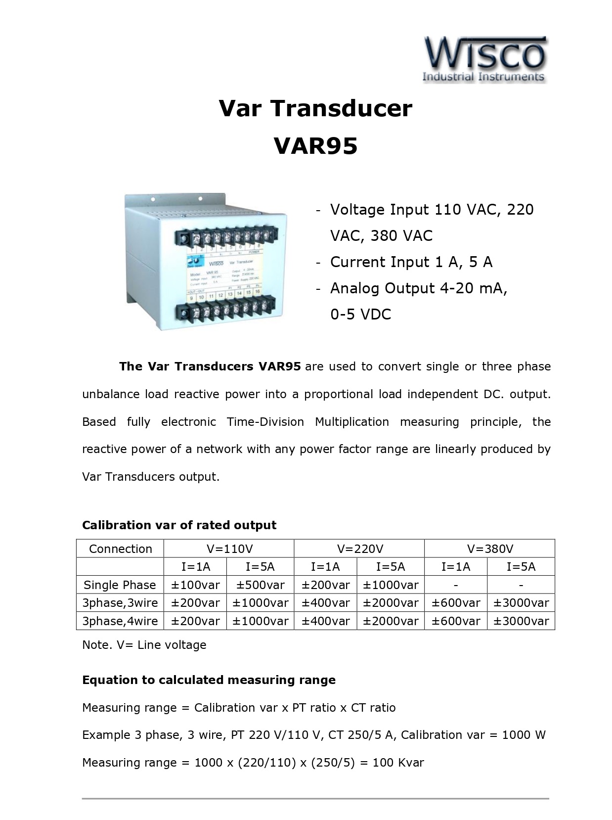 The Var Transducers VAR95 are used to convert single or three phase unbalance load reactive power into a proportional load independent DC. output. Based fully electronic Time-Division Multiplication measuring principle, the reactive power of a network with any power factor range are linearly produced by Var Transducers output.