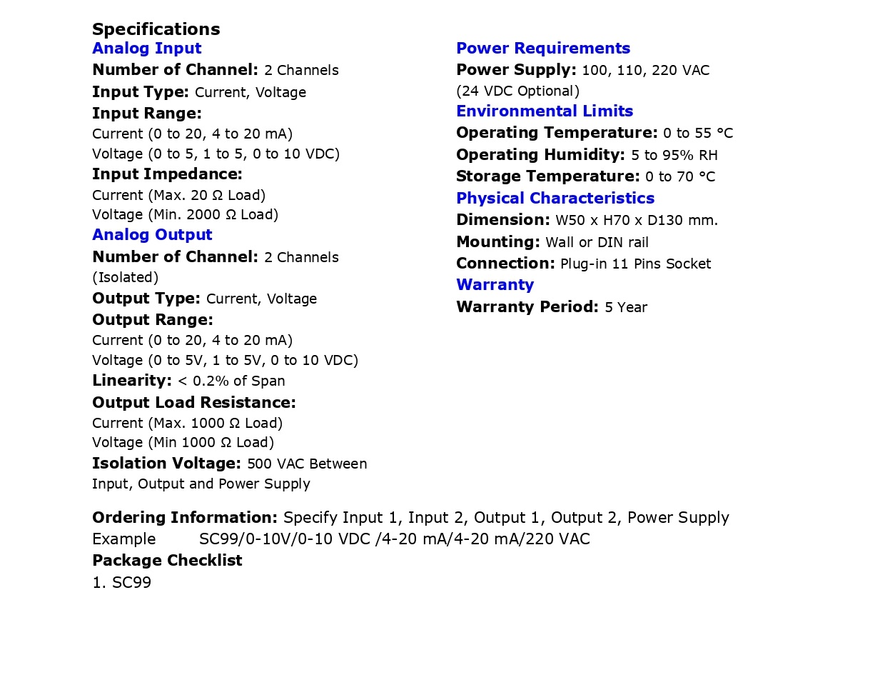 Signal Converter SC99 accepts any standard input signals and converts to two isolated outputs signals. Low input resistance to current signals and high input resistance to voltage signals mean the signal converter can be inserted into existing system with no loss of performance. To minimize noise and other signal errors, the Signal Converter also features complete galvanic isolation of input, output and power supply.