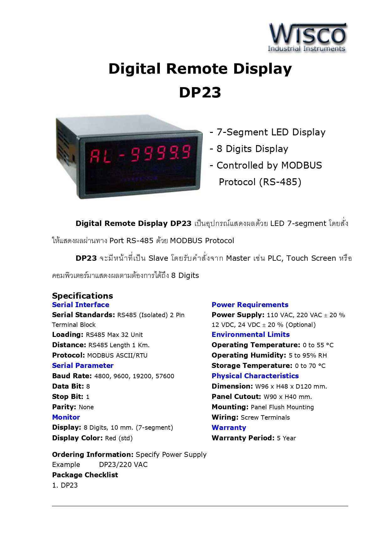 | ไฮไลท์ | Digital Remote Display DP23 เป็นอุปกรณ์แสดงผลด้วย LED 7-segment โดยสั่งให้แสดงผลผ่านทาง Port RS-485 ด้วย MODBUS Protocol DP23 จะมีหน้าที่เป็น Slave โดยรับคำสั่งจาก Master เช่น PLC, Touch Screen หรือ คอมพิวเตอร์มาแสดงผลตามต้องการได้ถึง 8 Digits ______________________________________________________ Product : - 7-Segment LED Display - 8 Digits Display - Controlled by MODBUS Protocol (RS-485) ______________________________________________________ >>> หมายเหตุ : • ราคารวมภาษีมูลค่าเพิ่มแล้ว • กรณีมีสินค้าสต๊อกระยะจัดส่งสินค้าภายใน 4-7 วันทำการ • กรณีสินค้าหมดระยะจัดส่งสินค้าภายใน 3-4 สัปดาห์ • ฟรีค่าบริการจัดส่งสินค้า โดยบริษัทขนส่งเอกชน เช่น ปณ. ด่วน EMS, KEX Express, Flash Express เท่านั้น • สามารถเช็คสต๊อกสินค้าก่อนทำการสั่งซื้อได้ที่ @Line ID : kdnautomation • ลูกค้าตรวจสอบ Spec สินค้าก่อนทำการสั่งซื้อทุกครั้ง กรณีสั่งซื้อแล้วไม่รับเปลี่ยน-คืน ______________________________________________________ >>> ติดต่อสอบถามข้อมูลเพิ่มเติม : • Line Official : kdnautomation • E-Mail: kdnautomation@gmail.com • Tel : 082-550-3096, 02-023-3038 • Website : www.kdnautomation.co.th • เวลาทำการบริษัท วันจันทร์ - วันศุกร์ เวลา 08.00 - 17.00 น. ( หยุดวันนักขัตฤกษ์ ) ______________________________________________________ >>> บริการติดตั้ง : • ทางบริษัทจำหน่ายอุปกรณ์อิเล็กทรอนิกส์ ออกแบบ ติดตั้งและซ่อมแซม ปรับปรุงเครื่องจักรในโรงงานอุตสาหกรรม รวมถึงการให้บริการเขียนโปรแกรม และพัฒนาระบบควบคุมอัตโนมัติแบบครบวงจร ทั้งนี้ลูกค้าสามารถส่งรายละเอียด มาได้ที่ E-mail : kdnautomation@gmail.com เพื่อประเมินราคา |