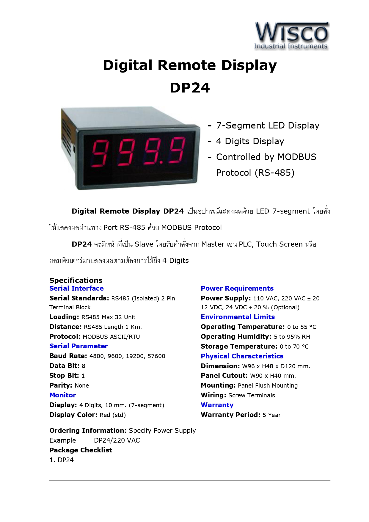| ไฮไลท์ | Digital Remote Display DP24 เป็นอุปกรณ์แสดงผลด้วย LED 7-segment โดยสั่งให้แสดงผลผ่านทาง Port RS-485 ด้วย MODBUS Protocol DP24 จะมีหน้าที่เป็น Slave โดยรับคำสั่งจาก Master เช่น PLC, Touch Screen หรือ คอมพิวเตอร์มาแสดงผลตามต้องการได้ถึง 4 Digits ______________________________________________________ Product : - 7-Segment LED Display - 4 Digits Display - Controlled by MODBUS Protocol (RS-485) ______________________________________________________ >>> หมายเหตุ : • ราคารวมภาษีมูลค่าเพิ่มแล้ว • กรณีมีสินค้าสต๊อกระยะจัดส่งสินค้าภายใน 4-7 วันทำการ • กรณีสินค้าหมดระยะจัดส่งสินค้าภายใน 3-4 สัปดาห์ • ฟรีค่าบริการจัดส่งสินค้า โดยบริษัทขนส่งเอกชน เช่น ปณ. ด่วน EMS, KEX Express, Flash Express เท่านั้น • สามารถเช็คสต๊อกสินค้าก่อนทำการสั่งซื้อได้ที่ @Line ID : kdnautomation • ลูกค้าตรวจสอบ Spec สินค้าก่อนทำการสั่งซื้อทุกครั้ง กรณีสั่งซื้อแล้วไม่รับเปลี่ยน-คืน ______________________________________________________ >>> ติดต่อสอบถามข้อมูลเพิ่มเติม : • Line Official : kdnautomation • E-Mail: kdnautomation@gmail.com • Tel : 082-550-3096, 02-023-3038 • Website : www.kdnautomation.co.th • เวลาทำการบริษัท วันจันทร์ - วันศุกร์ เวลา 08.00 - 17.00 น. ( หยุดวันนักขัตฤกษ์ ) ______________________________________________________ >>> บริการติดตั้ง : • ทางบริษัทจำหน่ายอุปกรณ์อิเล็กทรอนิกส์ ออกแบบ ติดตั้งและซ่อมแซม ปรับปรุงเครื่องจักรในโรงงานอุตสาหกรรม รวมถึงการให้บริการเขียนโปรแกรม และพัฒนาระบบควบคุมอัตโนมัติแบบครบวงจร ทั้งนี้ลูกค้าสามารถส่งรายละเอียด มาได้ที่ E-mail : kdnautomation@gmail.com เพื่อประเมินราคา |