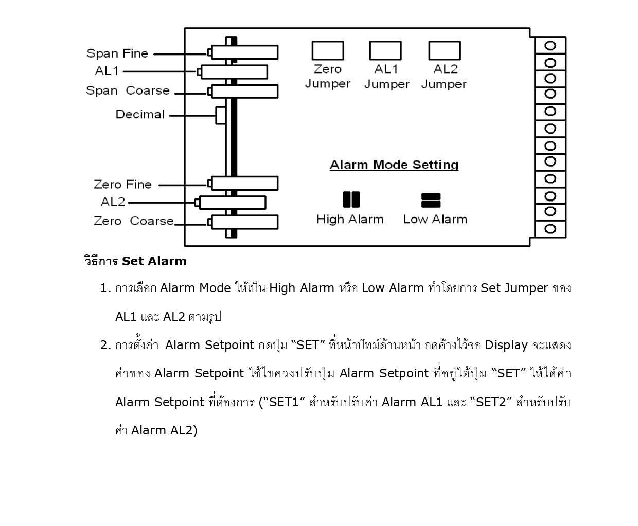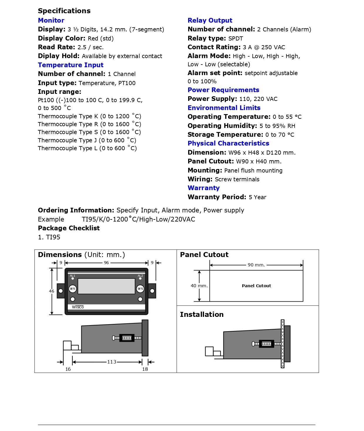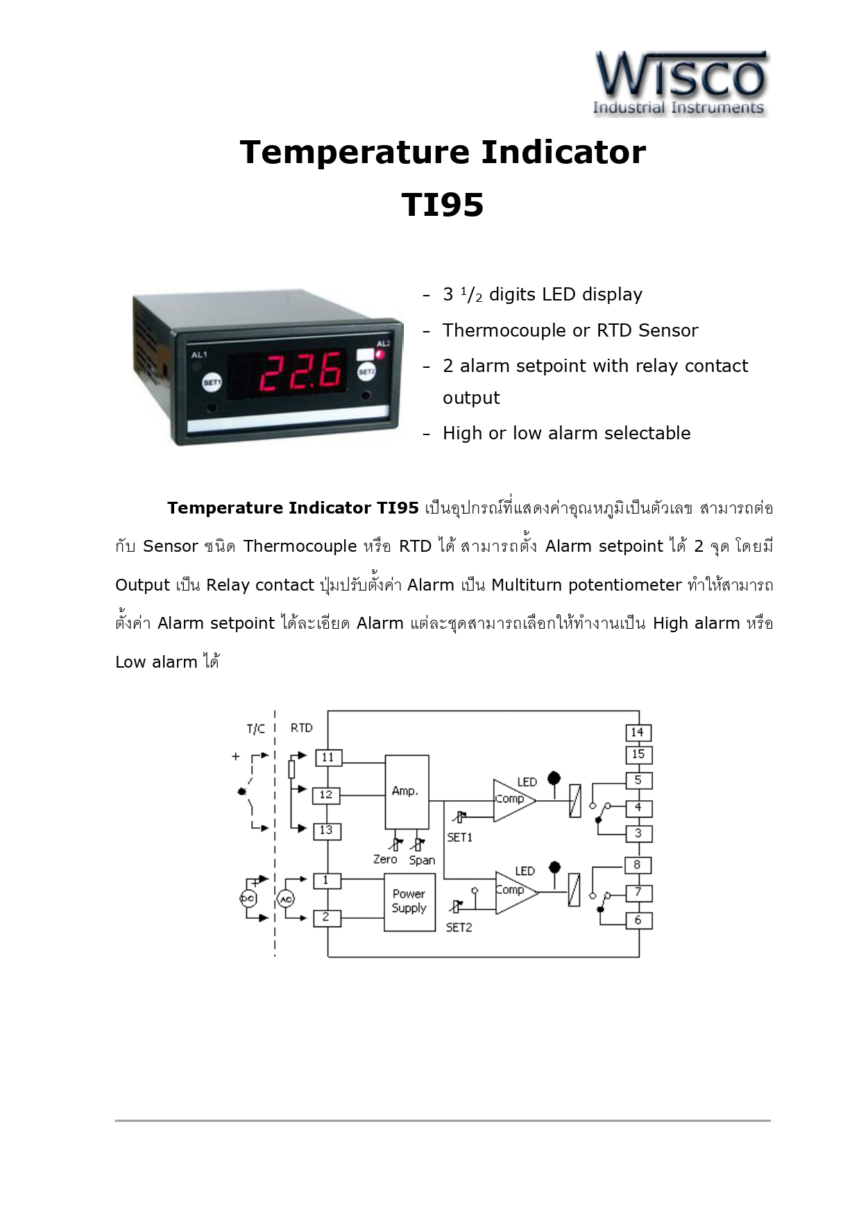 | ไฮไลท์ | Temperature Indicator TI95 เป็นอุปกรณ์ที่แสดงค่าอุณหภูมิเป็นตัวเลข สามารถต่อกับ Sensor ชนิด Thermocouple หรือ RTD ได้ สามารถตั้ง Alarm setpoint ได้ 2 จุด โดยมี Output เป็น Relay contact ปุ่มปรับตั้งค่า Alarm เป็น Multiturn potentiometer ทำให้สามารถ ตั้งค่า Alarm setpoint ได้ละเอียด Alarm แต่ละชุดสามารถเลือกให้ทำงานเป็น High alarm หรือ Low alarm ได้ ______________________________________________________ Product : - 3 ½ digits LED display - Thermocouple or RTD Sensor - 2 alarm setpoint with relay contact output - High or low alarm selectable ______________________________________________________ >>> หมายเหตุ : • ราคารวมภาษีมูลค่าเพิ่มแล้ว • กรณีมีสินค้าสต๊อกระยะจัดส่งสินค้าภายใน 4-7 วันทำการ • กรณีสินค้าหมดระยะจัดส่งสินค้าภายใน 3-4 สัปดาห์ • ฟรีค่าบริการจัดส่งสินค้า โดยบริษัทขนส่งเอกชน เช่น ปณ. ด่วน EMS, KEX Express, Flash Express เท่านั้น • สามารถเช็คสต๊อกสินค้าก่อนทำการสั่งซื้อได้ที่ @Line ID : kdnautomation • ลูกค้าตรวจสอบ Spec สินค้าก่อนทำการสั่งซื้อทุกครั้ง กรณีสั่งซื้อแล้วไม่รับเปลี่ยน-คืน ______________________________________________________ >>> ติดต่อสอบถามข้อมูลเพิ่มเติม : • Line Official : kdnautomation • E-Mail: kdnautomation@gmail.com • Tel : 082-550-3096, 02-023-3038 • Website : www.kdnautomation.co.th • เวลาทำการบริษัท วันจันทร์ - วันศุกร์ เวลา 08.00 - 17.00 น. ( หยุดวันนักขัตฤกษ์ ) ______________________________________________________ >>> บริการติดตั้ง : • ทางบริษัทจำหน่ายอุปกรณ์อิเล็กทรอนิกส์ ออกแบบ ติดตั้งและซ่อมแซม ปรับปรุงเครื่องจักรในโรงงานอุตสาหกรรม รวมถึงการให้บริการเขียนโปรแกรม และพัฒนาระบบควบคุมอัตโนมัติแบบครบวงจร ทั้งนี้ลูกค้าสามารถส่งรายละเอียด มาได้ที่ E-mail : kdnautomation@gmail.com เพื่อประเมินราคา |