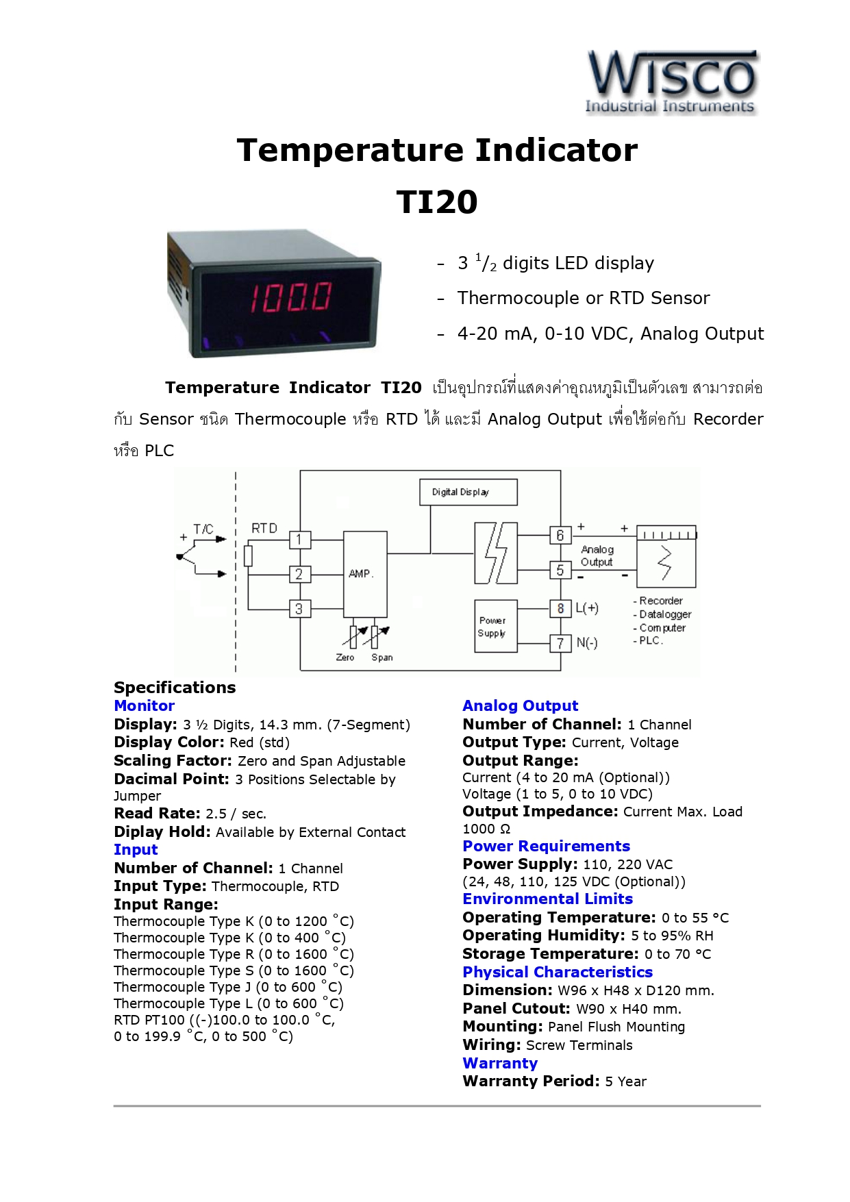 | ไฮไลท์ | Temperature Indicator TI20 เป็นอุปกรณ์ที่แสดงค่าอุณหภูมิเป็นตัวเลข สามารถต่อกับ Sensor ชนิด Thermocouple หรือ RTD ได้ และมี Analog Output เพื่อใช้ต่อกับ Recorder หรือ PLC ______________________________________________________ Product : - 3 ½ digits LED display - Thermocouple or RTD Sensor - 4-20 mA, 0-10 VDC, Analog Output ______________________________________________________ >>> หมายเหตุ : • ราคารวมภาษีมูลค่าเพิ่มแล้ว • กรณีมีสินค้าสต๊อกระยะจัดส่งสินค้าภายใน 4-7 วันทำการ • กรณีสินค้าหมดระยะจัดส่งสินค้าภายใน 3-4 สัปดาห์ • ฟรีค่าบริการจัดส่งสินค้า โดยบริษัทขนส่งเอกชน เช่น ปณ. ด่วน EMS, KEX Express, Flash Express เท่านั้น • สามารถเช็คสต๊อกสินค้าก่อนทำการสั่งซื้อได้ที่ @Line ID : kdnautomation • ลูกค้าตรวจสอบ Spec สินค้าก่อนทำการสั่งซื้อทุกครั้ง กรณีสั่งซื้อแล้วไม่รับเปลี่ยน-คืน ______________________________________________________ >>> ติดต่อสอบถามข้อมูลเพิ่มเติม : • Line Official : kdnautomation • E-Mail: kdnautomation@gmail.com • Tel : 082-550-3096, 02-023-3038 • Website : www.kdnautomation.co.th • เวลาทำการบริษัท วันจันทร์ - วันศุกร์ เวลา 08.00 - 17.00 น. ( หยุดวันนักขัตฤกษ์ ) ______________________________________________________ >>> บริการติดตั้ง : • ทางบริษัทจำหน่ายอุปกรณ์อิเล็กทรอนิกส์ ออกแบบ ติดตั้งและซ่อมแซม ปรับปรุงเครื่องจักรในโรงงานอุตสาหกรรม รวมถึงการให้บริการเขียนโปรแกรม และพัฒนาระบบควบคุมอัตโนมัติแบบครบวงจร ทั้งนี้ลูกค้าสามารถส่งรายละเอียด มาได้ที่ E-mail : kdnautomation@gmail.com เพื่อประเมินราคา |