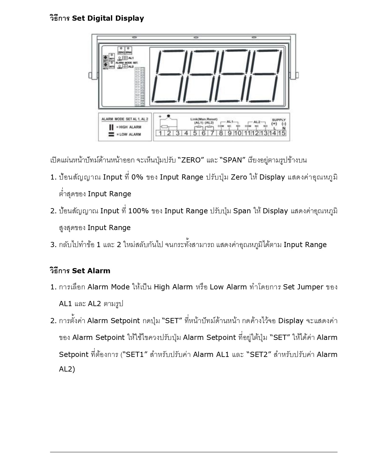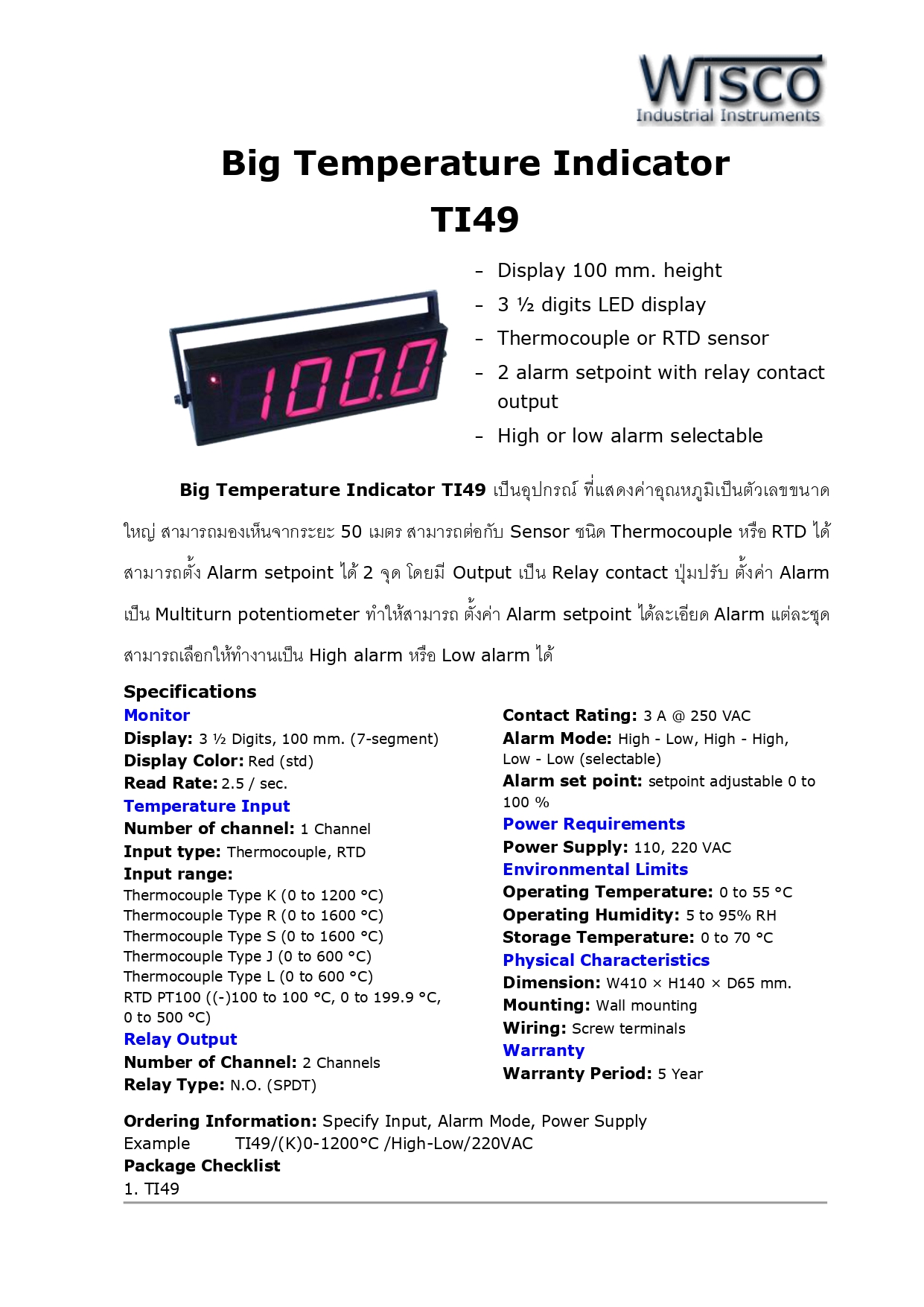 | ไฮไลท์ | Big Temperature Indicator TI49 เป็นอุปกรณ์ ที่แสดงค่าอุณหภูมิเป็นตัวเลขขนาดใหญ่ สามารถมองเห็นจากระยะ 50 เมตร สามารถต่อกับ Sensor ชนิด Thermocouple หรือ RTD ได้ สามารถตั้ง Alarm setpoint ได้ 2 จุด โดยมี Output เป็น Relay contact ปุ่มปรับ ตั้งค่า Alarm เป็น Multiturn potentiometer ทำให้สามารถ ตั้งค่า Alarm setpoint ได้ละเอียด Alarm แต่ละชุดสามารถเลือกให้ทำงานเป็น High alarm หรือ Low alarm ได้ ______________________________________________________ Product : - Display 100 mm. height - 3 ½ digits LED display - Thermocouple or RTD sensor - 2 alarm setpoint with relay contact output - High or low alarm selectable ______________________________________________________ >>> หมายเหตุ : • ราคารวมภาษีมูลค่าเพิ่มแล้ว • กรณีมีสินค้าสต๊อกระยะจัดส่งสินค้าภายใน 4-7 วันทำการ • กรณีสินค้าหมดระยะจัดส่งสินค้าภายใน 3-4 สัปดาห์ • ฟรีค่าบริการจัดส่งสินค้า โดยบริษัทขนส่งเอกชน เช่น ปณ. ด่วน EMS, KEX Express, Flash Express เท่านั้น • สามารถเช็คสต๊อกสินค้าก่อนทำการสั่งซื้อได้ที่ @Line ID : kdnautomation • ลูกค้าตรวจสอบ Spec สินค้าก่อนทำการสั่งซื้อทุกครั้ง กรณีสั่งซื้อแล้วไม่รับเปลี่ยน-คืน ______________________________________________________ >>> ติดต่อสอบถามข้อมูลเพิ่มเติม : • Line Official : kdnautomation • E-Mail: kdnautomation@gmail.com • Tel : 082-550-3096, 02-023-3038 • Website : www.kdnautomation.co.th • เวลาทำการบริษัท วันจันทร์ - วันศุกร์ เวลา 08.00 - 17.00 น. ( หยุดวันนักขัตฤกษ์ ) ______________________________________________________ >>> บริการติดตั้ง : • ทางบริษัทจำหน่ายอุปกรณ์อิเล็กทรอนิกส์ ออกแบบ ติดตั้งและซ่อมแซม ปรับปรุงเครื่องจักรในโรงงานอุตสาหกรรม รวมถึงการให้บริการเขียนโปรแกรม และพัฒนาระบบควบคุมอัตโนมัติแบบครบวงจร ทั้งนี้ลูกค้าสามารถส่งรายละเอียด มาได้ที่ E-mail : kdnautomation@gmail.com เพื่อประเมินราคา |