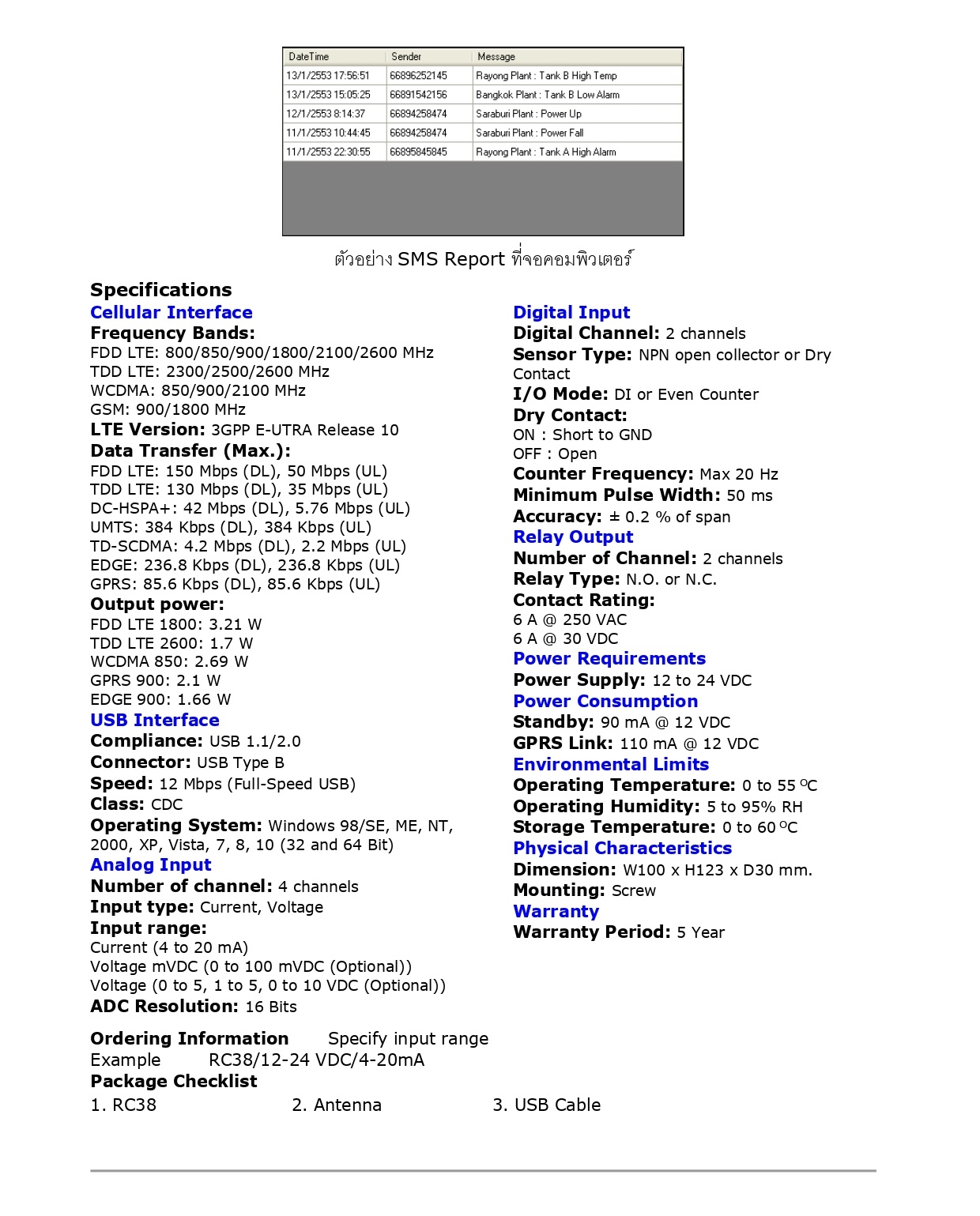 | ไฮไลท์ | GSM Alarm RC38 เป็นอุปกรณ์ที่ใช้สำหรับการแจ้งเตือนเมื่อได้รับสัญญาณการเกิด Alarm จากภายนอก RC38 จะส่งข้อความแจ้งเตือนไปยังเบอร์โทรศัพท์ซึ่งถูกโปรแกรมไว้ล่วงหน้า การโปรแกรมข้อความและเบอร์โทรศัพท์สามารถโปรแกรมได้โดยผ่านทางเครื่องคอมพิวเตอร์ RC38 สามารถใช้งานได้ดังต่อไปนี้ 1. Analog Input Alarm สามารถตั้งค่า Alarm ได้ 2 ค่า คือ High-Alarm และ Low-Alarm เมื่อเกิด Alarm RC38 จะส่ง SMS ออกไป 2. Digital Input Alarm สามารถเลือกให้ทำงานได้เป็น Counter-Mode หรือ Status-Mode 2.1. Counter-Mode จะส่ง SMS ไปเมื่อ Counter นับค่าถึงค่า Setpoint ที่ตั้งไว้ 2.2. Status-Mode จะส่ง SMS ไปเมื่อมีการเปลี่ยนแปลง Digital Input 3. Digital Output สามารถส่ง SMS มาควบคุมการ ON-OFF ของ Digital Output ได้ 4. Read Out สามารถส่ง SMS มาเพื่อทำการอ่านค่าวัดจาก RC38 ได้ ______________________________________________________ Product : - 4 Analog Channels High-Low Alarm - 2 Digital (Counter or Status) Alarm - Programmable SMS Message - Two Relay Output Control VIA SMS - Read Out VIA SMS - Built-in 3G Modem (UMTS/HSDPA) ______________________________________________________ >>> หมายเหตุ : • ราคารวมภาษีมูลค่าเพิ่มแล้ว • กรณีมีสินค้าสต๊อกระยะจัดส่งสินค้าภายใน 4-7 วันทำการ • กรณีสินค้าหมดระยะจัดส่งสินค้าภายใน 3-4 สัปดาห์ • ฟรีค่าบริการจัดส่งสินค้า โดยบริษัทขนส่งเอกชน เช่น ปณ. ด่วน EMS, KEX Express, Flash Express เท่านั้น • สามารถเช็คสต๊อกสินค้าก่อนทำการสั่งซื้อได้ที่ @Line ID : kdnautomation • ลูกค้าตรวจสอบ Spec สินค้าก่อนทำการสั่งซื้อทุกครั้ง กรณีสั่งซื้อแล้วไม่รับเปลี่ยน-คืน ______________________________________________________ >>> ติดต่อสอบถามข้อมูลเพิ่มเติม : • Line Official : kdnautomation • E-Mail: kdnautomation@gmail.com • Tel : 082-550-3096, 02-023-3038 • Website : www.kdnautomation.co.th • เวลาทำการบริษัท วันจันทร์ - วันศุกร์ เวลา 08.00 - 17.00 น. ( หยุดวันนักขัตฤกษ์ ) ______________________________________________________ >>> บริการติดตั้ง : • ทางบริษัทจำหน่ายอุปกรณ์อิเล็กทรอนิกส์ ออกแบบ ติดตั้งและซ่อมแซม ปรับปรุงเครื่องจักรในโรงงานอุตสาหกรรม รวมถึงการให้บริการเขียนโปรแกรม และพัฒนาระบบควบคุมอัตโนมัติแบบครบวงจร ทั้งนี้ลูกค้าสามารถส่งรายละเอียด มาได้ที่ E-mail : kdnautomation@gmail.com เพื่อประเมินราคา |