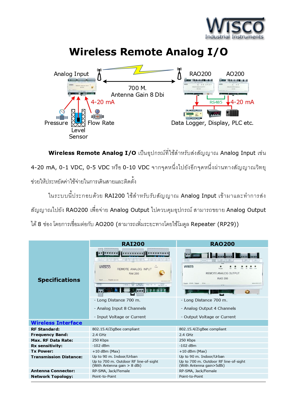Wireless Remote Analog I/O เป็นอุปกรณ์ที่ใช้สำหรับส่งสัญญาณ Analog Input เช่น 4-20 mA, 0-1 VDC, 0-5 VDC หรือ 0-10 VDC จากจุดหนึ่งไปยังอีกจุดหนึ่งผ่านทางสัญญาณวิทยุ ช่วยให้ประหยัดค่าใช้จ่ายในการเดินสายและติดตั้ง