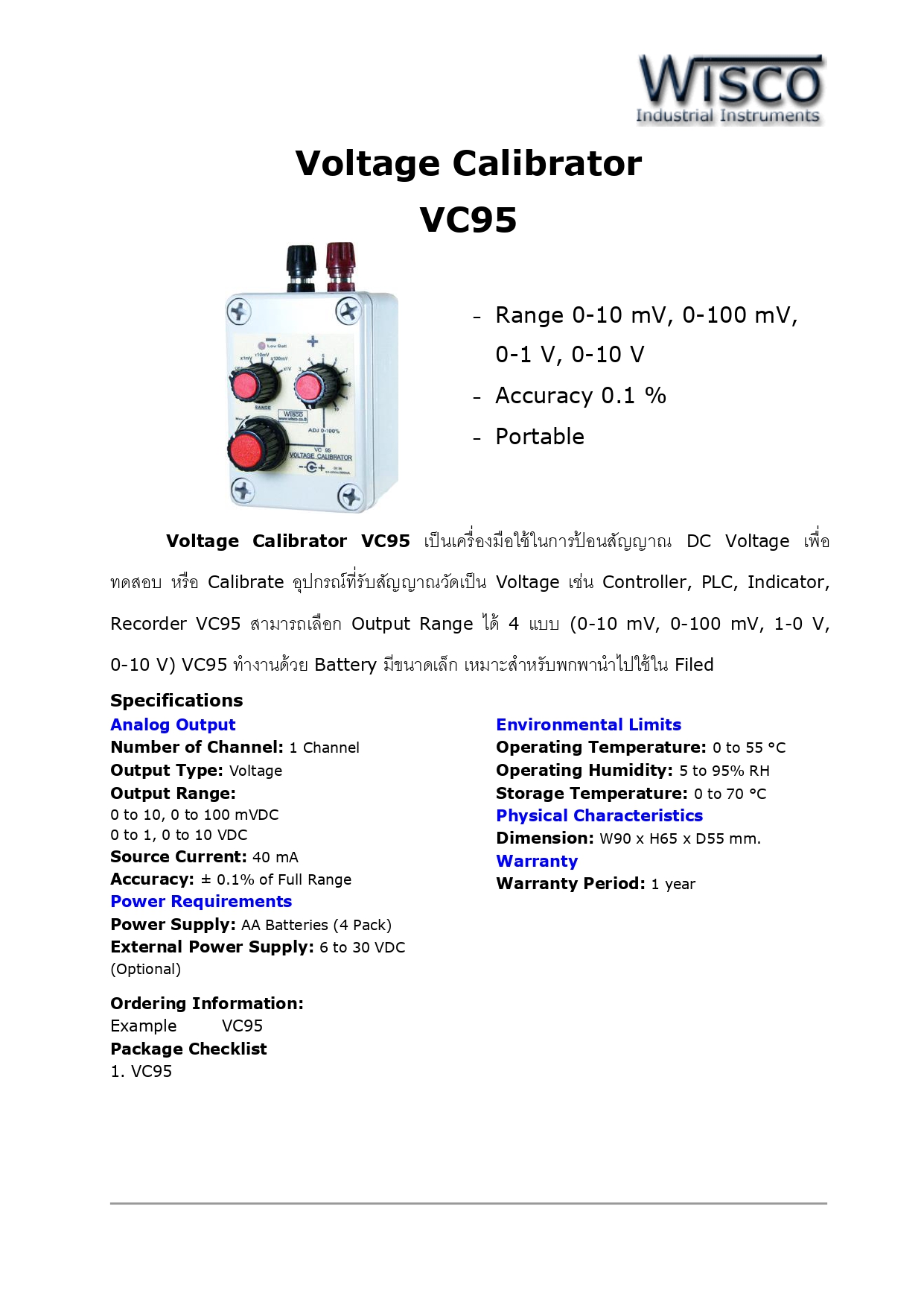 | ไฮไลท์ | Voltage Calibrator VC95 เป็นเครื่องมือใช้ในการป้อนสัญญาณ DC Voltage เพื่อทดสอบ หรือ Calibrate อุปกรณ์ที่รับสัญญาณวัดเป็น Voltage เช่น Controller, PLC, Indicator, Recorder VC95 สามารถเลือก Output Range ได้ 4 แบบ (0-10 mV, 0-100 mV, 1-0 V, 0-10 V) VC95 ทำงานด้วย Battery มีขนาดเล็ก เหมาะสำหรับพกพานำไปใช้ใน Filed ______________________________________________________ Product : - Range 0 to 10mV, 0 to 100mV, 0 to1V, 0 to 10V - Accuracy 0.1 % - Portable ______________________________________________________ >>> หมายเหตุ : • ราคารวมภาษีมูลค่าเพิ่มแล้ว • กรณีมีสินค้าสต๊อกระยะจัดส่งสินค้าภายใน 4-7 วันทำการ • กรณีสินค้าหมดระยะจัดส่งสินค้าภายใน 3-4 สัปดาห์ • ฟรีค่าบริการจัดส่งสินค้า โดยบริษัทขนส่งเอกชน เช่น ปณ. ด่วน EMS, KEX Express, Flash Express เท่านั้น • สามารถเช็คสต๊อกสินค้าก่อนทำการสั่งซื้อได้ที่ @Line ID : kdnautomation • ลูกค้าตรวจสอบ Spec สินค้าก่อนทำการสั่งซื้อทุกครั้ง กรณีสั่งซื้อแล้วไม่รับเปลี่ยน-คืน ______________________________________________________ >>> ติดต่อสอบถามข้อมูลเพิ่มเติม : • Line Official : kdnautomation • E-Mail: kdnautomation@gmail.com • Tel : 082-550-3096, 02-023-3038 • Website : www.kdnautomation.co.th • เวลาทำการบริษัท วันจันทร์ - วันศุกร์ เวลา 08.00 - 17.00 น. ( หยุดวันนักขัตฤกษ์ ) ______________________________________________________ >>> บริการติดตั้ง : • ทางบริษัทจำหน่ายอุปกรณ์อิเล็กทรอนิกส์ ออกแบบ ติดตั้งและซ่อมแซม ปรับปรุงเครื่องจักรในโรงงานอุตสาหกรรม รวมถึงการให้บริการเขียนโปรแกรม และพัฒนาระบบควบคุมอัตโนมัติแบบครบวงจร ทั้งนี้ลูกค้าสามารถส่งรายละเอียด มาได้ที่ E-mail : kdnautomation@gmail.com เพื่อประเมินราคา |