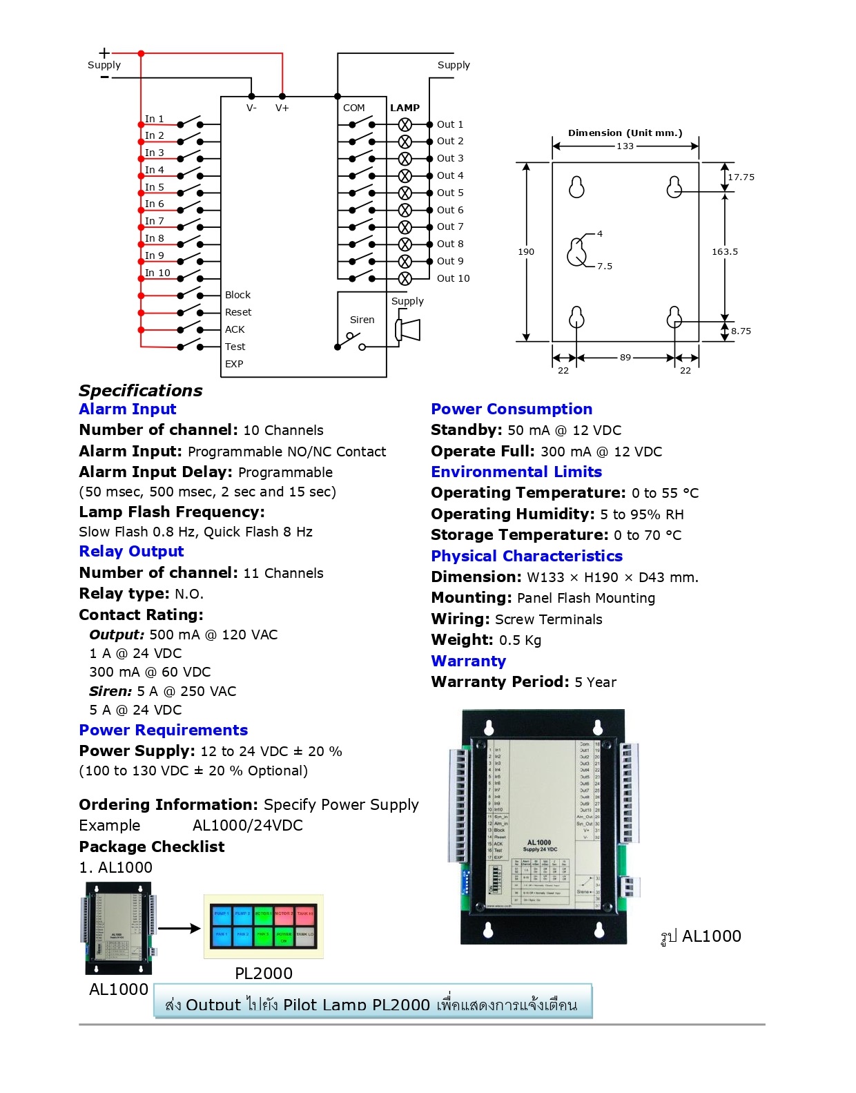 | ไฮไลท์ | AL1000 เป็นอุปกรณ์ตรวจจับ, แสดงผล และส่งสัญญาณเตือนเมื่อเกิด Alarm ในระบบ โดยทั่วไปแล้วในระบบควบคุมต่างๆจะมีการตรวจสอบค่าวัดต่างๆ เช่น อุณหภูมิ, ความดัน, ความเร็วของมอเตอร์ เป็นต้น เพื่อป้องกันความเสียหายที่จะเกิดขึ้นในระบบ ถ้าเกิดความผิดปกติขึ้นระบบตรวจสอบจะแจ้งเตือนให้ผู้ดูแลระบบทราบเพื่อที่จะทำการแก้ไขต่อไป ในบางครั้ง Alarm ที่เกิดขึ้นที่จุดหนึ่งส่งผลให้จุดอื่นๆ เกิด Alarm ตามมาในเวลาที่ใกล้เคียงกัน เป็นการยากที่ผู้ดูแลจะตรวจหาต้นเหตุของความผิดพลาดที่เกิดขึ้น ด้วยเหตุนี้ AL1000 จึงถูกออกแบบให้ทำงานโดยเมื่อเกิด Alarm ขึ้น LED Alarm ของ Channel ที่เกิด Alarm เป็น Channel แรกจะกระพริบเร็ว (Quick Flash) ส่วน LED Alarm ของ Channel อื่นที่เกิด Alarm ตามมาจะกระพริบช้า (Slow Flash) และ Siren Relay จะ ON เมื่อเกิด Alarm ช่องใดช่องหนึ่งเกิดขึ้นและจะ OFF เมื่อกดปุ่ม “ACK” ที่เกิด Alarm หลอด LED Alarm จะติดสว่างค้างไว้จนกระทั่ง Alarm ถูกแก้ไขแล้วกดปุ่ม “RESET” LED Alarm จึงจะดับ ในกรณีที่ระบบ Alarm ต้องใช้ Input มากกว่า 10 Channels AL1000 สามารถต่อพ่วงกันเพื่อขยายจำนวน Input Channel ได้ ______________________________________________________ Product : - 10 Channels Input - Siren Relay Output - First Alarm Detect - Expandable Input Channel ______________________________________________________ >>> หมายเหตุ : • ราคารวมภาษีมูลค่าเพิ่มแล้ว • กรณีมีสินค้าสต๊อกระยะจัดส่งสินค้าภายใน 4-7 วันทำการ • กรณีสินค้าหมดระยะจัดส่งสินค้าภายใน 3-4 สัปดาห์ • ฟรีค่าบริการจัดส่งสินค้า โดยบริษัทขนส่งเอกชน เช่น ปณ. ด่วน EMS, KEX Express, Flash Express เท่านั้น • สามารถเช็คสต๊อกสินค้าก่อนทำการสั่งซื้อได้ที่ @Line ID : kdnautomation • ลูกค้าตรวจสอบ Spec สินค้าก่อนทำการสั่งซื้อทุกครั้ง กรณีสั่งซื้อแล้วไม่รับเปลี่ยน-คืน ______________________________________________________ >>> ติดต่อสอบถามข้อมูลเพิ่มเติม : • Line Official : kdnautomation • E-Mail: kdnautomation@gmail.com • Tel : 082-550-3096, 02-023-3038 • Website : www.kdnautomation.co.th • เวลาทำการบริษัท วันจันทร์ - วันศุกร์ เวลา 08.00 - 17.00 น. ( หยุดวันนักขัตฤกษ์ ) ______________________________________________________ >>> บริการติดตั้ง : • ทางบริษัทจำหน่ายอุปกรณ์อิเล็กทรอนิกส์ ออกแบบ ติดตั้งและซ่อมแซม ปรับปรุงเครื่องจักรในโรงงานอุตสาหกรรม รวมถึงการให้บริการเขียนโปรแกรม และพัฒนาระบบควบคุมอัตโนมัติแบบครบวงจร ทั้งนี้ลูกค้าสามารถส่งรายละเอียด มาได้ที่ E-mail : kdnautomation@gmail.com เพื่อประเมินราคา |