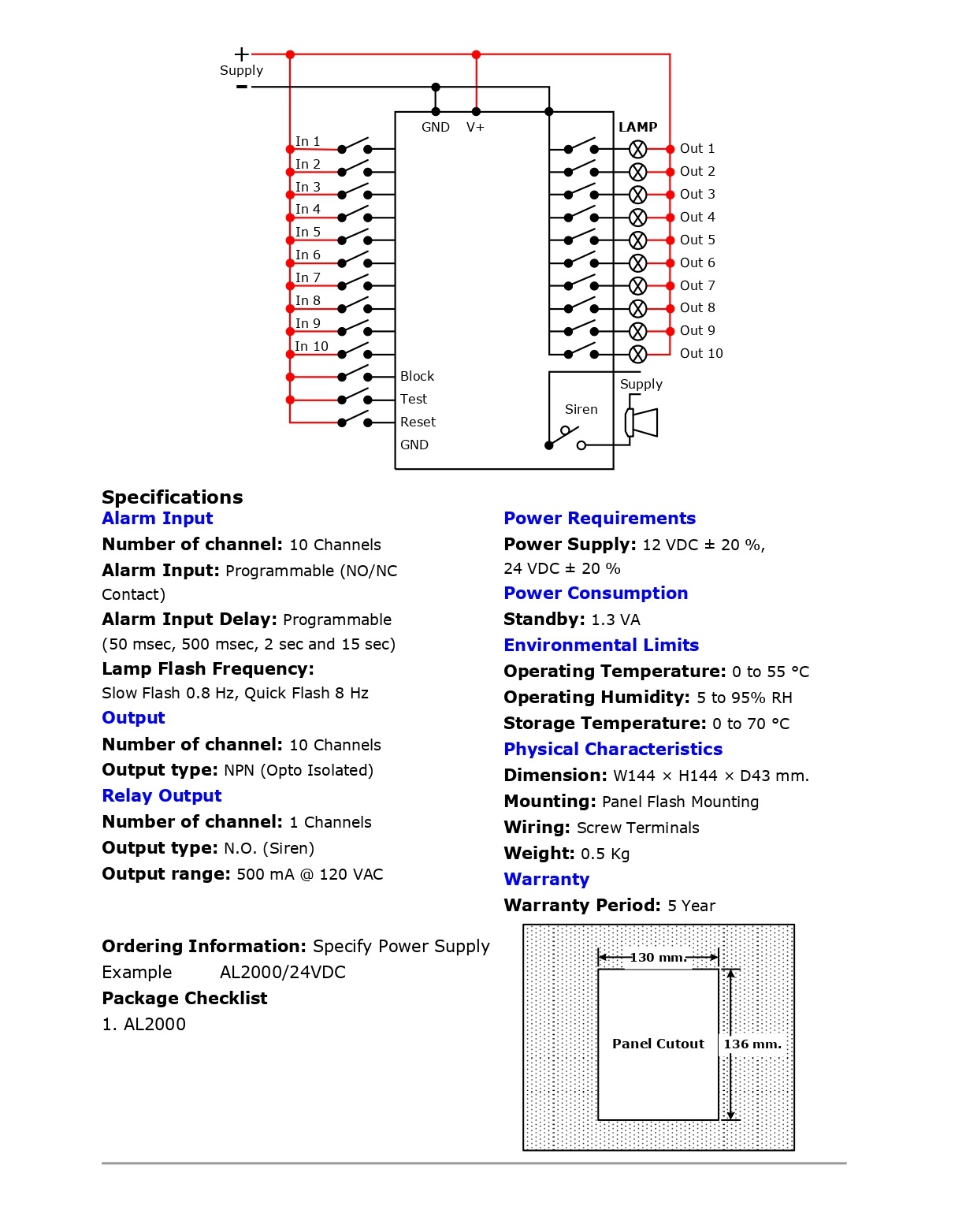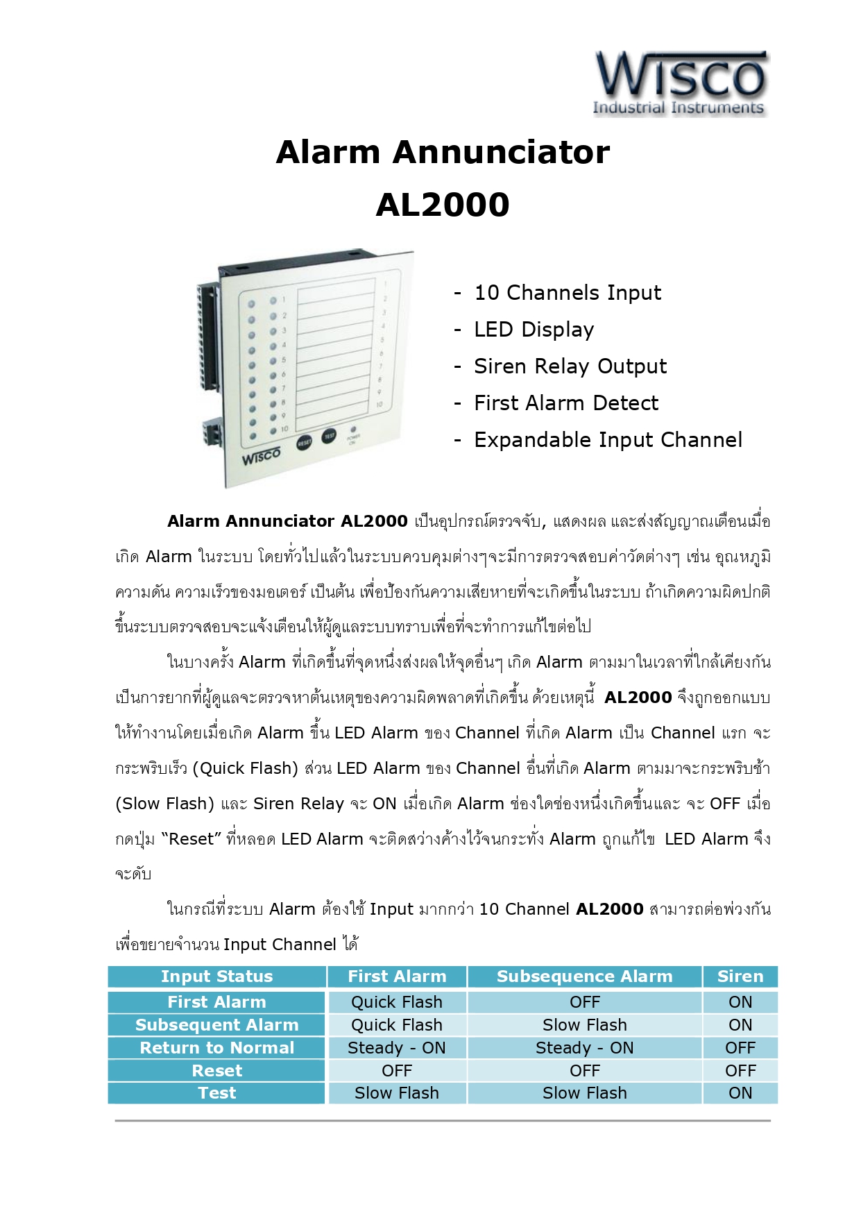 | ไฮไลท์ | Alarm Annunciator AL2000 เป็นอุปกรณ์ตรวจจับ, แสดงผล และส่งสัญญาณเตือนเมื่อเกิด Alarm ในระบบ โดยทั่วไปแล้วในระบบควบคุมต่างๆจะมีการตรวจสอบค่าวัดต่างๆ เช่น อุณหภูมิ ความดัน ความเร็วของมอเตอร์ เป็นต้น เพื่อป้องกันความเสียหายที่จะเกิดขึ้นในระบบ ถ้าเกิดความผิดปกติขึ้นระบบตรวจสอบจะแจ้งเตือนให้ผู้ดูแลระบบทราบเพื่อที่จะทำการแก้ไขต่อไป ในบางครั้ง Alarm ที่เกิดขึ้นที่จุดหนึ่งส่งผลให้จุดอื่นๆ เกิด Alarm ตามมาในเวลาที่ใกล้เคียงกัน เป็นการยากที่ผู้ดูแลจะตรวจหาต้นเหตุของความผิดพลาดที่เกิดขึ้น ด้วยเหตุนี้ AL2000 จึงถูกออกแบบให้ทำงานโดยเมื่อเกิด Alarm ขึ้น LED Alarm ของ Channel ที่เกิด Alarm เป็น Channel แรก จะกระพริบเร็ว (Quick Flash) ส่วน LED Alarm ของ Channel อื่นที่เกิด Alarm ตามมาจะกระพริบช้า (Slow Flash) และ Siren Relay จะ ON เมื่อเกิด Alarm ช่องใดช่องหนึ่งเกิดขึ้นและ จะ OFF เมื่อกดปุ่ม “Reset” ที่หลอด LED Alarm จะติดสว่างค้างไว้จนกระทั่ง Alarm ถูกแก้ไข LED Alarm จึงจะดับ กรณีที่ระบบ Alarm ต้องใช้ Input มากกว่า 10 Channel AL2000 สามารถต่อพ่วงกันเพื่อขยายจำนวน Input Channel ได้ ______________________________________________________ Product : - 10 Channels Input - LED Display - Siren Relay Output - First Alarm Detect - Expandable Input Channel ______________________________________________________ >>> หมายเหตุ : • ราคารวมภาษีมูลค่าเพิ่มแล้ว • กรณีมีสินค้าสต๊อกระยะจัดส่งสินค้าภายใน 4-7 วันทำการ • กรณีสินค้าหมดระยะจัดส่งสินค้าภายใน 3-4 สัปดาห์ • ฟรีค่าบริการจัดส่งสินค้า โดยบริษัทขนส่งเอกชน เช่น ปณ. ด่วน EMS, KEX Express, Flash Express เท่านั้น • สามารถเช็คสต๊อกสินค้าก่อนทำการสั่งซื้อได้ที่ @Line ID : kdnautomation • ลูกค้าตรวจสอบ Spec สินค้าก่อนทำการสั่งซื้อทุกครั้ง กรณีสั่งซื้อแล้วไม่รับเปลี่ยน-คืน ______________________________________________________ >>> ติดต่อสอบถามข้อมูลเพิ่มเติม : • Line Official : kdnautomation • E-Mail: kdnautomation@gmail.com • Tel : 082-550-3096, 02-023-3038 • Website : www.kdnautomation.co.th • เวลาทำการบริษัท วันจันทร์ - วันศุกร์ เวลา 08.00 - 17.00 น. ( หยุดวันนักขัตฤกษ์ ) ______________________________________________________ >>> บริการติดตั้ง : • ทางบริษัทจำหน่ายอุปกรณ์อิเล็กทรอนิกส์ ออกแบบ ติดตั้งและซ่อมแซม ปรับปรุงเครื่องจักรในโรงงานอุตสาหกรรม รวมถึงการให้บริการเขียนโปรแกรม และพัฒนาระบบควบคุมอัตโนมัติแบบครบวงจร ทั้งนี้ลูกค้าสามารถส่งรายละเอียด มาได้ที่ E-mail : kdnautomation@gmail.com เพื่อประเมินราคา |
