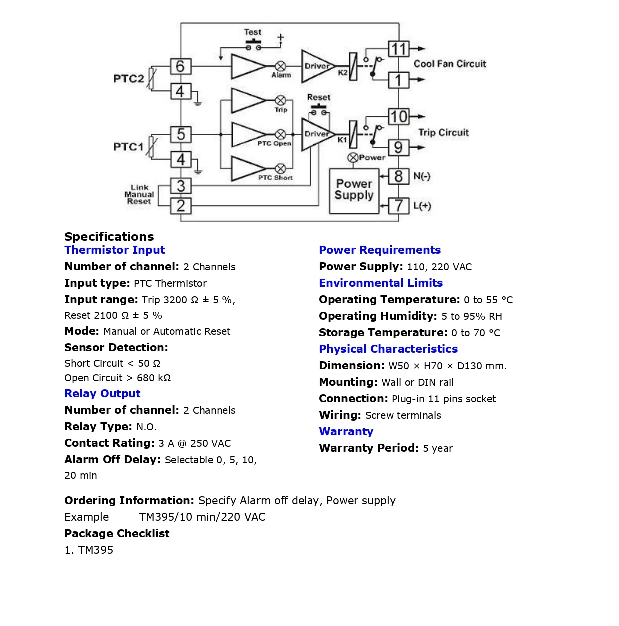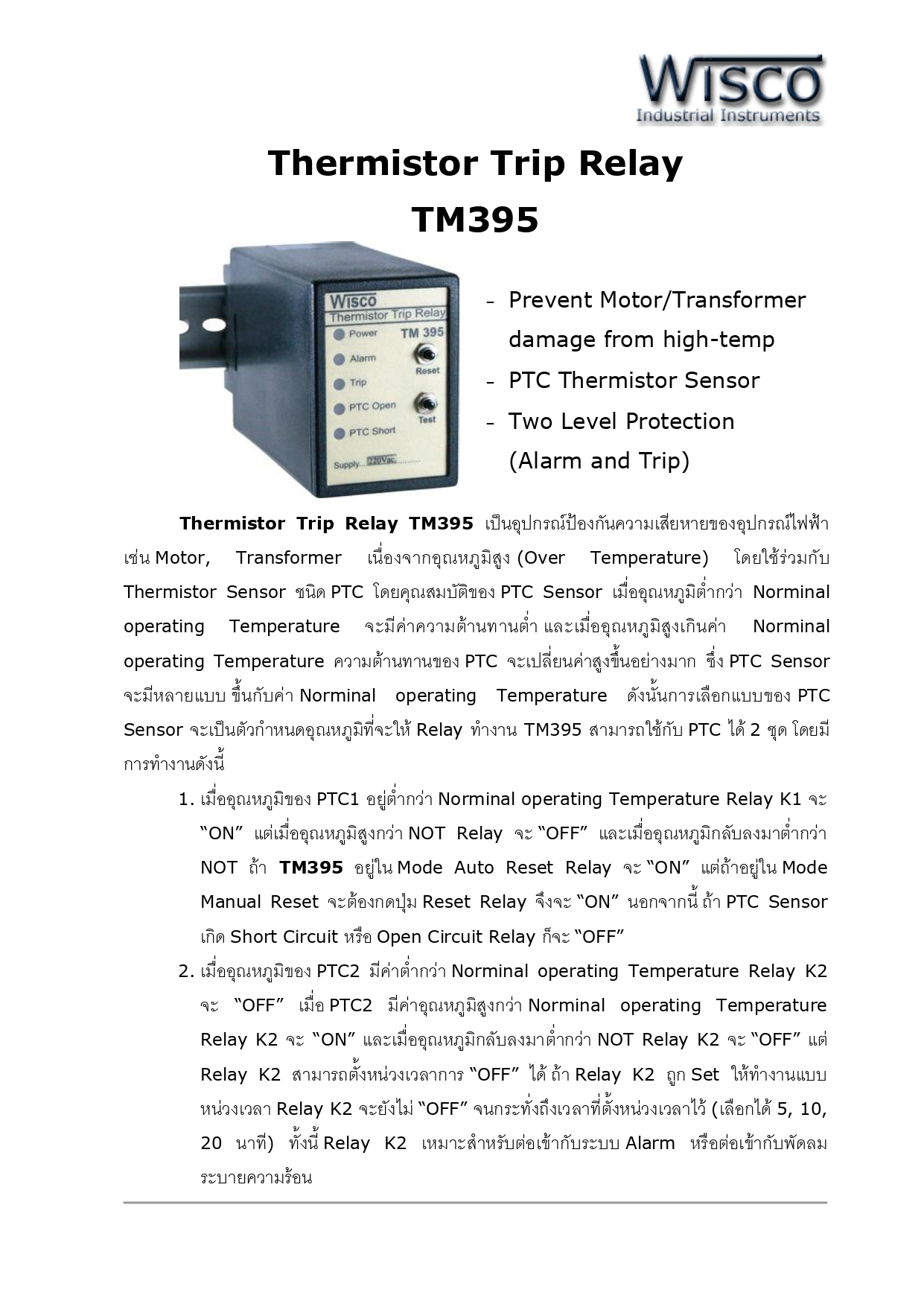 | ไฮไลท์ | Thermistor Trip Relay TM395 เป็นอุปกรณ์ป้องกันความเสียหายของอุปกรณ์ไฟฟ้า เช่น Motor, Transformer เนื่องจากอุณหภูมิสูง (Over Temperature) โดยใช้ร่วมกับ Thermistor Sensor ชนิด PTC โดยคุณสมบัติของ PTC Sensor เมื่ออุณหภูมิต่ำกว่า Norminal operating Temperature จะมีค่าความต้านทานต่ำ และเมื่ออุณหภูมิสูงเกินค่า Norminal operating Temperature ความต้านทานของ PTC จะเปลี่ยนค่าสูงขึ้นอย่างมาก ซึ่ง PTC Sensor จะมีหลายแบบ ขึ้นกับค่า Norminal operating Temperature ดังนั้นการเลือกแบบของ PTC Sensor จะเป็นตัวกำหนดอุณหภูมิที่จะให้ Relay ทำงาน TM395 สามารถใช้กับ PTC ได้ 2 ชุด โดยมีการทำงานดังนี้ เมื่ออุณหภูมิของ PTC1 อยู่ต่ำกว่า Norminal operating Temperature Relay K1 จะ “ON” แต่เมื่ออุณหภูมิสูงกว่า NOT Relay จะ “OFF” และเมื่ออุณหภูมิกลับลงมาต่ำกว่า NOT ถ้า TM395 อยู่ใน Mode Auto Reset Relay จะ “ON” แต่ถ้าอยู่ใน Mode Manual Reset จะต้องกดปุ่ม Reset Relay จึงจะ “ON” นอกจากนี้ ถ้า PTC Sensor เกิด Short Circuit หรือ Open Circuit Relay ก็จะ “OFF” เมื่ออุณหภูมิของ PTC2 มีค่าต่ำกว่า Norminal operating Temperature Relay K2 จะ “OFF” เมื่อ PTC2 มีค่าอุณหภูมิสูงกว่า Norminal operating Temperature Relay K2 จะ “ON” และเมื่ออุณหภูมิกลับลงมาต่ำกว่า NOT Relay K2 จะ “OFF” แต่ Relay K2 สามารถตั้งหน่วงเวลาการ “OFF” ได้ ถ้า Relay K2 ถูก Set ให้ทำงานแบบหน่วงเวลา Relay K2 จะยังไม่ “OFF” จนกระทั่งถึงเวลาที่ตั้งหน่วงเวลาไว้ (เลือกได้ 5, 10, 20 นาที) ทั้งนี้ Relay K2 เหมาะสำหรับต่อเข้ากับระบบ Alarm หรือต่อเข้ากับพัดลม ระบายความร้อน ______________________________________________________ Product : - Prevent Motor/Transformer damage from high-temp - PTC Thermistor Sensor - Two Level Protection (Alarm and Trip) ______________________________________________________ >>> หมายเหตุ : • ราคารวมภาษีมูลค่าเพิ่มแล้ว • กรณีมีสินค้าสต๊อกระยะจัดส่งสินค้าภายใน 4-7 วันทำการ • กรณีสินค้าหมดระยะจัดส่งสินค้าภายใน 3-4 สัปดาห์ • ฟรีค่าบริการจัดส่งสินค้า โดยบริษัทขนส่งเอกชน เช่น ปณ. ด่วน EMS, KEX Express, Flash Express เท่านั้น • สามารถเช็คสต๊อกสินค้าก่อนทำการสั่งซื้อได้ที่ @Line ID : kdnautomation • ลูกค้าตรวจสอบ Spec สินค้าก่อนทำการสั่งซื้อทุกครั้ง กรณีสั่งซื้อแล้วไม่รับเปลี่ยน-คืน ______________________________________________________ >>> ติดต่อสอบถามข้อมูลเพิ่มเติม : • Line Official : kdnautomation • E-Mail: kdnautomation@gmail.com • Tel : 082-550-3096, 02-023-3038 • Website : www.kdnautomation.co.th • เวลาทำการบริษัท วันจันทร์ - วันศุกร์ เวลา 08.00 - 17.00 น. ( หยุดวันนักขัตฤกษ์ ) ______________________________________________________ >>> บริการติดตั้ง : • ทางบริษัทจำหน่ายอุปกรณ์อิเล็กทรอนิกส์ ออกแบบ ติดตั้งและซ่อมแซม ปรับปรุงเครื่องจักรในโรงงานอุตสาหกรรม รวมถึงการให้บริการเขียนโปรแกรม และพัฒนาระบบควบคุมอัตโนมัติแบบครบวงจร ทั้งนี้ลูกค้าสามารถส่งรายละเอียด มาได้ที่ E-mail : kdnautomation@gmail.com เพื่อประเมินราคา |