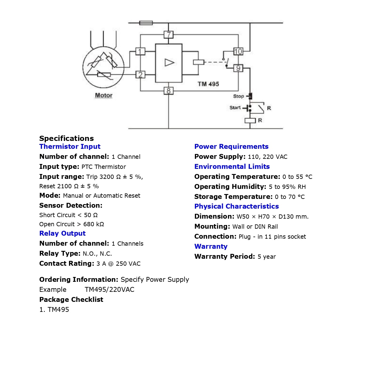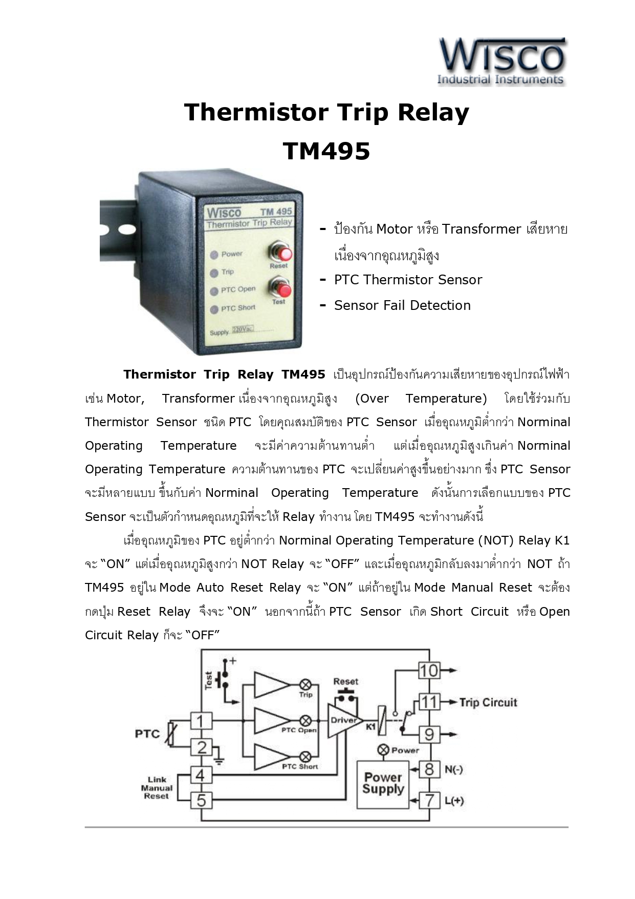 | ไฮไลท์ | Thermistor Trip Relay TM495 เป็นอุปกรณ์ป้องกันความเสียหายของอุปกรณ์ไฟฟ้า เช่น Motor, Transformer เนื่องจากอุณหภูมิสูง (Over Temperature) โดยใช้ร่วมกับ Thermistor Sensor ชนิด PTC โดยคุณสมบัติของ PTC Sensor เมื่ออุณหภูมิต่ำกว่า Norminal Operating Temperature จะมีค่าความต้านทานต่ำ แต่เมื่ออุณหภูมิสูงเกินค่า Norminal Operating Temperature ความต้านทานของ PTC จะเปลี่ยนค่าสูงขึ้นอย่างมาก ซึ่ง PTC Sensor จะมีหลายแบบ ขึ้นกับค่า Norminal Operating Temperature ดังนั้นการเลือกแบบของ PTC Sensor จะเป็นตัวกำหนดอุณหภูมิที่จะให้ Relay ทำงาน โดย TM495 จะทำงานดังนี้ เมื่ออุณหภูมิของ PTC อยู่ต่ำกว่า Norminal Operating Temperature (NOT) Relay K1 จะ “ON” แต่เมื่ออุณหภูมิสูงกว่า NOT Relay จะ “OFF” และเมื่ออุณหภูมิกลับลงมาต่ำกว่า NOT ถ้า TM495 อยู่ใน Mode Auto Reset Relay จะ “ON” แต่ถ้าอยู่ใน Mode Manual Reset จะต้อง กดปุ่ม Reset Relay จึงจะ “ON” นอกจากนี้ถ้า PTC Sensor เกิด Short Circuit หรือ Open Circuit Relay ก็จะ “OFF” ______________________________________________________ Product : - ป้องกัน Motor หรือ Transformer เสียหาย เนื่องจากอุณหภูมิสูง - PTC Thermistor Sensor - Sensor Fail Detection ______________________________________________________ >>> หมายเหตุ : • ราคารวมภาษีมูลค่าเพิ่มแล้ว • กรณีมีสินค้าสต๊อกระยะจัดส่งสินค้าภายใน 4-7 วันทำการ • กรณีสินค้าหมดระยะจัดส่งสินค้าภายใน 3-4 สัปดาห์ • ฟรีค่าบริการจัดส่งสินค้า โดยบริษัทขนส่งเอกชน เช่น ปณ. ด่วน EMS, KEX Express, Flash Express เท่านั้น • สามารถเช็คสต๊อกสินค้าก่อนทำการสั่งซื้อได้ที่ @Line ID : kdnautomation • ลูกค้าตรวจสอบ Spec สินค้าก่อนทำการสั่งซื้อทุกครั้ง กรณีสั่งซื้อแล้วไม่รับเปลี่ยน-คืน ______________________________________________________ >>> ติดต่อสอบถามข้อมูลเพิ่มเติม : • Line Official : kdnautomation • E-Mail: kdnautomation@gmail.com • Tel : 082-550-3096, 02-023-3038 • Website : www.kdnautomation.co.th • เวลาทำการบริษัท วันจันทร์ - วันศุกร์ เวลา 08.00 - 17.00 น. ( หยุดวันนักขัตฤกษ์ ) ______________________________________________________ >>> บริการติดตั้ง : • ทางบริษัทจำหน่ายอุปกรณ์อิเล็กทรอนิกส์ ออกแบบ ติดตั้งและซ่อมแซม ปรับปรุงเครื่องจักรในโรงงานอุตสาหกรรม รวมถึงการให้บริการเขียนโปรแกรม และพัฒนาระบบควบคุมอัตโนมัติแบบครบวงจร ทั้งนี้ลูกค้าสามารถส่งรายละเอียด มาได้ที่ E-mail : kdnautomation@gmail.com เพื่อประเมินราคา |