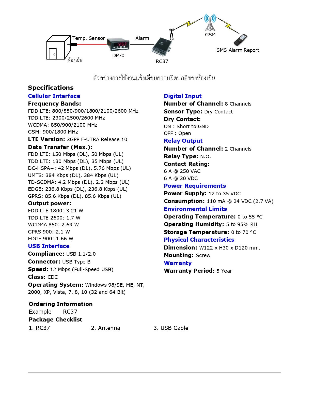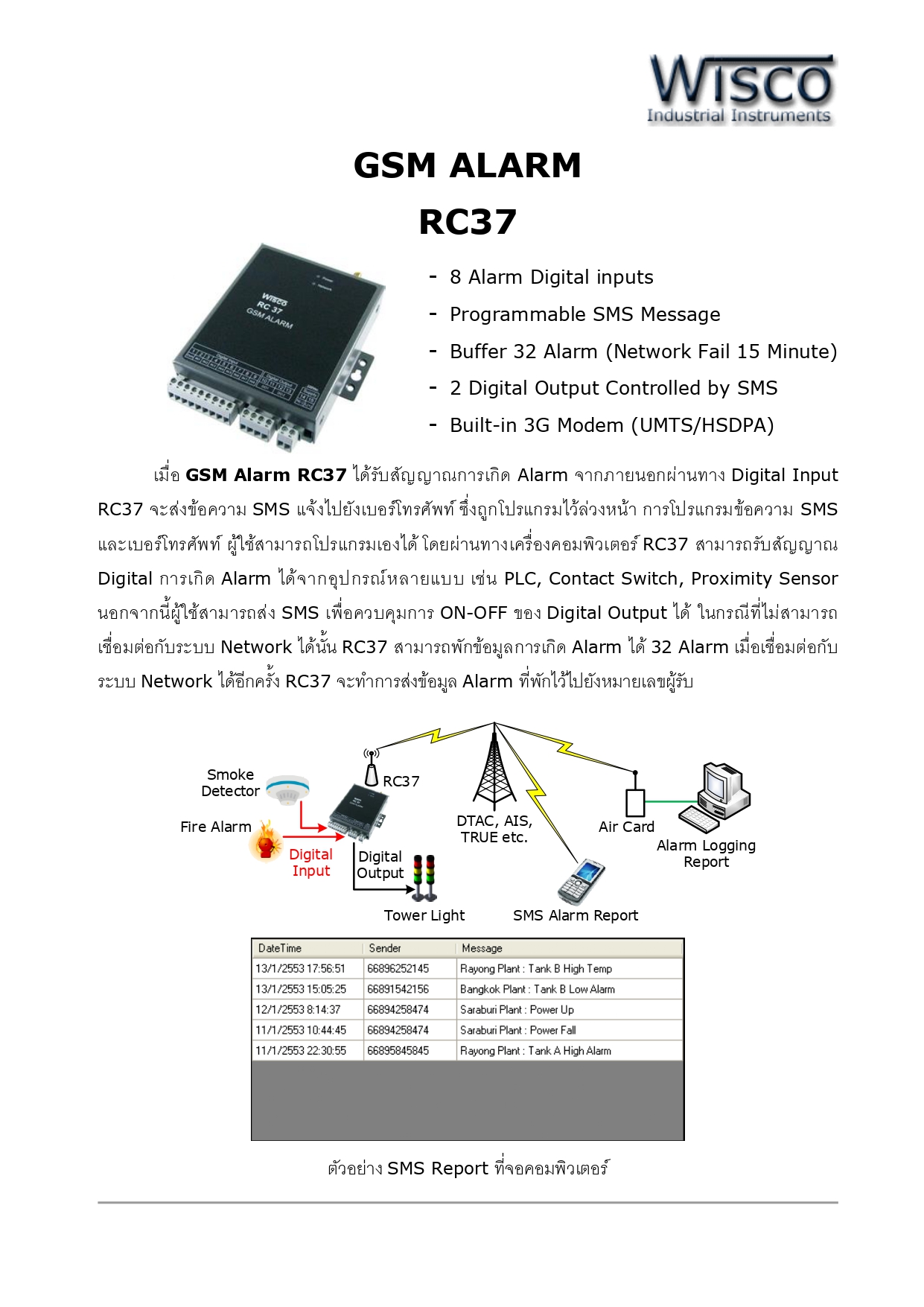 | ไฮไลท์ | เมื่อ GSM Alarm RC37 ได้รับสัญญาณการเกิด Alarm จากภายนอกผ่านทาง Digital Input RC37 จะส่งข้อความ SMS แจ้งไปยังเบอร์โทรศัพท์ซึ่งถูกโปรแกรมไว้ล่วงหน้า การโปรแกรมข้อความ SMS และเบอร์โทรศัพท์ ผู้ใช้สามารถโปรแกรมเองได้ โดยผ่านทางคอมพิวเตอร์ RC37 สามารถรับสัญญาณ Digital การเกิด Alarm ได้จากอุปกรณ์หลายแบบ เช่น PLC, Contact Switch, Proximity Sensor นอกจากนี้ผู้ใช้สามารถส่ง SMS เพื่อควบคุมการ ON-OFF ของ Digital Output ได้ ______________________________________________________ Product : - 8 Alarm Digital inputs - Programmable SMS Message - Buffer 32 Alarm (Network Fail 15 Minute) - 2 Digital Output Controlled by SMS - Built-in 3G Modem (UMTS/HSDPA) ______________________________________________________ >>> หมายเหตุ : • ราคารวมภาษีมูลค่าเพิ่มแล้ว • กรณีมีสินค้าสต๊อกระยะจัดส่งสินค้าภายใน 4-7 วันทำการ • กรณีสินค้าหมดระยะจัดส่งสินค้าภายใน 3-4 สัปดาห์ • ฟรีค่าบริการจัดส่งสินค้า โดยบริษัทขนส่งเอกชน เช่น ปณ. ด่วน EMS, KEX Express, Flash Express เท่านั้น • สามารถเช็คสต๊อกสินค้าก่อนทำการสั่งซื้อได้ที่ @Line ID : kdnautomation • ลูกค้าตรวจสอบ Spec สินค้าก่อนทำการสั่งซื้อทุกครั้ง กรณีสั่งซื้อแล้วไม่รับเปลี่ยน-คืน ______________________________________________________ >>> ติดต่อสอบถามข้อมูลเพิ่มเติม : • Line Official : kdnautomation • E-Mail: kdnautomation@gmail.com • Tel : 082-550-3096, 02-023-3038 • Website : www.kdnautomation.co.th • เวลาทำการบริษัท วันจันทร์ - วันศุกร์ เวลา 08.00 - 17.00 น. ( หยุดวันนักขัตฤกษ์ ) ______________________________________________________ >>> บริการติดตั้ง : • ทางบริษัทจำหน่ายอุปกรณ์อิเล็กทรอนิกส์ ออกแบบ ติดตั้งและซ่อมแซม ปรับปรุงเครื่องจักรในโรงงานอุตสาหกรรม รวมถึงการให้บริการเขียนโปรแกรม และพัฒนาระบบควบคุมอัตโนมัติแบบครบวงจร ทั้งนี้ลูกค้าสามารถส่งรายละเอียด มาได้ที่ E-mail : kdnautomation@gmail.com เพื่อประเมินราคา |