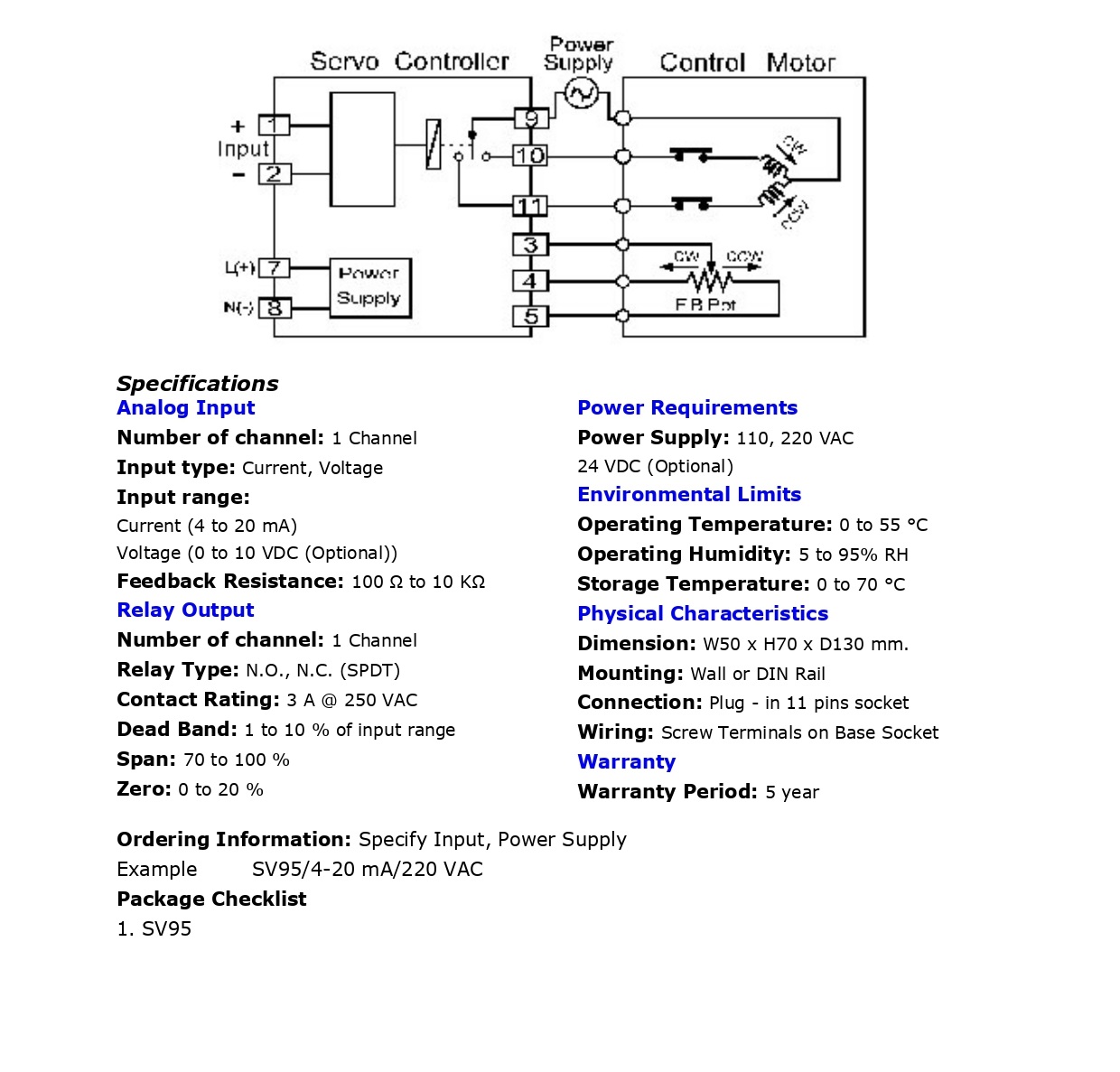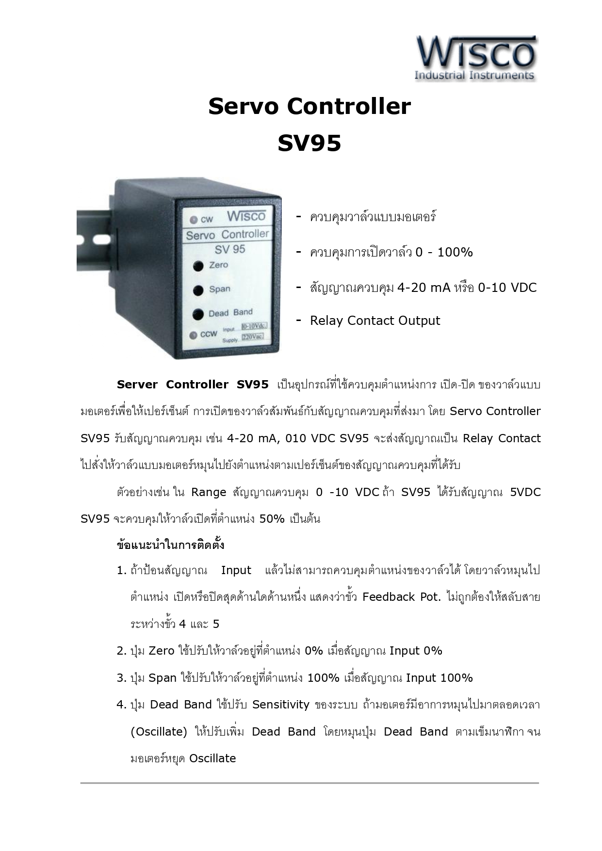 | ไฮไลท์ | Server Controller SV95 เป็นอุปกรณ์ที่ใช้ควบคุมตำแหน่งการ เปิด-ปิด ของวาล์วแบบมอเตอร์เพื่อให้เปอร์เซ็นต์ การเปิดของวาล์วสัมพันธ์กับสัญญาณควบคุมที่ส่งมา โดย Servo Controller SV95 รับสัญญาณควบคุม เช่น 4-20 mA, 010 VDC SV95 จะส่งสัญญาณเป็น Relay Contact ไปสั่งให้วาล์วแบบมอเตอร์หมุนไปยังตำแหน่งตามเปอร์เซ็นต์ของสัญญาณควบคุมที่ได้รับ ตัวอย่างเช่น ใน Range สัญญาณควบคุม 0 -10 VDC ถ้า SV95 ได้รับสัญญาณ 5VDC SV95 จะควบคุมให้วาล์วเปิดที่ตำแหน่ง 50% เป็นต้น ข้อแนะนำในการติดตั้ง ถ้าป้อนสัญญาณ Input แล้วไม่สามารถควบคุมตำแหน่งของวาล์วได้ โดยวาล์วหมุนไปตำแหน่ง เปิดหรือปิดสุดด้านใดด้านหนึ่ง แสดงว่าขั้ว Feedback Pot. ไม่ถูกต้องให้สลับสายระหว่างขั้ว 4 และ ปุ่ม Zero ใช้ปรับให้วาล์วอยู่ที่ตำแหน่ง 0% เมื่อสัญญาณ Input 0% ปุ่ม Span ใช้ปรับให้วาล์วอยู่ที่ตำแหน่ง 100% เมื่อสัญญาณ Input 100% ปุ่ม Dead Band ใช้ปรับ Sensitivity ของระบบ ถ้ามอเตอร์มีอาการหมุนไปมาตลอดเวลา (Oscillate) ให้ปรับเพิ่ม Dead Band โดยหมุนปุ่ม Dead Band ตามเข็มนาฬิกา จนมอเตอร์หยุด Oscillate ______________________________________________________ Product : - ควบคุมวาล์วแบบมอเตอร์ - ควบคุมการเปิดวาล์ว 0 - 100% - สัญญาณควบคุม 4-20 mA หรือ 0-10 VDC - Relay Contact Output ______________________________________________________ >>> หมายเหตุ : • ราคารวมภาษีมูลค่าเพิ่มแล้ว • กรณีมีสินค้าสต๊อกระยะจัดส่งสินค้าภายใน 4-7 วันทำการ • กรณีสินค้าหมดระยะจัดส่งสินค้าภายใน 3-4 สัปดาห์ • ฟรีค่าบริการจัดส่งสินค้า โดยบริษัทขนส่งเอกชน เช่น ปณ. ด่วน EMS, KEX Express, Flash Express เท่านั้น • สามารถเช็คสต๊อกสินค้าก่อนทำการสั่งซื้อได้ที่ @Line ID : kdnautomation • ลูกค้าตรวจสอบ Spec สินค้าก่อนทำการสั่งซื้อทุกครั้ง กรณีสั่งซื้อแล้วไม่รับเปลี่ยน-คืน ______________________________________________________ >>> ติดต่อสอบถามข้อมูลเพิ่มเติม : • Line Official : kdnautomation • E-Mail: kdnautomation@gmail.com • Tel : 082-550-3096, 02-023-3038 • Website : www.kdnautomation.co.th • เวลาทำการบริษัท วันจันทร์ - วันศุกร์ เวลา 08.00 - 17.00 น. ( หยุดวันนักขัตฤกษ์ ) ______________________________________________________ >>> บริการติดตั้ง : • ทางบริษัทจำหน่ายอุปกรณ์อิเล็กทรอนิกส์ ออกแบบ ติดตั้งและซ่อมแซม ปรับปรุงเครื่องจักรในโรงงานอุตสาหกรรม รวมถึงการให้บริการเขียนโปรแกรม และพัฒนาระบบควบคุมอัตโนมัติแบบครบวงจร ทั้งนี้ลูกค้าสามารถส่งรายละเอียด มาได้ที่ E-mail : kdnautomation@gmail.com เพื่อประเมินราคา |