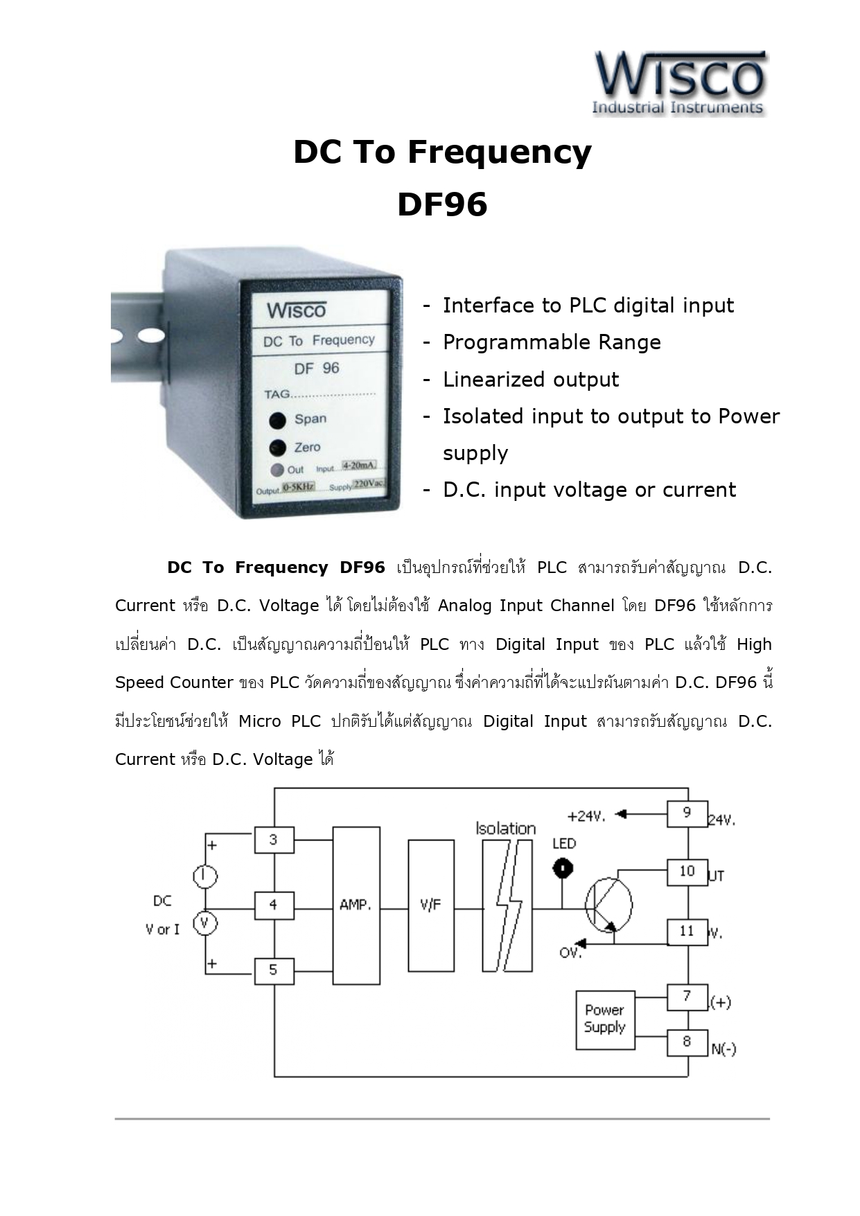 | ไฮไลท์ | DC To Frequency DF96 เป็นอุปกรณ์ที่ช่วยให้ PLC สามารถรับค่าสัญญาณ D.C. Current หรือ D.C. Voltage ได้ โดยไม่ต้องใช้ Analog Input Channel โดย DF96 ใช้หลักการเปลี่ยนค่า D.C. เป็นสัญญาณความถี่ป้อนให้ PLC ทาง Digital Input ของ PLC แล้วใช้ High Speed Counter ของ PLC วัดความถี่ของสัญญาณ ซึ่งค่าความถี่ที่ได้จะแปรผันตามค่า D.C. DF96 นี้มีประโยชน์ช่วยให้ Micro PLC ปกติรับได้แต่สัญญาณ Digital Input สามารถรับสัญญาณ D.C. Current หรือ D.C. Voltage ได้ ______________________________________________________ Product : - Interface to PLC digital input - Programmable Range - Linearized output - Isolated input to output to Power supply - D.C. input voltage or current ______________________________________________________ >>> หมายเหตุ : • ราคารวมภาษีมูลค่าเพิ่มแล้ว • กรณีมีสินค้าสต๊อกระยะจัดส่งสินค้าภายใน 4-7 วันทำการ • กรณีสินค้าหมดระยะจัดส่งสินค้าภายใน 3-4 สัปดาห์ • ฟรีค่าบริการจัดส่งสินค้า โดยบริษัทขนส่งเอกชน เช่น ปณ. ด่วน EMS, KEX Express, Flash Express เท่านั้น • สามารถเช็คสต๊อกสินค้าก่อนทำการสั่งซื้อได้ที่ @Line ID : kdnautomation • ลูกค้าตรวจสอบ Spec สินค้าก่อนทำการสั่งซื้อทุกครั้ง กรณีสั่งซื้อแล้วไม่รับเปลี่ยน-คืน ______________________________________________________ >>> ติดต่อสอบถามข้อมูลเพิ่มเติม : • Line Official : kdnautomation • E-Mail: kdnautomation@gmail.com • Tel : 082-550-3096, 02-023-3038 • Website : www.kdnautomation.co.th • เวลาทำการบริษัท วันจันทร์ - วันศุกร์ เวลา 08.00 - 17.00 น. ( หยุดวันนักขัตฤกษ์ ) ______________________________________________________ >>> บริการติดตั้ง : • ทางบริษัทจำหน่ายอุปกรณ์อิเล็กทรอนิกส์ ออกแบบ ติดตั้งและซ่อมแซม ปรับปรุงเครื่องจักรในโรงงานอุตสาหกรรม รวมถึงการให้บริการเขียนโปรแกรม และพัฒนาระบบควบคุมอัตโนมัติแบบครบวงจร ทั้งนี้ลูกค้าสามารถส่งรายละเอียด มาได้ที่ E-mail : kdnautomation@gmail.com เพื่อประเมินราคา |