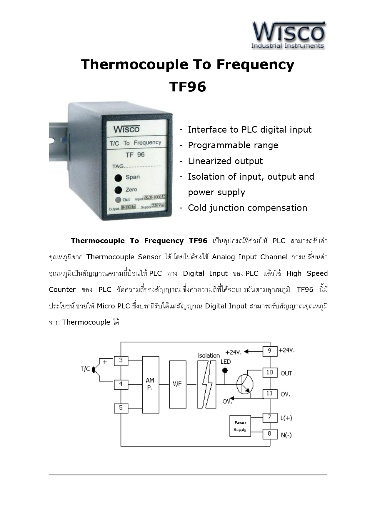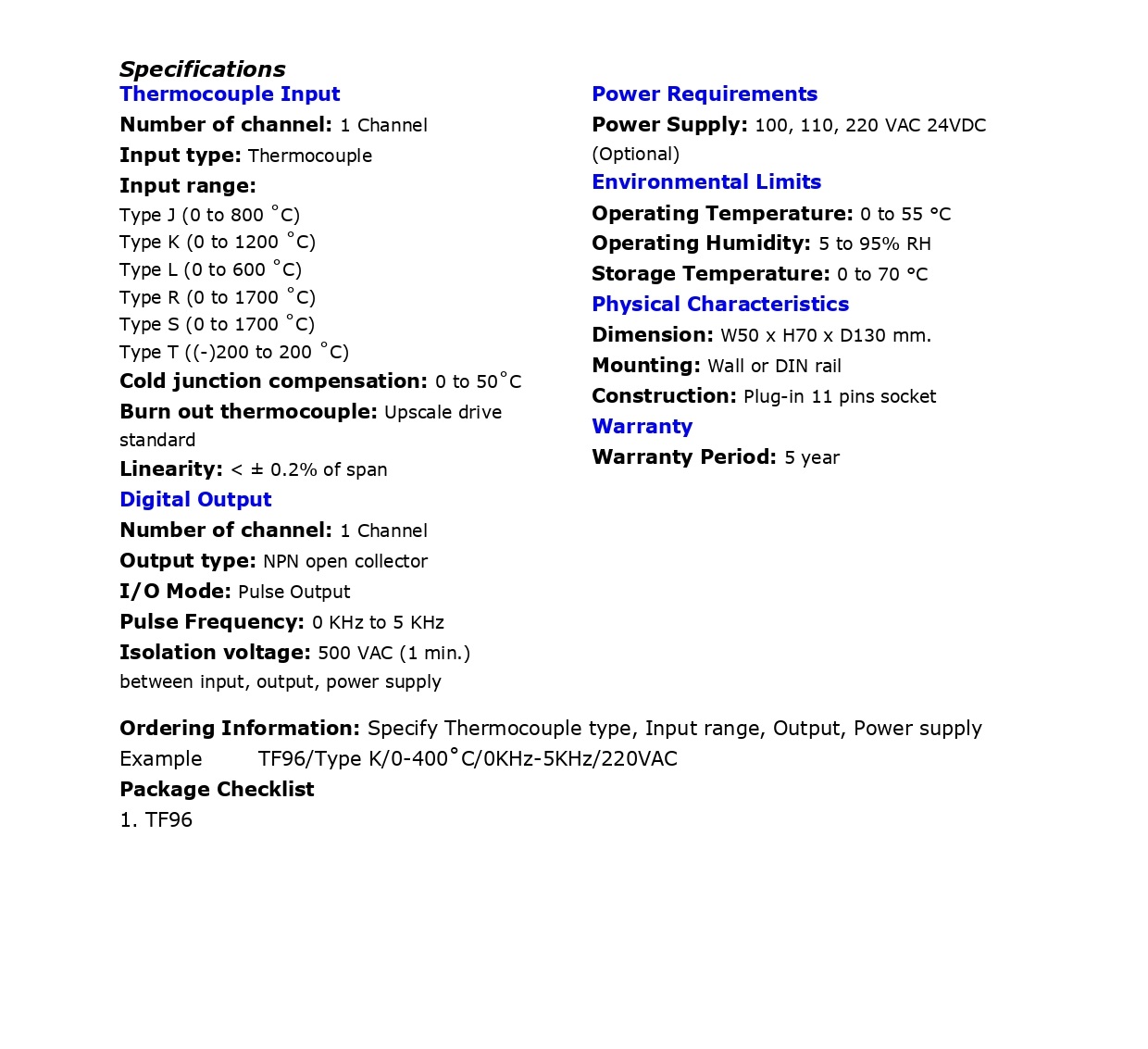 | ไฮไลท์ | Thermocouple To Frequency TF96 เป็นอุปกรณ์ที่ช่วยให้ PLC สามารถรับค่าอุณหภูมิจาก Thermocouple Sensor ได้ โดยไม่ต้องใช้ Analog Input Channel การเปลี่ยนค่าอุณหภูมิเป็นสัญญาณความถี่ป้อนให้ PLC ทาง Digital Input ของ PLC แล้วใช้ High Speed Counter ของ PLC วัดความถี่ของสัญญาณ ซึ่งค่าความถี่ที่ได้จะแปรผันตามอุณหภูมิ TF96 นี้มีประโยชน์ ช่วยให้ Micro PLC ซึ่งปรกติรับได้แต่สัญญาณ Digital Input สามารถรับสัญญาณอุณหภูมิจาก Thermocouple ได้ ______________________________________________________ Product : - Interface to PLC digital input - Programmable range - Linearized output - Isolation of input, output and power supply - Cold junction compensation ______________________________________________________ >>> หมายเหตุ : • ราคารวมภาษีมูลค่าเพิ่มแล้ว • กรณีมีสินค้าสต๊อกระยะจัดส่งสินค้าภายใน 4-7 วันทำการ • กรณีสินค้าหมดระยะจัดส่งสินค้าภายใน 3-4 สัปดาห์ • ฟรีค่าบริการจัดส่งสินค้า โดยบริษัทขนส่งเอกชน เช่น ปณ. ด่วน EMS, KEX Express, Flash Express เท่านั้น • สามารถเช็คสต๊อกสินค้าก่อนทำการสั่งซื้อได้ที่ @Line ID : kdnautomation • ลูกค้าตรวจสอบ Spec สินค้าก่อนทำการสั่งซื้อทุกครั้ง กรณีสั่งซื้อแล้วไม่รับเปลี่ยน-คืน ______________________________________________________ >>> ติดต่อสอบถามข้อมูลเพิ่มเติม : • Line Official : kdnautomation • E-Mail: kdnautomation@gmail.com • Tel : 082-550-3096, 02-023-3038 • Website : www.kdnautomation.co.th • เวลาทำการบริษัท วันจันทร์ - วันศุกร์ เวลา 08.00 - 17.00 น. ( หยุดวันนักขัตฤกษ์ ) ______________________________________________________ >>> บริการติดตั้ง : • ทางบริษัทจำหน่ายอุปกรณ์อิเล็กทรอนิกส์ ออกแบบ ติดตั้งและซ่อมแซม ปรับปรุงเครื่องจักรในโรงงานอุตสาหกรรม รวมถึงการให้บริการเขียนโปรแกรม และพัฒนาระบบควบคุมอัตโนมัติแบบครบวงจร ทั้งนี้ลูกค้าสามารถส่งรายละเอียด มาได้ที่ E-mail : kdnautomation@gmail.com เพื่อประเมินราคา |