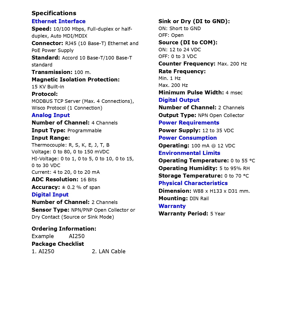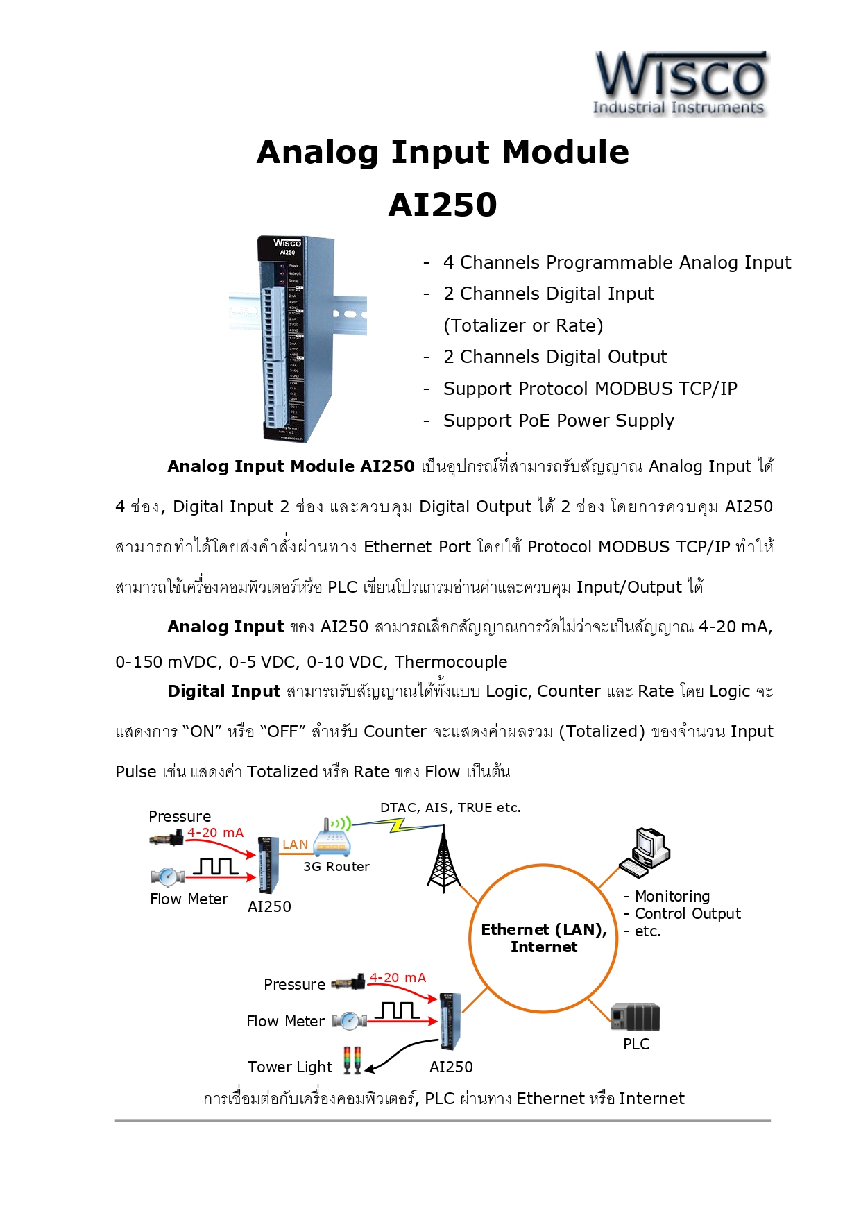 Analog Input Module AI250 เป็นอุปกรณ์ที่สามารถรับสัญญาณ Analog Input ได้ 4 ช่อง, Digital Input 2 ช่อง และควบคุม Digital Output ได้ 2 ช่อง โดยการควบคุม AI250 สามารถทำได้โดยส่งคำสั่งผ่านทาง Ethernet Port โดยใช้ Protocol MODBUS TCP/IP ทำให้สามารถใช้เครื่องคอมพิวเตอร์หรือ PLC เขียนโปรแกรมอ่านค่าและควบคุม Input/Output ได้