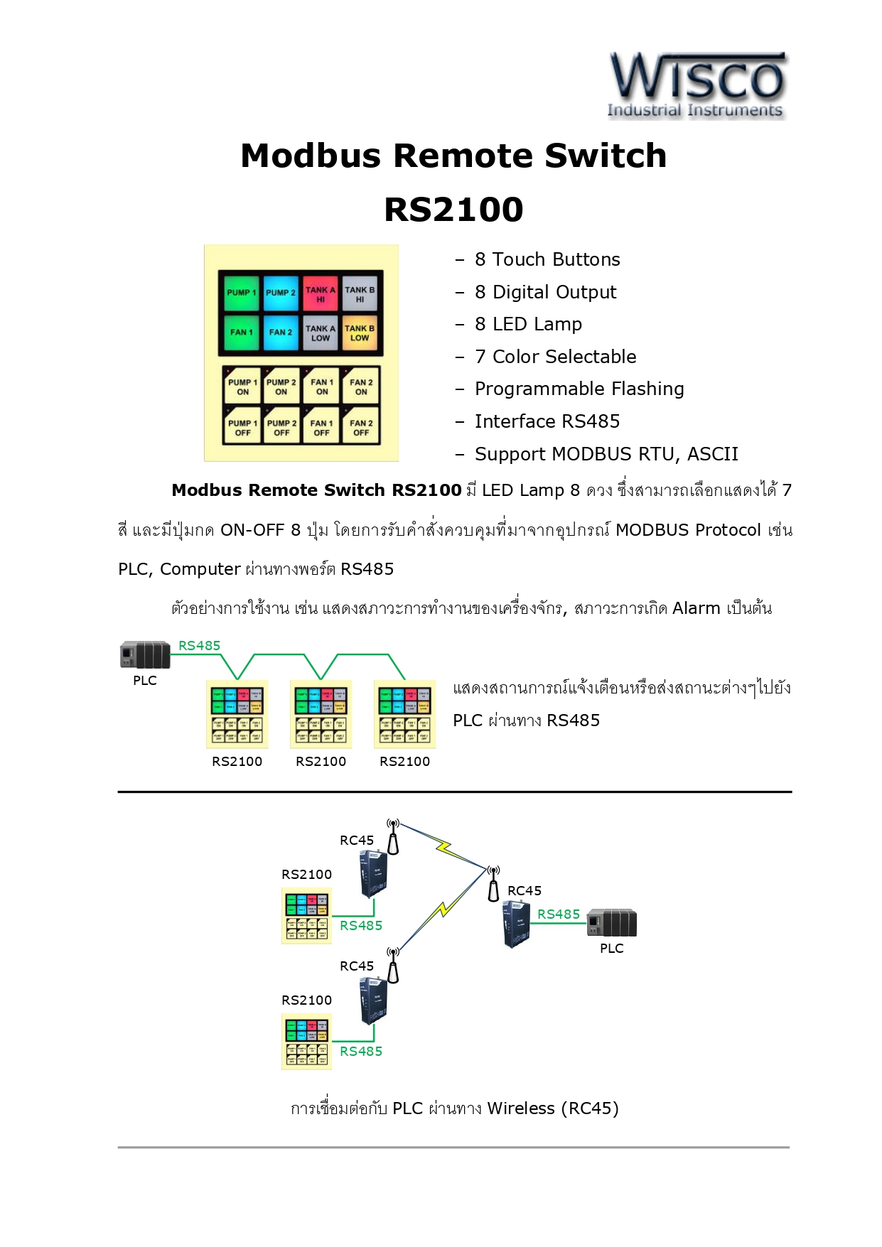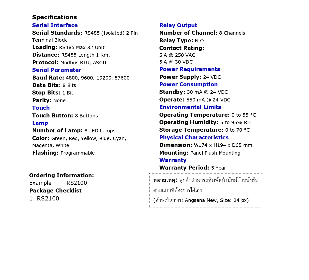| ไฮไลท์ | Modbus Remote Switch RS2100 เป็นอุปกรณ์ที่ใช้ควบคุม Switch เพื่อ ปิด-เปิด อุปกรณ์ไฟฟ้าจากระยะไกล โดยผ่านทางสาย 2-Wire RS485 มี LED Lamp 8 ดวง ซึ่งสามารถเลือกแสดงได้ 7 สี และมีปุ่มกด ON-OFF 8 ปุ่ม โดยการรับคำสั่งควบคุมที่มาจากอุปกรณ์ MODBUS Protocol เช่น PLC, Computer ผ่านทางพอร์ต RS485 ______________________________________________________ Product : - 8 Touch Buttons - 8 Digital Output - 8 LED Lamp - 7 Color Selectable - Programmable Flashing - Interface RS485 - Support MODBUS RTU, ASCII ______________________________________________________ >>> หมายเหตุ : • ราคารวมภาษีมูลค่าเพิ่มแล้ว • กรณีมีสินค้าสต๊อกระยะจัดส่งสินค้าภายใน 4-7 วันทำการ • กรณีสินค้าหมดระยะจัดส่งสินค้าภายใน 3-4 สัปดาห์ • ฟรีค่าบริการจัดส่งสินค้า โดยบริษัทขนส่งเอกชน เช่น ปณ. ด่วน EMS, KEX Express, Flash Express เท่านั้น • สามารถเช็คสต๊อกสินค้าก่อนทำการสั่งซื้อได้ที่ @Line ID : kdnautomation • ลูกค้าตรวจสอบ Spec สินค้าก่อนทำการสั่งซื้อทุกครั้ง กรณีสั่งซื้อแล้วไม่รับเปลี่ยน-คืน ______________________________________________________ >>> ติดต่อสอบถามข้อมูลเพิ่มเติม : • Line Official : kdnautomation • E-Mail: kdnautomation@gmail.com • Tel : 082-550-3096, 02-023-3038 • Website : www.kdnautomation.co.th • เวลาทำการบริษัท วันจันทร์ - วันศุกร์ เวลา 08.00 - 17.00 น. ( หยุดวันนักขัตฤกษ์ ) ______________________________________________________ >>> บริการติดตั้ง : • ทางบริษัทจำหน่ายอุปกรณ์อิเล็กทรอนิกส์ ออกแบบ ติดตั้งและซ่อมแซม ปรับปรุงเครื่องจักรในโรงงานอุตสาหกรรม รวมถึงการให้บริการเขียนโปรแกรม และพัฒนาระบบควบคุมอัตโนมัติแบบครบวงจร ทั้งนี้ลูกค้าสามารถส่งรายละเอียด มาได้ที่ E-mail : kdnautomation@gmail.com เพื่อประเมินราคา |