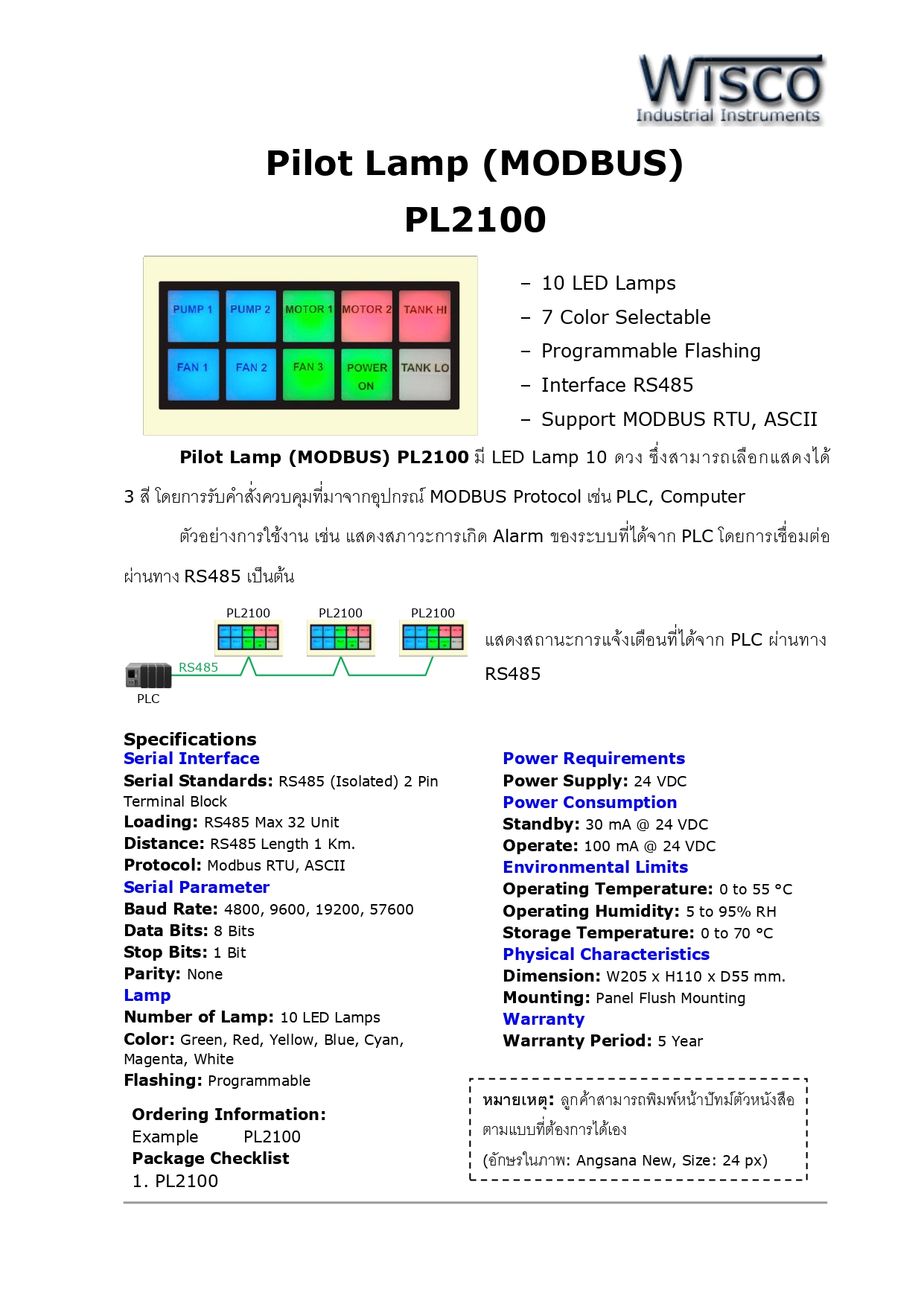 | ไฮไลท์ | Pilot Lamp (MODBUS) PL2100 มี LED Lamp 10 ดวง ซึ่งสามารถเลือกแสดงได้ 3 สี โดยการรับคำสั่งควบคุมที่มาจากอุปกรณ์ MODBUS Protocol เช่น PLC, Computer ______________________________________________________ Product : - 10 LED Lamps - 7 Color Selectable - Programmable Flashing - Interface RS485 - Support MODBUS RTU, ASCII ______________________________________________________ >>> หมายเหตุ : • ราคารวมภาษีมูลค่าเพิ่มแล้ว • กรณีมีสินค้าสต๊อกระยะจัดส่งสินค้าภายใน 4-7 วันทำการ • กรณีสินค้าหมดระยะจัดส่งสินค้าภายใน 3-4 สัปดาห์ • ฟรีค่าบริการจัดส่งสินค้า โดยบริษัทขนส่งเอกชน เช่น ปณ. ด่วน EMS, KEX Express, Flash Express เท่านั้น • สามารถเช็คสต๊อกสินค้าก่อนทำการสั่งซื้อได้ที่ @Line ID : kdnautomation • ลูกค้าตรวจสอบ Spec สินค้าก่อนทำการสั่งซื้อทุกครั้ง กรณีสั่งซื้อแล้วไม่รับเปลี่ยน-คืน ______________________________________________________ >>> ติดต่อสอบถามข้อมูลเพิ่มเติม : • Line Official : kdnautomation • E-Mail: kdnautomation@gmail.com • Tel : 082-550-3096, 02-023-3038 • Website : www.kdnautomation.co.th • เวลาทำการบริษัท วันจันทร์ - วันศุกร์ เวลา 08.00 - 17.00 น. ( หยุดวันนักขัตฤกษ์ ) ______________________________________________________ >>> บริการติดตั้ง : • ทางบริษัทจำหน่ายอุปกรณ์อิเล็กทรอนิกส์ ออกแบบ ติดตั้งและซ่อมแซม ปรับปรุงเครื่องจักรในโรงงานอุตสาหกรรม รวมถึงการให้บริการเขียนโปรแกรม และพัฒนาระบบควบคุมอัตโนมัติแบบครบวงจร ทั้งนี้ลูกค้าสามารถส่งรายละเอียด มาได้ที่ E-mail : kdnautomation@gmail.com เพื่อประเมินราคา |