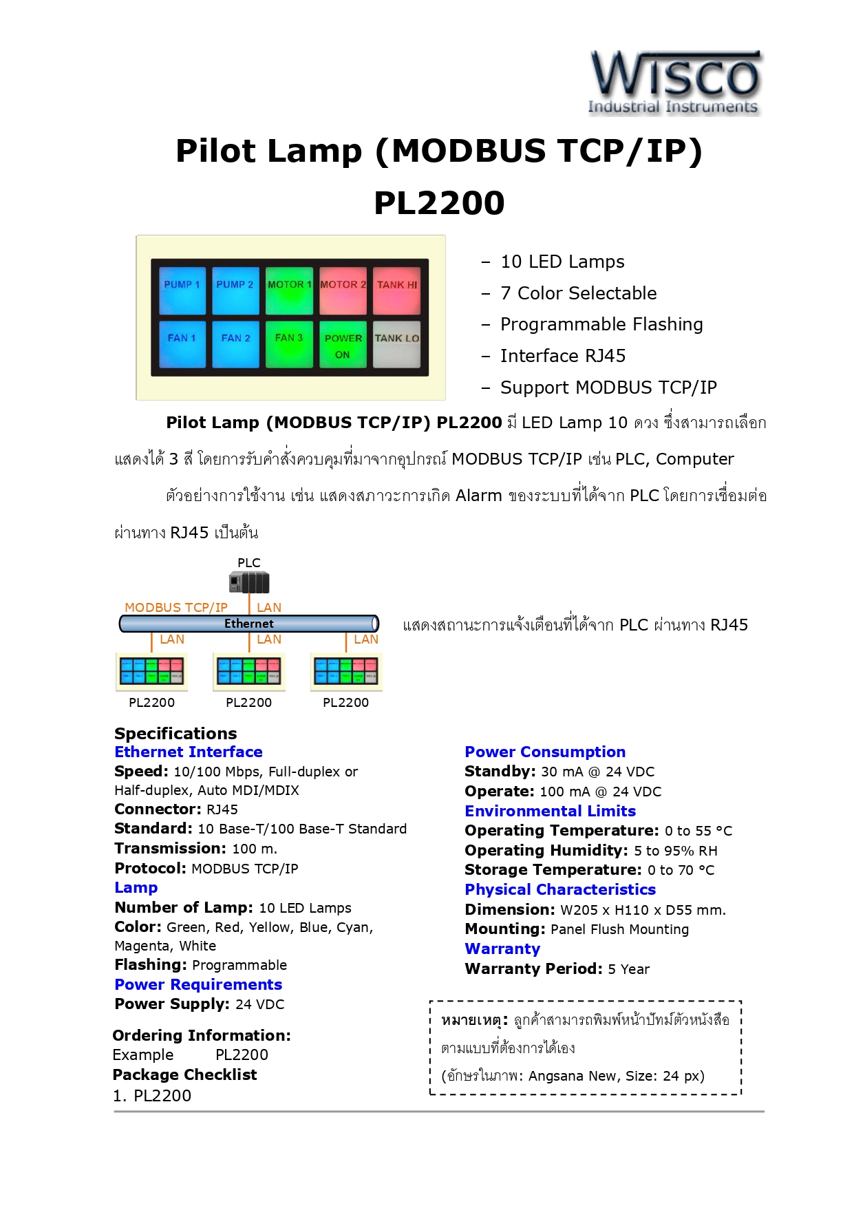 | ไฮไลท์ | Pilot Lamp (MODBUS TCP/IP) PL2200 มี LED Lamp 10 ดวง ซึ่งสามารถเลือกแสดงได้ 3 สี โดยการรับคำสั่งควบคุมที่มาจากอุปกรณ์ MODBUS TCP/IP เช่น PLC, Computer ______________________________________________________ Product : - 10 LED Lamps - 7 Color Selectable - Programmable Flashing - Interface RJ45 - Support MODBUS TCP/IP ______________________________________________________ >>> หมายเหตุ : • ราคารวมภาษีมูลค่าเพิ่มแล้ว • กรณีมีสินค้าสต๊อกระยะจัดส่งสินค้าภายใน 4-7 วันทำการ • กรณีสินค้าหมดระยะจัดส่งสินค้าภายใน 3-4 สัปดาห์ • ฟรีค่าบริการจัดส่งสินค้า โดยบริษัทขนส่งเอกชน เช่น ปณ. ด่วน EMS, KEX Express, Flash Express เท่านั้น • สามารถเช็คสต๊อกสินค้าก่อนทำการสั่งซื้อได้ที่ @Line ID : kdnautomation • ลูกค้าตรวจสอบ Spec สินค้าก่อนทำการสั่งซื้อทุกครั้ง กรณีสั่งซื้อแล้วไม่รับเปลี่ยน-คืน ______________________________________________________ >>> ติดต่อสอบถามข้อมูลเพิ่มเติม : • Line Official : kdnautomation • E-Mail: kdnautomation@gmail.com • Tel : 082-550-3096, 02-023-3038 • Website : www.kdnautomation.co.th • เวลาทำการบริษัท วันจันทร์ - วันศุกร์ เวลา 08.00 - 17.00 น. ( หยุดวันนักขัตฤกษ์ ) ______________________________________________________ >>> บริการติดตั้ง : • ทางบริษัทจำหน่ายอุปกรณ์อิเล็กทรอนิกส์ ออกแบบ ติดตั้งและซ่อมแซม ปรับปรุงเครื่องจักรในโรงงานอุตสาหกรรม รวมถึงการให้บริการเขียนโปรแกรม และพัฒนาระบบควบคุมอัตโนมัติแบบครบวงจร ทั้งนี้ลูกค้าสามารถส่งรายละเอียด มาได้ที่ E-mail : kdnautomation@gmail.com เพื่อประเมินราคา |
