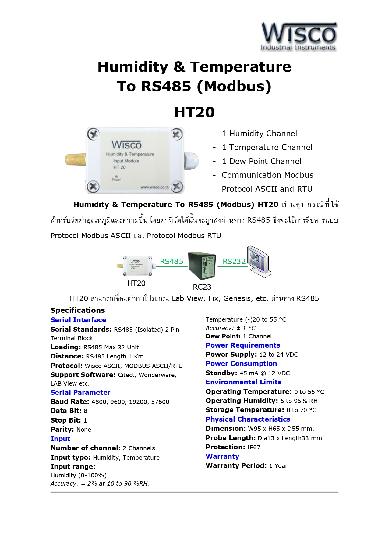 | ไฮไลท์ | Humidity & Temperature To RS485 (Modbus) HT20 เป็นอุปกรณ์ที่ใช้สำหรับวัดค่าอุณหภูมิและความชื้น โดยค่าที่วัดได้นั้นจะถูกส่งผ่านทาง RS-485 ซึ่งจะใช้การสื่อสารแบบ Protocol Modbus ASCII และ Protocol Modbus RTU ______________________________________________________ Product : - 1 Humidity Channel - 1 Temperature Channel - 1 Dew Point Channel - Communication Modbus Protocol ASCII and RTU ______________________________________________________ >>> หมายเหตุ : • ราคารวมภาษีมูลค่าเพิ่มแล้ว • กรณีมีสินค้าสต๊อกระยะจัดส่งสินค้าภายใน 4-7 วันทำการ • กรณีสินค้าหมดระยะจัดส่งสินค้าภายใน 3-4 สัปดาห์ • ฟรีค่าบริการจัดส่งสินค้า โดยบริษัทขนส่งเอกชน เช่น ปณ. ด่วน EMS, KEX Express, Flash Express เท่านั้น • สามารถเช็คสต๊อกสินค้าก่อนทำการสั่งซื้อได้ที่ @Line ID : kdnautomation • ลูกค้าตรวจสอบ Spec สินค้าก่อนทำการสั่งซื้อทุกครั้ง กรณีสั่งซื้อแล้วไม่รับเปลี่ยน-คืน ______________________________________________________ >>> ติดต่อสอบถามข้อมูลเพิ่มเติม : • Line Official : kdnautomation • E-Mail: kdnautomation@gmail.com • Tel : 082-550-3096, 02-023-3038 • Website : www.kdnautomation.co.th • เวลาทำการบริษัท วันจันทร์ - วันศุกร์ เวลา 08.00 - 17.00 น. ( หยุดวันนักขัตฤกษ์ ) ______________________________________________________ >>> บริการติดตั้ง : • ทางบริษัทจำหน่ายอุปกรณ์อิเล็กทรอนิกส์ ออกแบบ ติดตั้งและซ่อมแซม ปรับปรุงเครื่องจักรในโรงงานอุตสาหกรรม รวมถึงการให้บริการเขียนโปรแกรม และพัฒนาระบบควบคุมอัตโนมัติแบบครบวงจร ทั้งนี้ลูกค้าสามารถส่งรายละเอียด มาได้ที่ E-mail : kdnautomation@gmail.com เพื่อประเมินราคา |