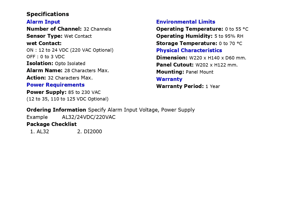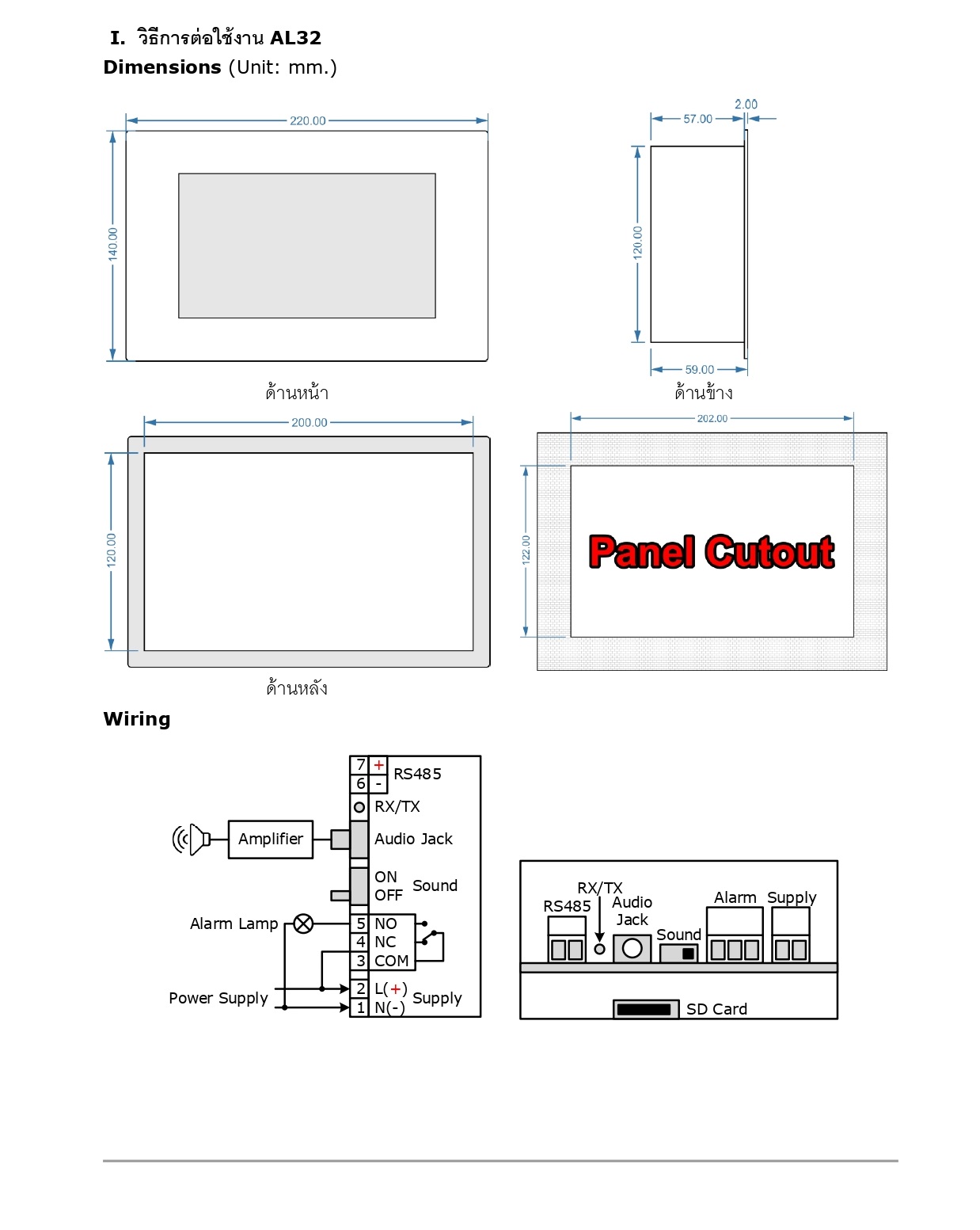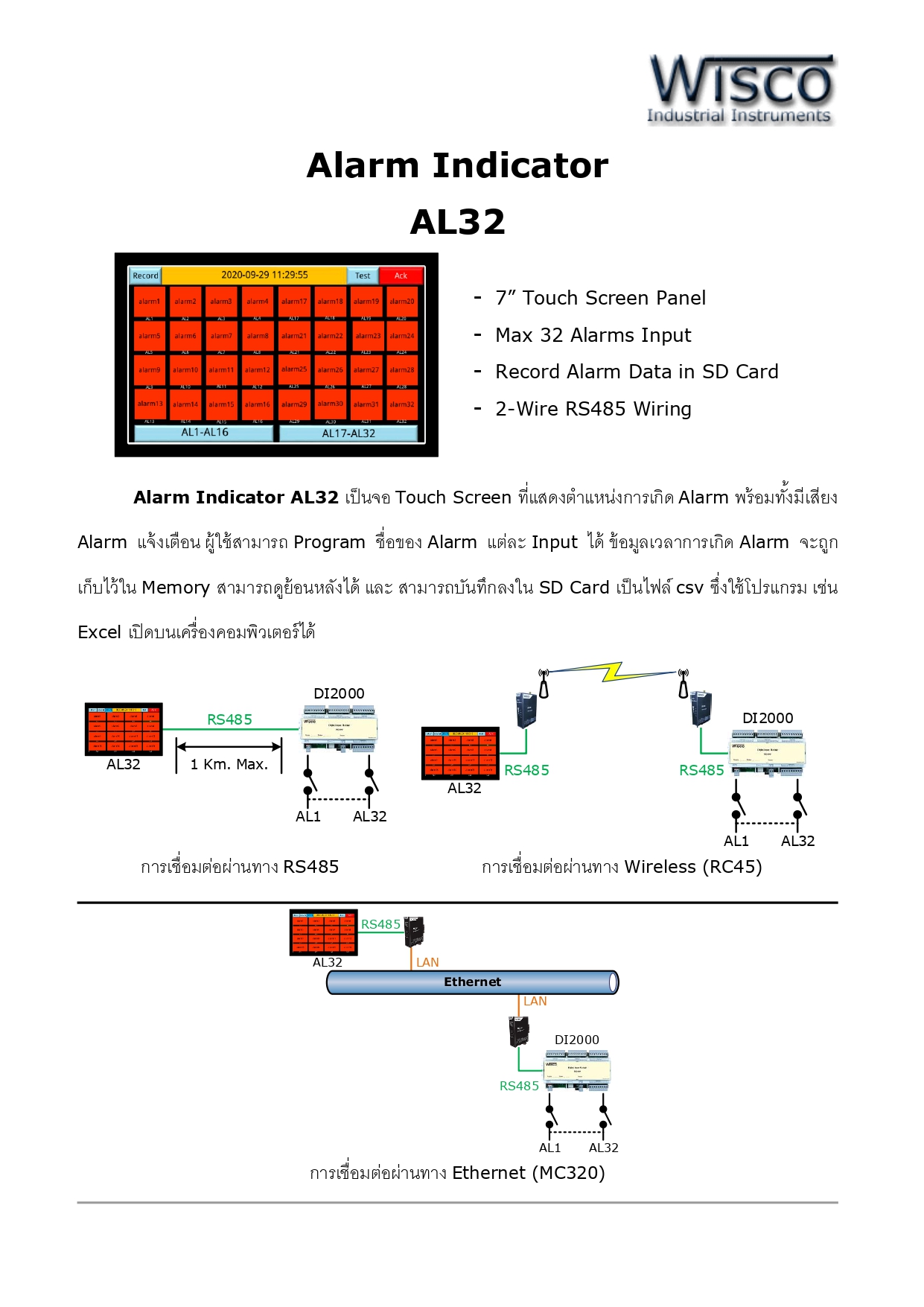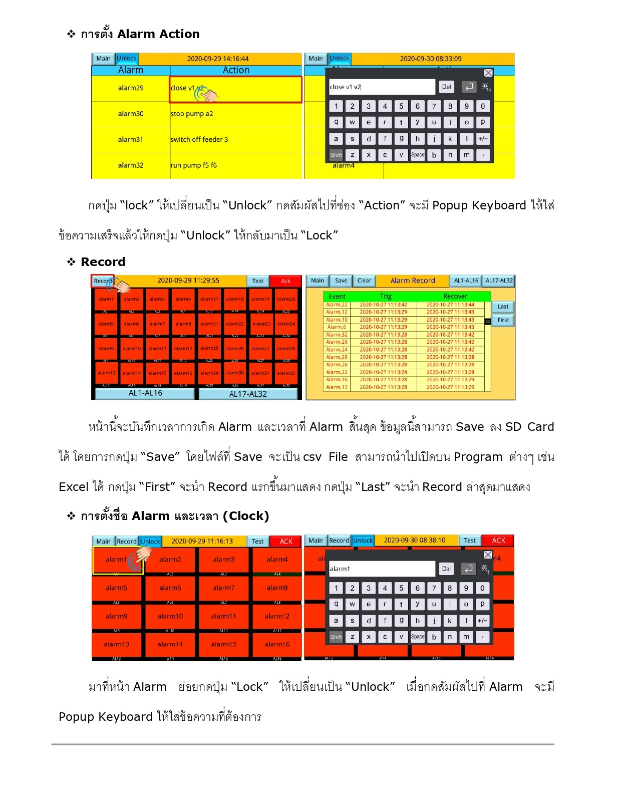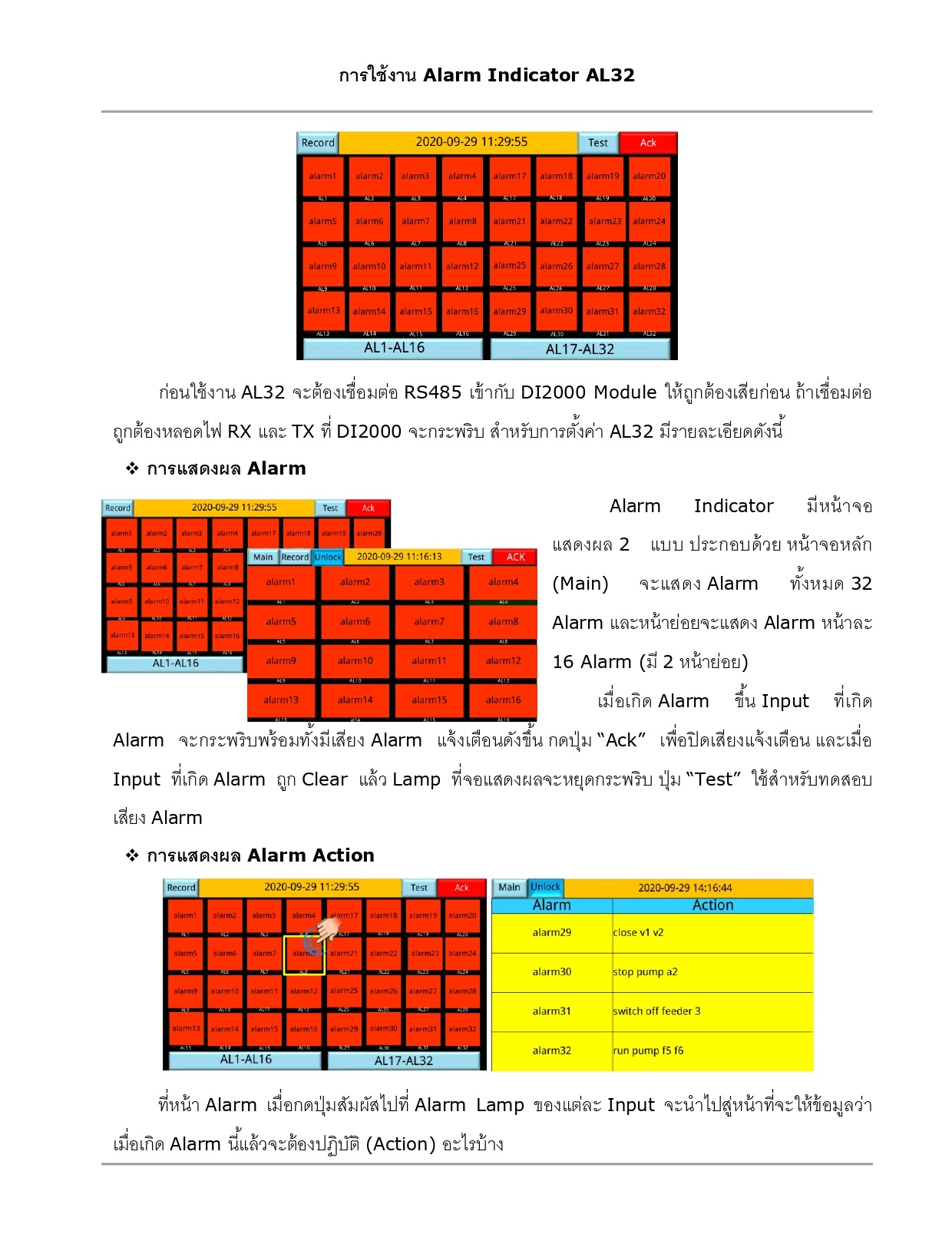| ไฮไลท์ | Alarm Indicator AL32 เป็นจอ Touch Screen ที่แสดงตำแหน่งการเกิด Alarm พร้อมทั้งมีเสียง Alarm แจ้งเตือน ผู้ใช้สามารถ Program ชื่อของ Alarm แต่ละ Input ได้ ข้อมูลเวลาการเกิด Alarm จะถูกเก็บไว้ใน Memory สามารถดูย้อนหลังได้ และ สามารถบันทึกลงใน SD Card เป็นไฟล์ csv ซึ่งใช้โปรแกรม เช่น Excel เปิดบนเครื่องคอมพิวเตอร์ได้ ______________________________________________________ Product : - 7” Touch Screen Panel - Max 32 Alarms Input - Record Alarm Data in SD Card - 2-Wire RS485 Wiring ______________________________________________________ >>> หมายเหตุ : • ราคารวมภาษีมูลค่าเพิ่มแล้ว • กรณีมีสินค้าสต๊อกระยะจัดส่งสินค้าภายใน 4-7 วันทำการ • กรณีสินค้าหมดระยะจัดส่งสินค้าภายใน 3-4 สัปดาห์ • ฟรีค่าบริการจัดส่งสินค้า โดยบริษัทขนส่งเอกชน เช่น ปณ. ด่วน EMS, KEX Express, Flash Express เท่านั้น • สามารถเช็คสต๊อกสินค้าก่อนทำการสั่งซื้อได้ที่ @Line ID : kdnautomation • ลูกค้าตรวจสอบ Spec สินค้าก่อนทำการสั่งซื้อทุกครั้ง กรณีสั่งซื้อแล้วไม่รับเปลี่ยน-คืน ______________________________________________________ >>> ติดต่อสอบถามข้อมูลเพิ่มเติม : • Line Official : kdnautomation • E-Mail: kdnautomation@gmail.com • Tel : 082-550-3096, 02-023-3038 • Website : www.kdnautomation.co.th • เวลาทำการบริษัท วันจันทร์ - วันศุกร์ เวลา 08.00 - 17.00 น. ( หยุดวันนักขัตฤกษ์ ) ______________________________________________________ >>> บริการติดตั้ง : • ทางบริษัทจำหน่ายอุปกรณ์อิเล็กทรอนิกส์ ออกแบบ ติดตั้งและซ่อมแซม ปรับปรุงเครื่องจักรในโรงงานอุตสาหกรรม รวมถึงการให้บริการเขียนโปรแกรม และพัฒนาระบบควบคุมอัตโนมัติแบบครบวงจร ทั้งนี้ลูกค้าสามารถส่งรายละเอียด มาได้ที่ E-mail : kdnautomation@gmail.com เพื่อประเมินราคา |