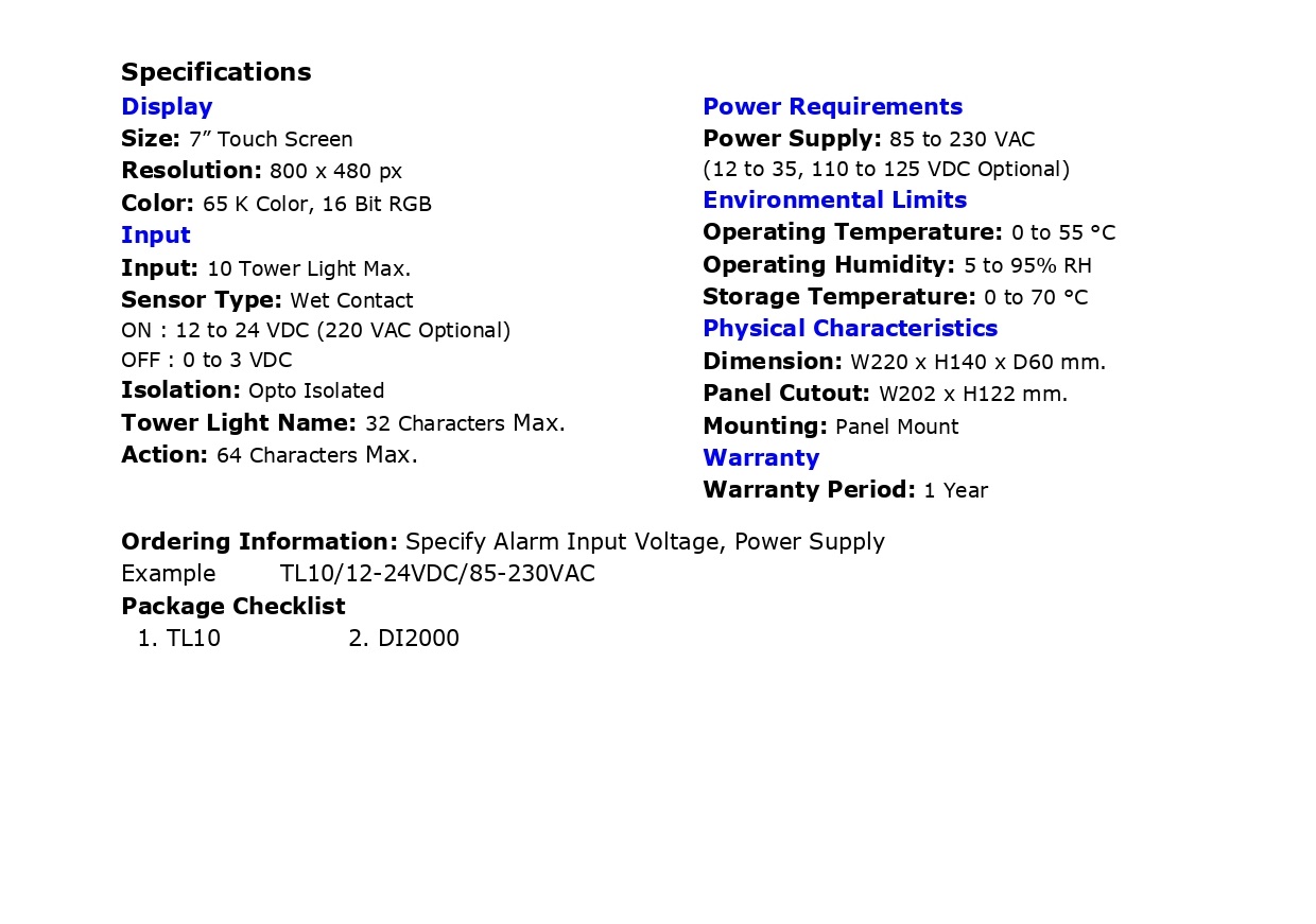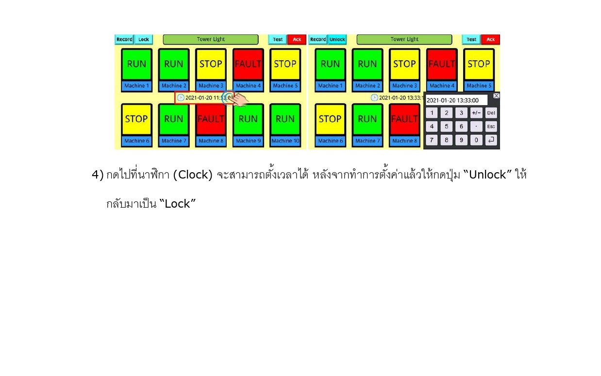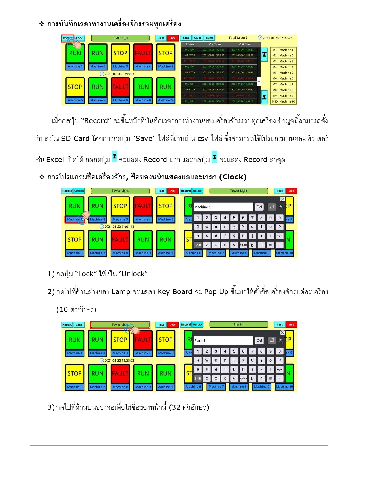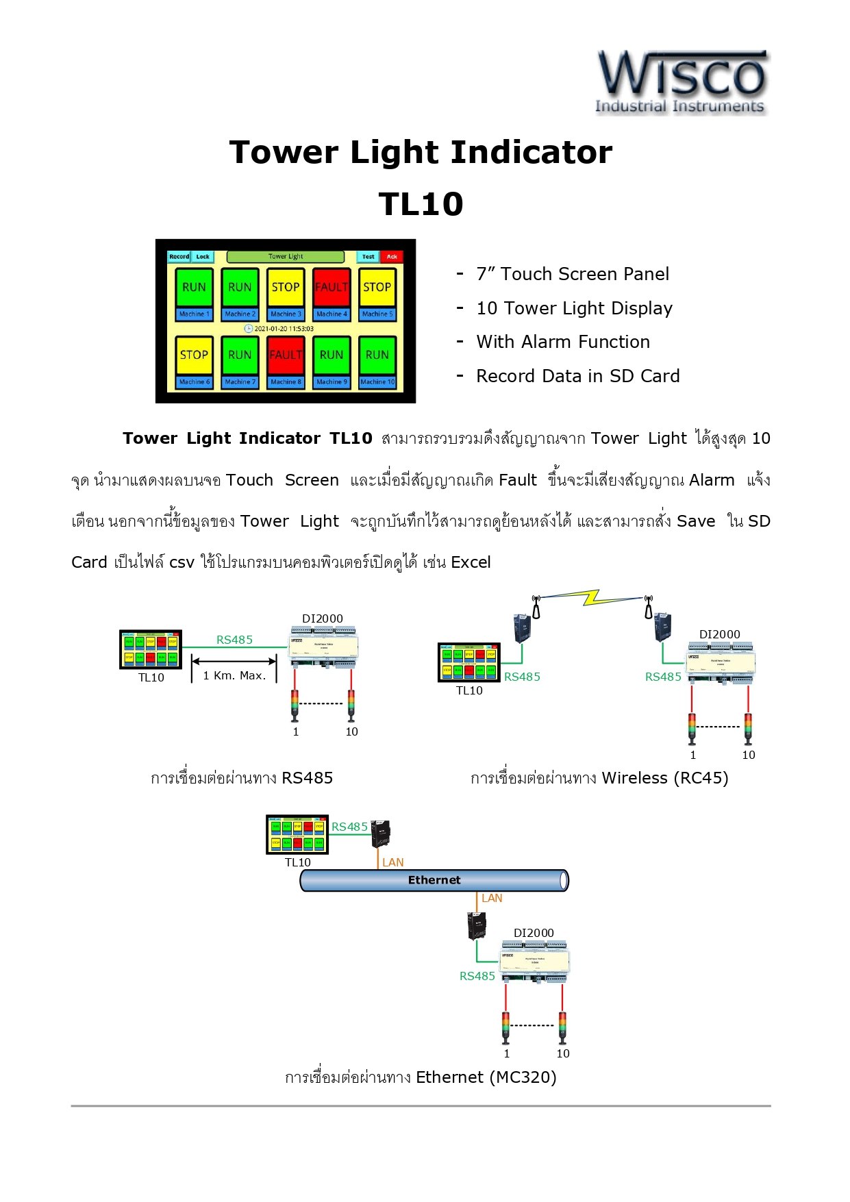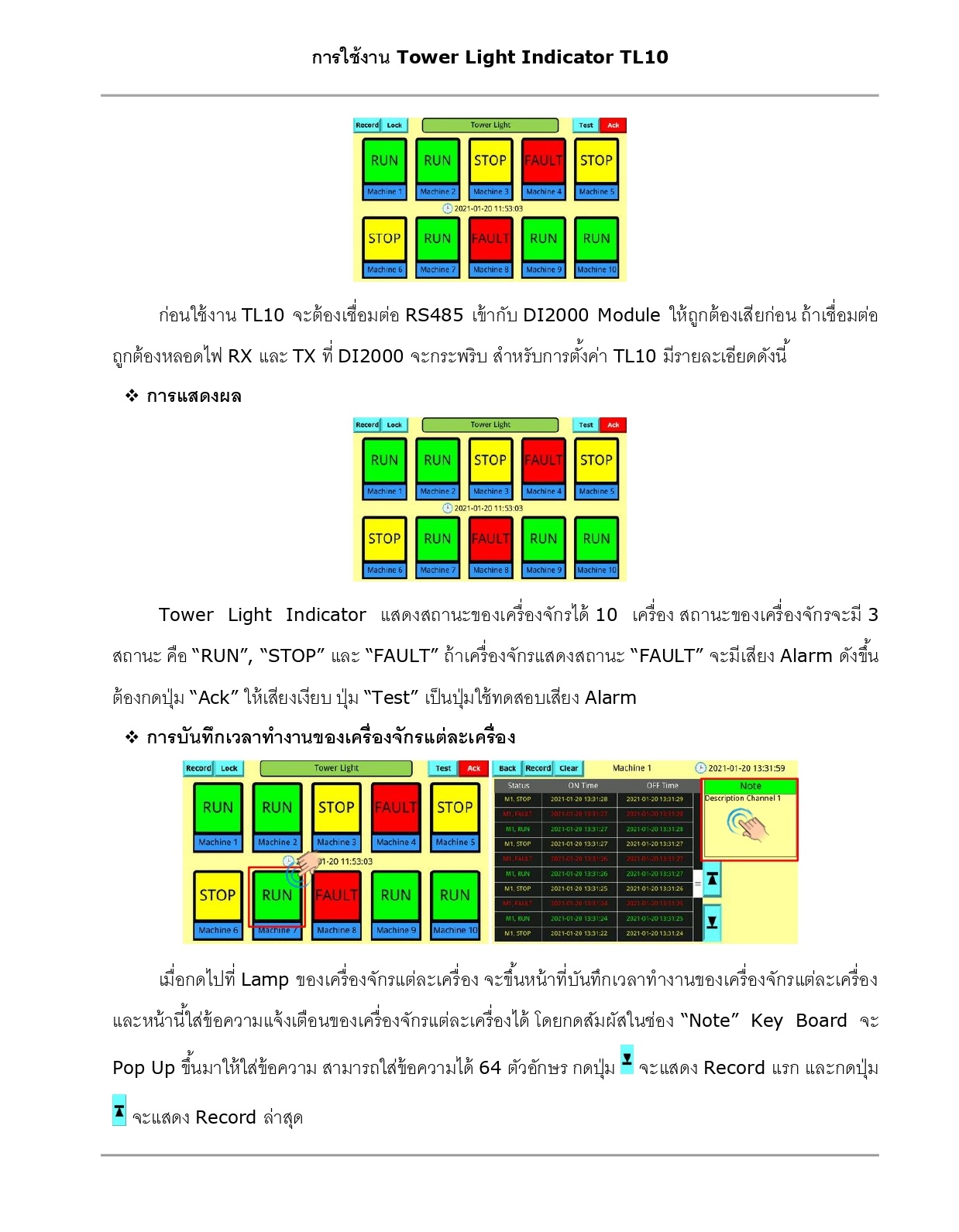 | ไฮไลท์ | Tower Light Indicator TL10 สามารถรวบรวมดึงสัญญาณจาก Tower Light ได้สูงสุด 10 จุด นำมาแสดงผลบนจอ Touch Screen และเมื่อมีสัญญาณเกิด Fault ขึ้นจะมีเสียงสัญญาณ Alarm แจ้งเตือน นอกจากนี้ข้อมูลของ Tower Light จะถูกบันทึกไว้สามารถดูย้อนหลังได้ และสามารถสั่ง Save ใน SD Card เป็นไฟล์ csv ใช้โปรแกรมบนคอมพิวเตอร์เปิดดูได้ เช่น Excel ______________________________________________________ Product : - 7” Touch Screen Panel - 10 Tower Light Display - With Alarm Function - Record Data in SD Card ______________________________________________________ >>> หมายเหตุ : • ราคารวมภาษีมูลค่าเพิ่มแล้ว • กรณีมีสินค้าสต๊อกระยะจัดส่งสินค้าภายใน 4-7 วันทำการ • กรณีสินค้าหมดระยะจัดส่งสินค้าภายใน 3-4 สัปดาห์ • ฟรีค่าบริการจัดส่งสินค้า โดยบริษัทขนส่งเอกชน เช่น ปณ. ด่วน EMS, KEX Express, Flash Express เท่านั้น • สามารถเช็คสต๊อกสินค้าก่อนทำการสั่งซื้อได้ที่ @Line ID : kdnautomation • ลูกค้าตรวจสอบ Spec สินค้าก่อนทำการสั่งซื้อทุกครั้ง กรณีสั่งซื้อแล้วไม่รับเปลี่ยน-คืน ______________________________________________________ >>> ติดต่อสอบถามข้อมูลเพิ่มเติม : • Line Official : kdnautomation • E-Mail: kdnautomation@gmail.com • Tel : 082-550-3096, 02-023-3038 • Website : www.kdnautomation.co.th • เวลาทำการบริษัท วันจันทร์ - วันศุกร์ เวลา 08.00 - 17.00 น. ( หยุดวันนักขัตฤกษ์ ) ______________________________________________________ >>> บริการติดตั้ง : • ทางบริษัทจำหน่ายอุปกรณ์อิเล็กทรอนิกส์ ออกแบบ ติดตั้งและซ่อมแซม ปรับปรุงเครื่องจักรในโรงงานอุตสาหกรรม รวมถึงการให้บริการเขียนโปรแกรม และพัฒนาระบบควบคุมอัตโนมัติแบบครบวงจร ทั้งนี้ลูกค้าสามารถส่งรายละเอียด มาได้ที่ E-mail : kdnautomation@gmail.com เพื่อประเมินราคา |