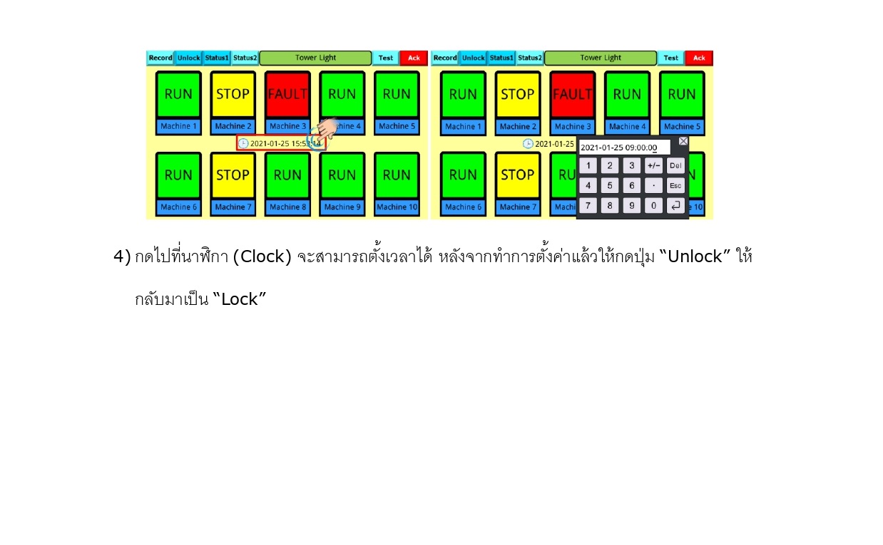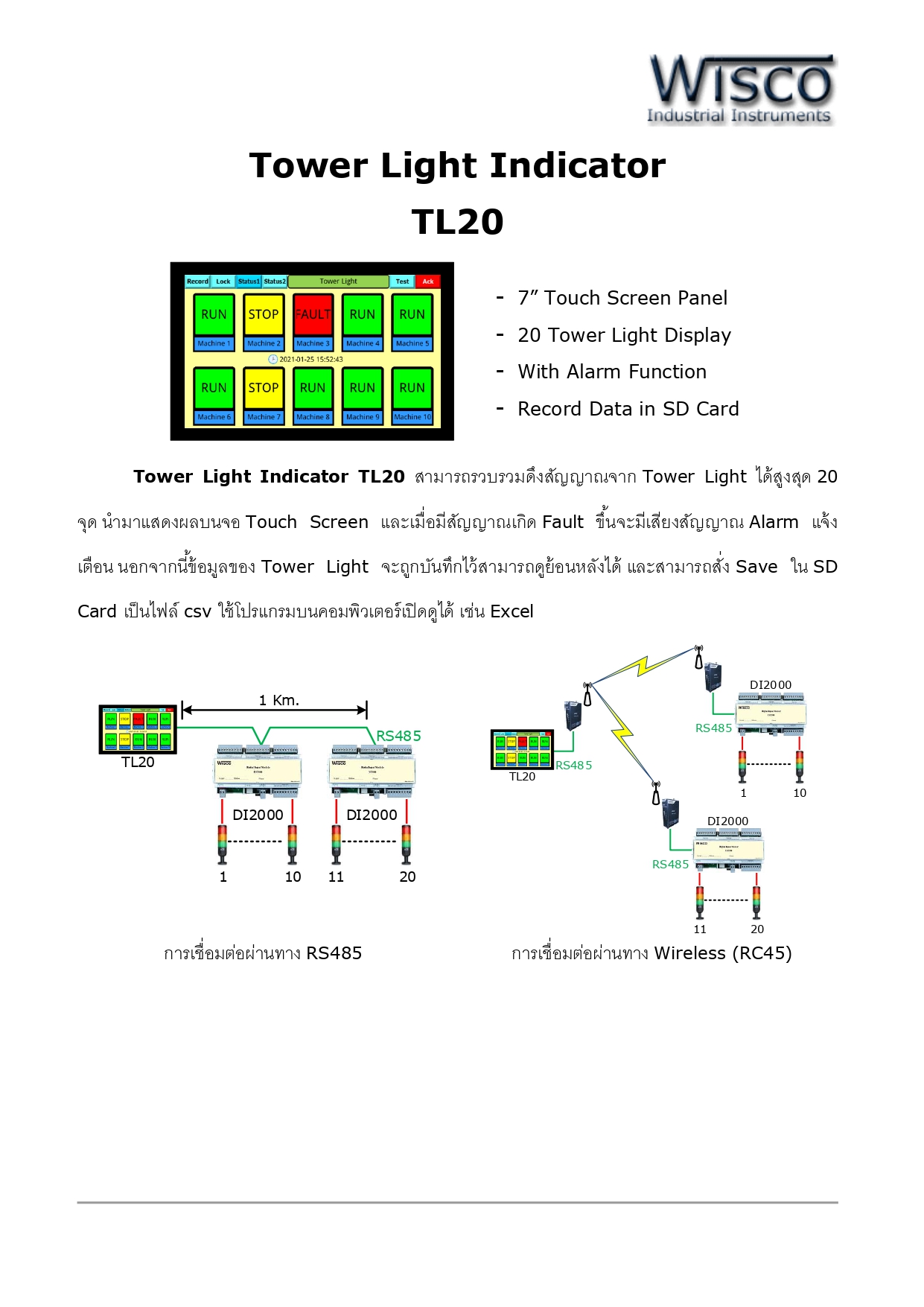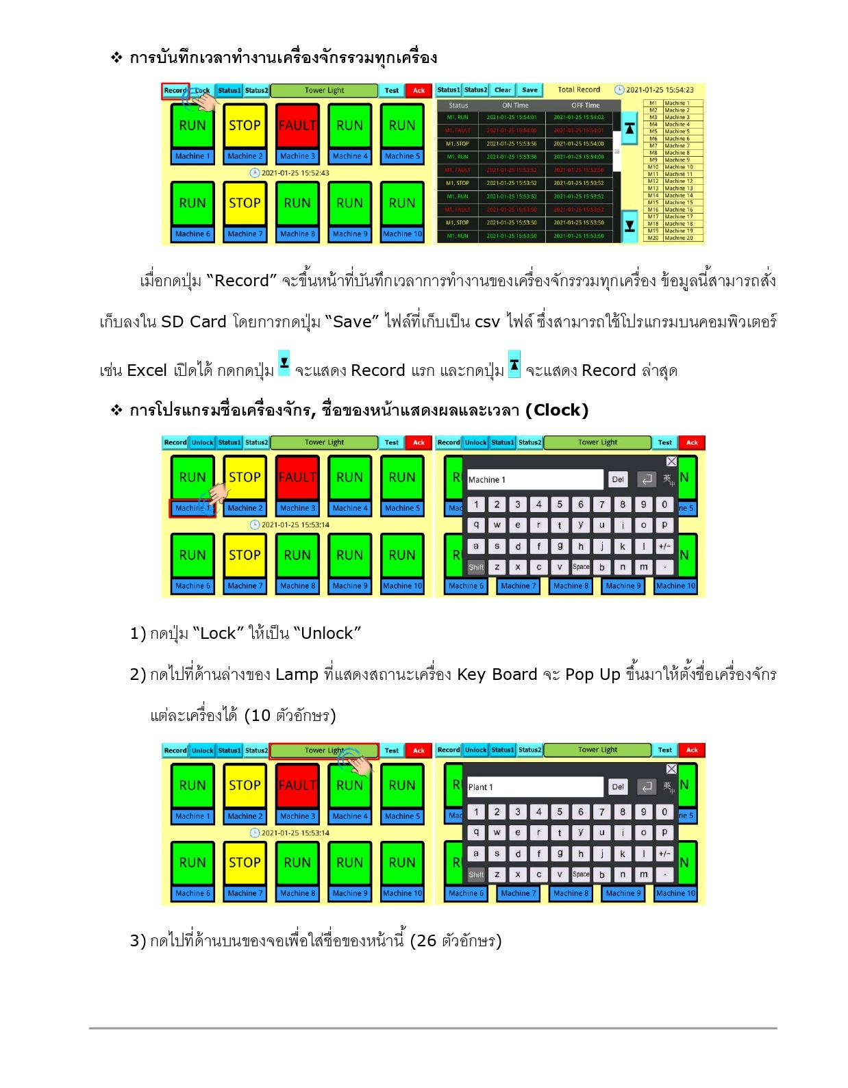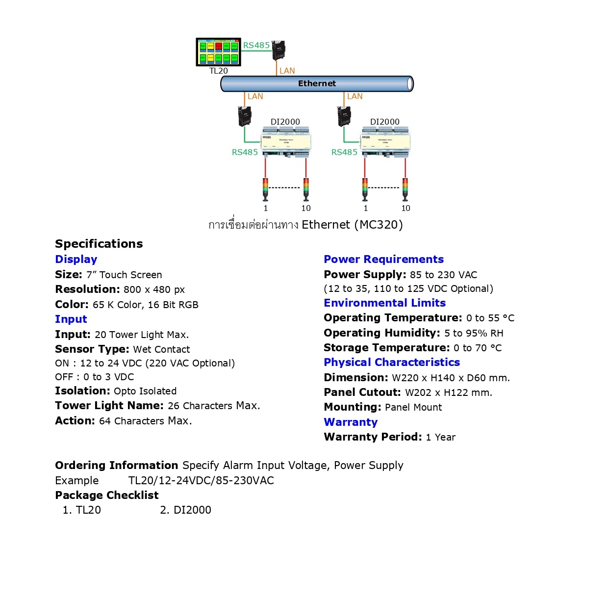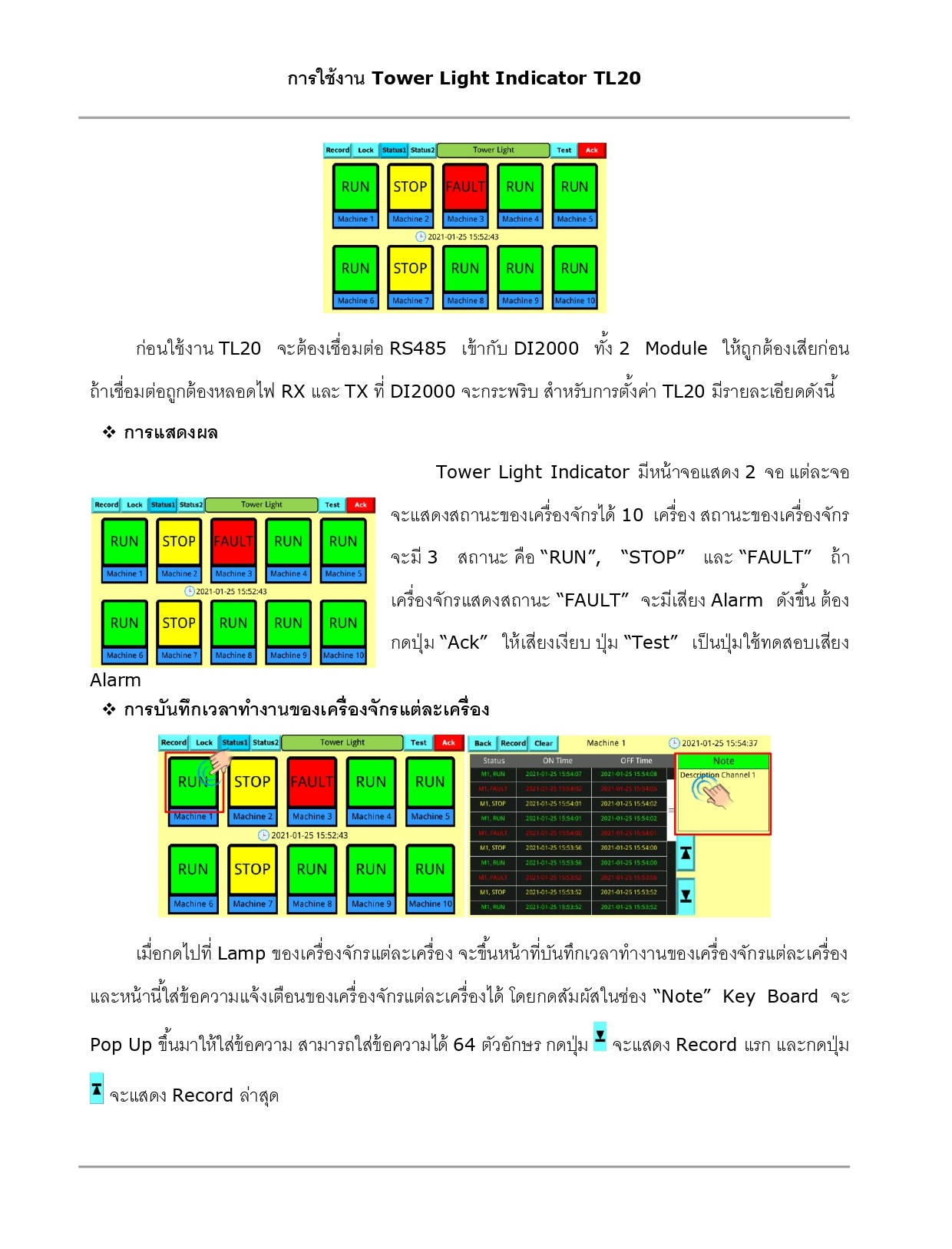 | ไฮไลท์ | Tower Light Indicator TL20 สามารถรวบรวมดึงสัญญาณจาก Tower Light ได้สูงสุด 20 จุด นำมาแสดงผลบนจอ Touch Screen และเมื่อมีสัญญาณเกิด Fault ขึ้นจะมีเสียงสัญญาณ Alarm แจ้งเตือน นอกจากนี้ข้อมูลของ Tower Light จะถูกบันทึกไว้สามารถดูย้อนหลังได้ และสามารถสั่ง Save ใน SD Card เป็นไฟล์ csv ใช้โปรแกรมบนคอมพิวเตอร์เปิดดูได้ เช่น Excel ______________________________________________________ Product : - 7” Touch Screen Panel - 20 Tower Light Display - With Alarm Function - Record Data in SD Card ______________________________________________________ >>> หมายเหตุ : • ราคารวมภาษีมูลค่าเพิ่มแล้ว • กรณีมีสินค้าสต๊อกระยะจัดส่งสินค้าภายใน 4-7 วันทำการ • กรณีสินค้าหมดระยะจัดส่งสินค้าภายใน 3-4 สัปดาห์ • ฟรีค่าบริการจัดส่งสินค้า โดยบริษัทขนส่งเอกชน เช่น ปณ. ด่วน EMS, KEX Express, Flash Express เท่านั้น • สามารถเช็คสต๊อกสินค้าก่อนทำการสั่งซื้อได้ที่ @Line ID : kdnautomation • ลูกค้าตรวจสอบ Spec สินค้าก่อนทำการสั่งซื้อทุกครั้ง กรณีสั่งซื้อแล้วไม่รับเปลี่ยน-คืน ______________________________________________________ >>> ติดต่อสอบถามข้อมูลเพิ่มเติม : • Line Official : kdnautomation • E-Mail: kdnautomation@gmail.com • Tel : 082-550-3096, 02-023-3038 • Website : www.kdnautomation.co.th • เวลาทำการบริษัท วันจันทร์ - วันศุกร์ เวลา 08.00 - 17.00 น. ( หยุดวันนักขัตฤกษ์ ) ______________________________________________________ >>> บริการติดตั้ง : • ทางบริษัทจำหน่ายอุปกรณ์อิเล็กทรอนิกส์ ออกแบบ ติดตั้งและซ่อมแซม ปรับปรุงเครื่องจักรในโรงงานอุตสาหกรรม รวมถึงการให้บริการเขียนโปรแกรม และพัฒนาระบบควบคุมอัตโนมัติแบบครบวงจร ทั้งนี้ลูกค้าสามารถส่งรายละเอียด มาได้ที่ E-mail : kdnautomation@gmail.com เพื่อประเมินราคา |