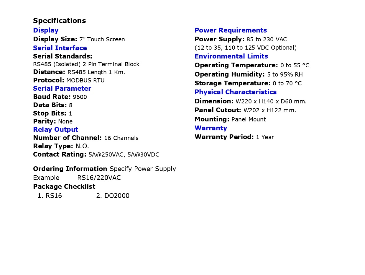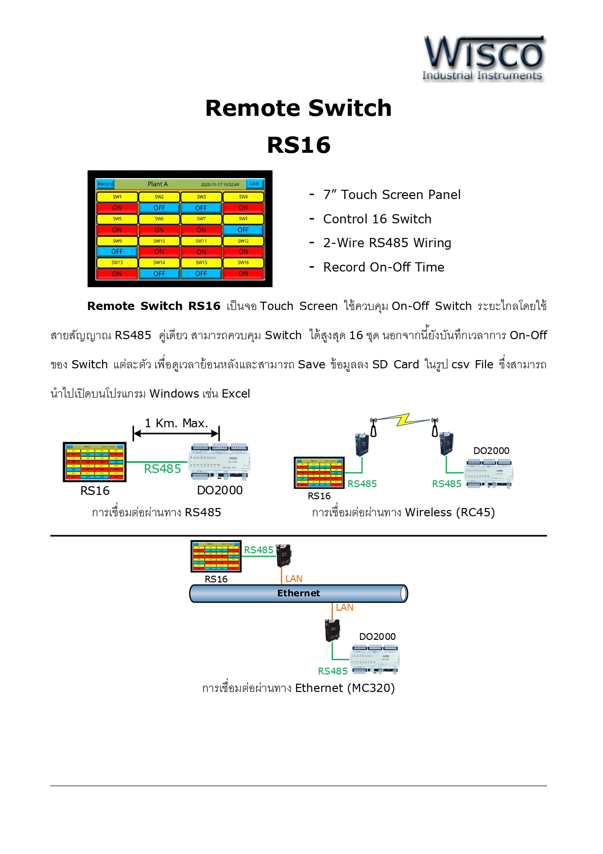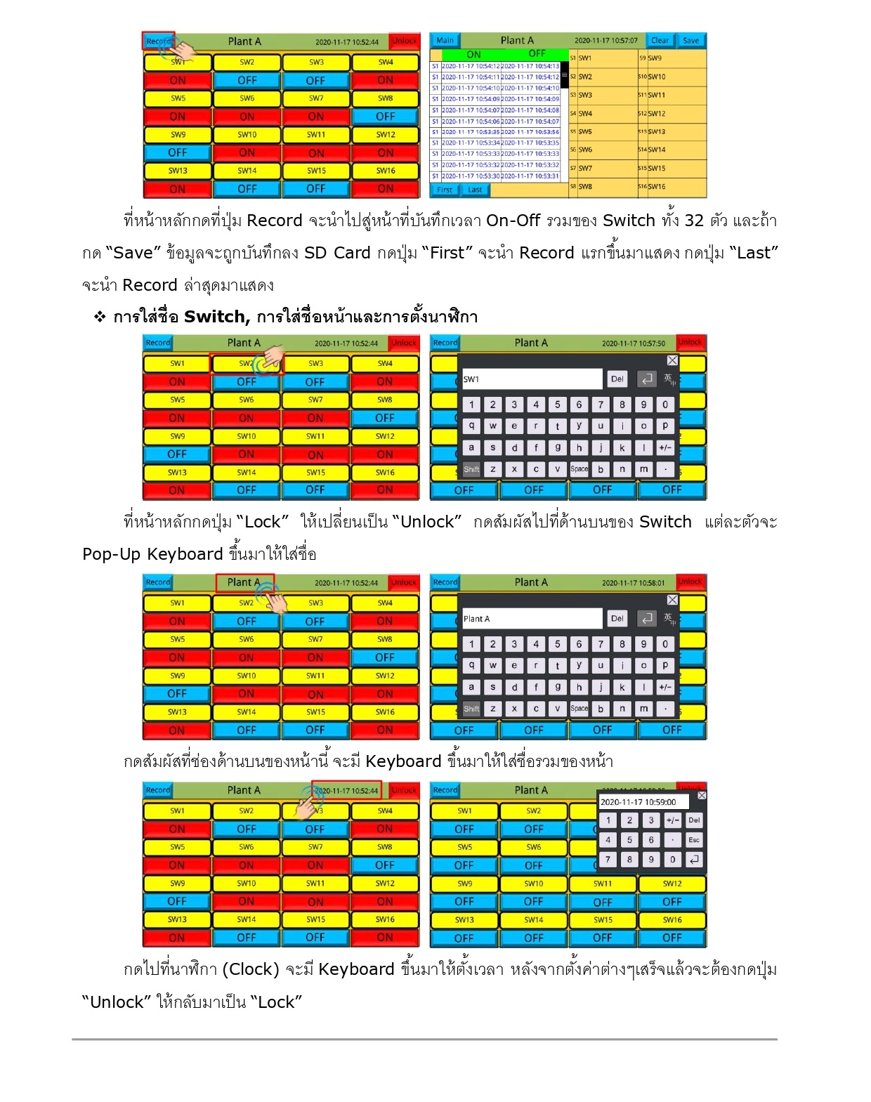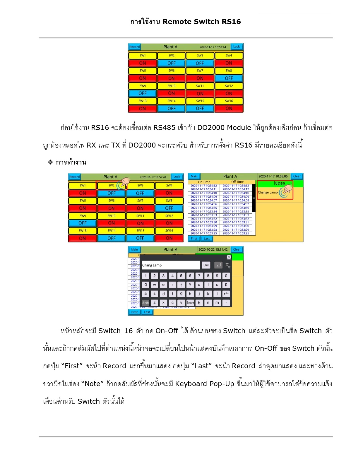 | ไฮไลท์ | Remote Switch RS16 เป็นจอ Touch Screen ใช้ควบคุม On-Off Switch ระยะไกลโดยใช้สายสัญญาณ RS485 คู่เดียว สามารถควบคุม Switch ได้สูงสุด 16 ชุด นอกจากนี้ยังบันทึกเวลาการ On-Off ของ Switch แต่ละตัว เพื่อดูเวลาย้อนหลังและสามารถ Save ข้อมูลลง SD Card ในรูป csv File ซึ่งสามารถนำไปเปิดบนโปรแกรม Windows เช่น Excel ______________________________________________________ Product : - 7” Touch Screen Panel - Control 16 Switch - 2-Wire RS485 Wiring - Record On-Off Time ______________________________________________________ >>> หมายเหตุ : • ราคารวมภาษีมูลค่าเพิ่มแล้ว • กรณีมีสินค้าสต๊อกระยะจัดส่งสินค้าภายใน 4-7 วันทำการ • กรณีสินค้าหมดระยะจัดส่งสินค้าภายใน 3-4 สัปดาห์ • ฟรีค่าบริการจัดส่งสินค้า โดยบริษัทขนส่งเอกชน เช่น ปณ. ด่วน EMS, KEX Express, Flash Express เท่านั้น • สามารถเช็คสต๊อกสินค้าก่อนทำการสั่งซื้อได้ที่ @Line ID : kdnautomation • ลูกค้าตรวจสอบ Spec สินค้าก่อนทำการสั่งซื้อทุกครั้ง กรณีสั่งซื้อแล้วไม่รับเปลี่ยน-คืน ______________________________________________________ >>> ติดต่อสอบถามข้อมูลเพิ่มเติม : • Line Official : kdnautomation • E-Mail: kdnautomation@gmail.com • Tel : 082-550-3096, 02-023-3038 • Website : www.kdnautomation.co.th • เวลาทำการบริษัท วันจันทร์ - วันศุกร์ เวลา 08.00 - 17.00 น. ( หยุดวันนักขัตฤกษ์ ) ______________________________________________________ >>> บริการติดตั้ง : • ทางบริษัทจำหน่ายอุปกรณ์อิเล็กทรอนิกส์ ออกแบบ ติดตั้งและซ่อมแซม ปรับปรุงเครื่องจักรในโรงงานอุตสาหกรรม รวมถึงการให้บริการเขียนโปรแกรม และพัฒนาระบบควบคุมอัตโนมัติแบบครบวงจร ทั้งนี้ลูกค้าสามารถส่งรายละเอียด มาได้ที่ E-mail : kdnautomation@gmail.com เพื่อประเมินราคา |