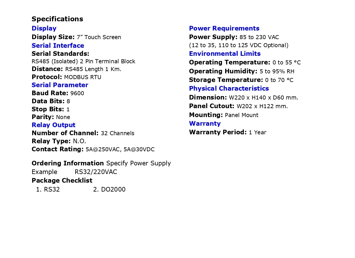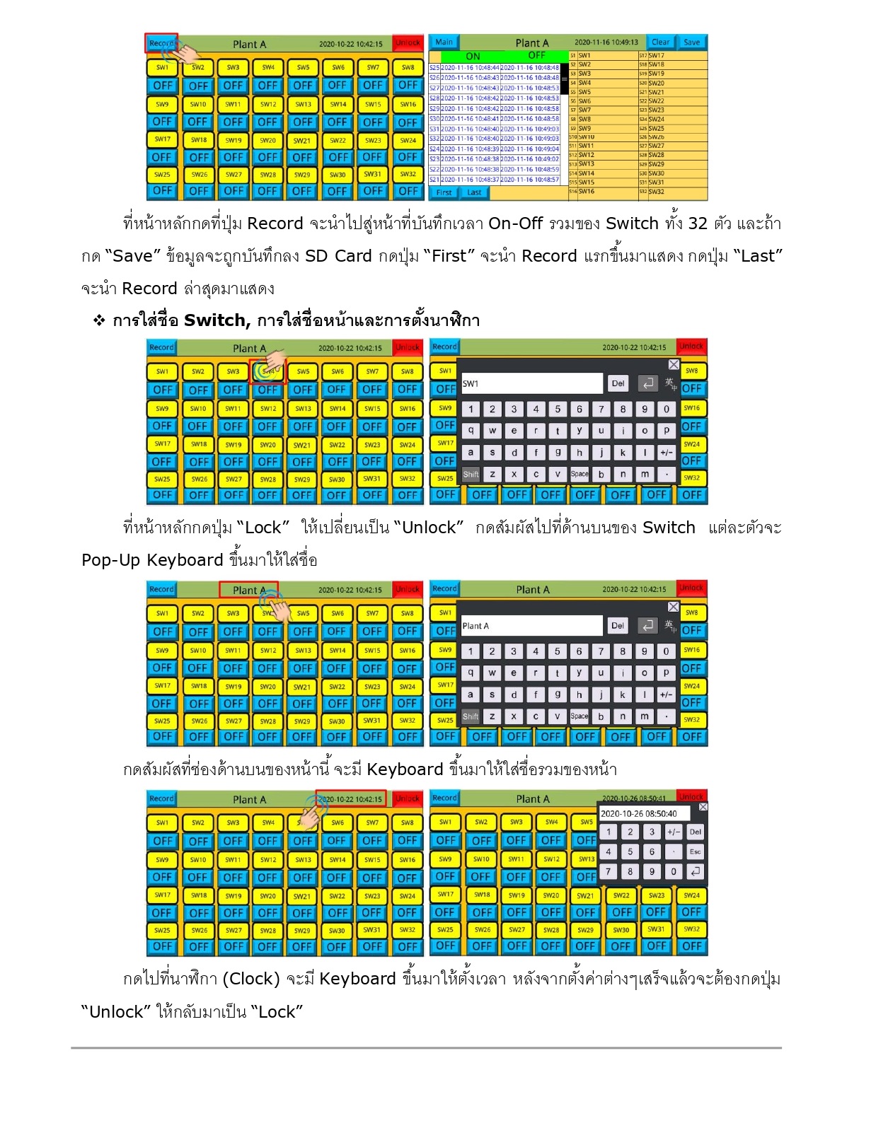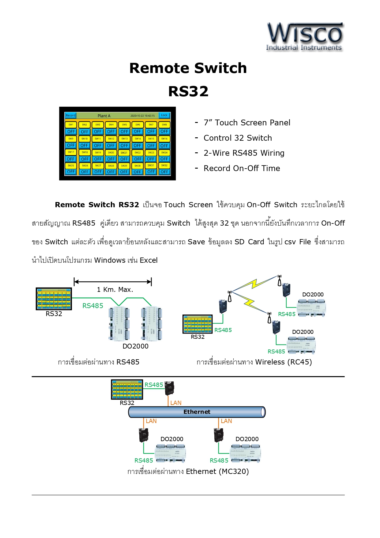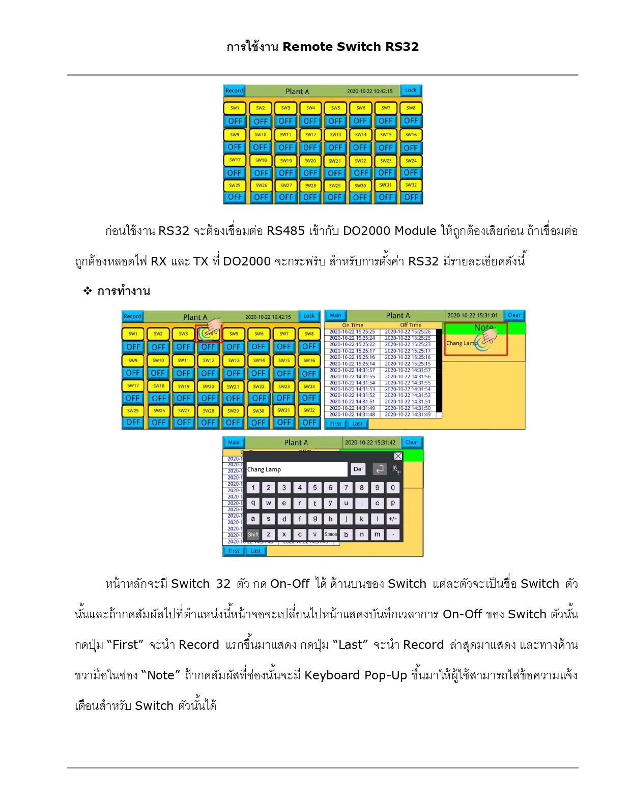 | ไฮไลท์ | Remote Switch RS32 เป็นจอ Touch Screen ใช้ควบคุม On-Off Switch ระยะไกลโดยใช้สายสัญญาณ RS485 คู่เดียว สามารถควบคุม Switch ได้สูงสุด 32 ชุด นอกจากนี้ยังบันทึกเวลาการ On-Off ของ Switch แต่ละตัว เพื่อดูเวลาย้อนหลังและสามารถ Save ข้อมูลลง SD Card ในรูป csv File ซึ่งสามารถนำไปเปิดบนโปรแกรม Windows เช่น Excel ______________________________________________________ Product : - 7” Touch Screen Panel - Control 32 Switch - 2-Wire RS485 Wiring - Record On-Off Time ______________________________________________________ >>> หมายเหตุ : • ราคารวมภาษีมูลค่าเพิ่มแล้ว • กรณีมีสินค้าสต๊อกระยะจัดส่งสินค้าภายใน 4-7 วันทำการ • กรณีสินค้าหมดระยะจัดส่งสินค้าภายใน 3-4 สัปดาห์ • ฟรีค่าบริการจัดส่งสินค้า โดยบริษัทขนส่งเอกชน เช่น ปณ. ด่วน EMS, KEX Express, Flash Express เท่านั้น • สามารถเช็คสต๊อกสินค้าก่อนทำการสั่งซื้อได้ที่ @Line ID : kdnautomation • ลูกค้าตรวจสอบ Spec สินค้าก่อนทำการสั่งซื้อทุกครั้ง กรณีสั่งซื้อแล้วไม่รับเปลี่ยน-คืน ______________________________________________________ >>> ติดต่อสอบถามข้อมูลเพิ่มเติม : • Line Official : kdnautomation • E-Mail: kdnautomation@gmail.com • Tel : 082-550-3096, 02-023-3038 • Website : www.kdnautomation.co.th • เวลาทำการบริษัท วันจันทร์ - วันศุกร์ เวลา 08.00 - 17.00 น. ( หยุดวันนักขัตฤกษ์ ) ______________________________________________________ >>> บริการติดตั้ง : • ทางบริษัทจำหน่ายอุปกรณ์อิเล็กทรอนิกส์ ออกแบบ ติดตั้งและซ่อมแซม ปรับปรุงเครื่องจักรในโรงงานอุตสาหกรรม รวมถึงการให้บริการเขียนโปรแกรม และพัฒนาระบบควบคุมอัตโนมัติแบบครบวงจร ทั้งนี้ลูกค้าสามารถส่งรายละเอียด มาได้ที่ E-mail : kdnautomation@gmail.com เพื่อประเมินราคา |